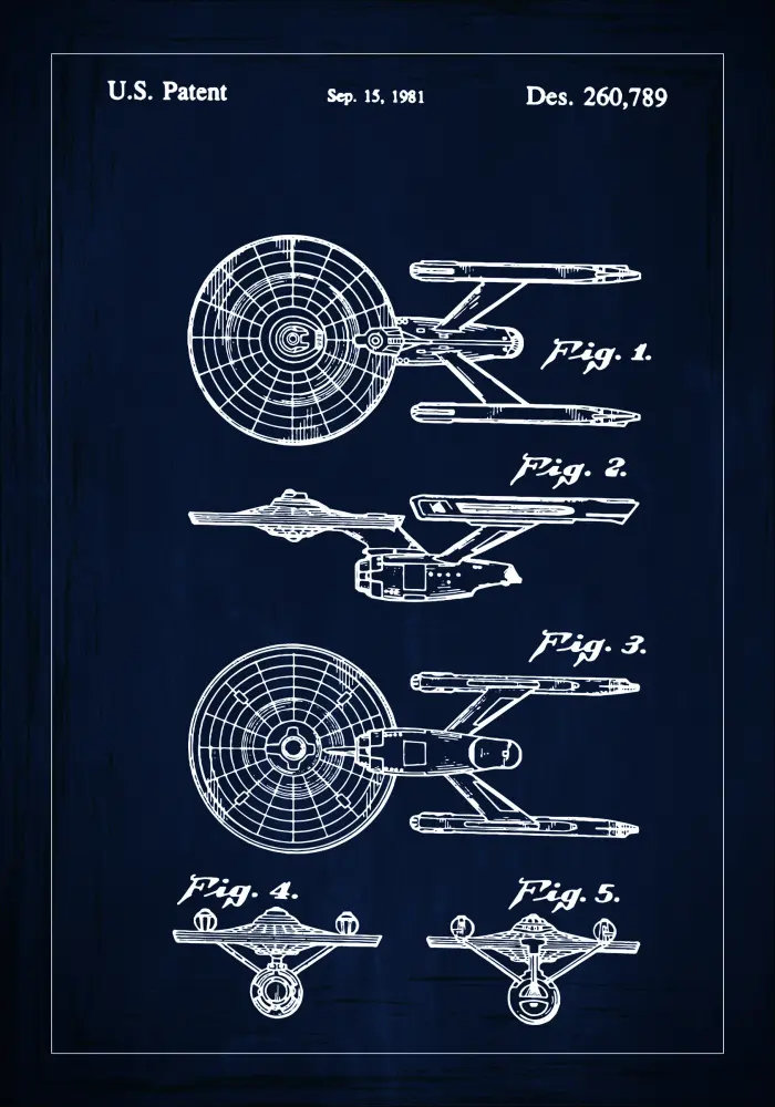 Este póster de patente reproduce el diseño de la nave espacial Enterprise de Star Trek, con el número de patente Des. 260,789 fechado el 15 de septiembre de 1981. El dibujo detallado de la patente es un ejemplo de la innovación temprana inspirada en la ciencia ficción, una visión de la futura exploración del cosmos. Las ilustraciones muestran la nave desde diferentes ángulos y posiciones, proporcionando una comprensión profunda de su estructura única y compleja. El póster de patente es una expresión del esfuerzo de la humanidad por alcanzar las estrellas y una decoración perfecta para todos aquellos que sueñan con aventuras interestelares.