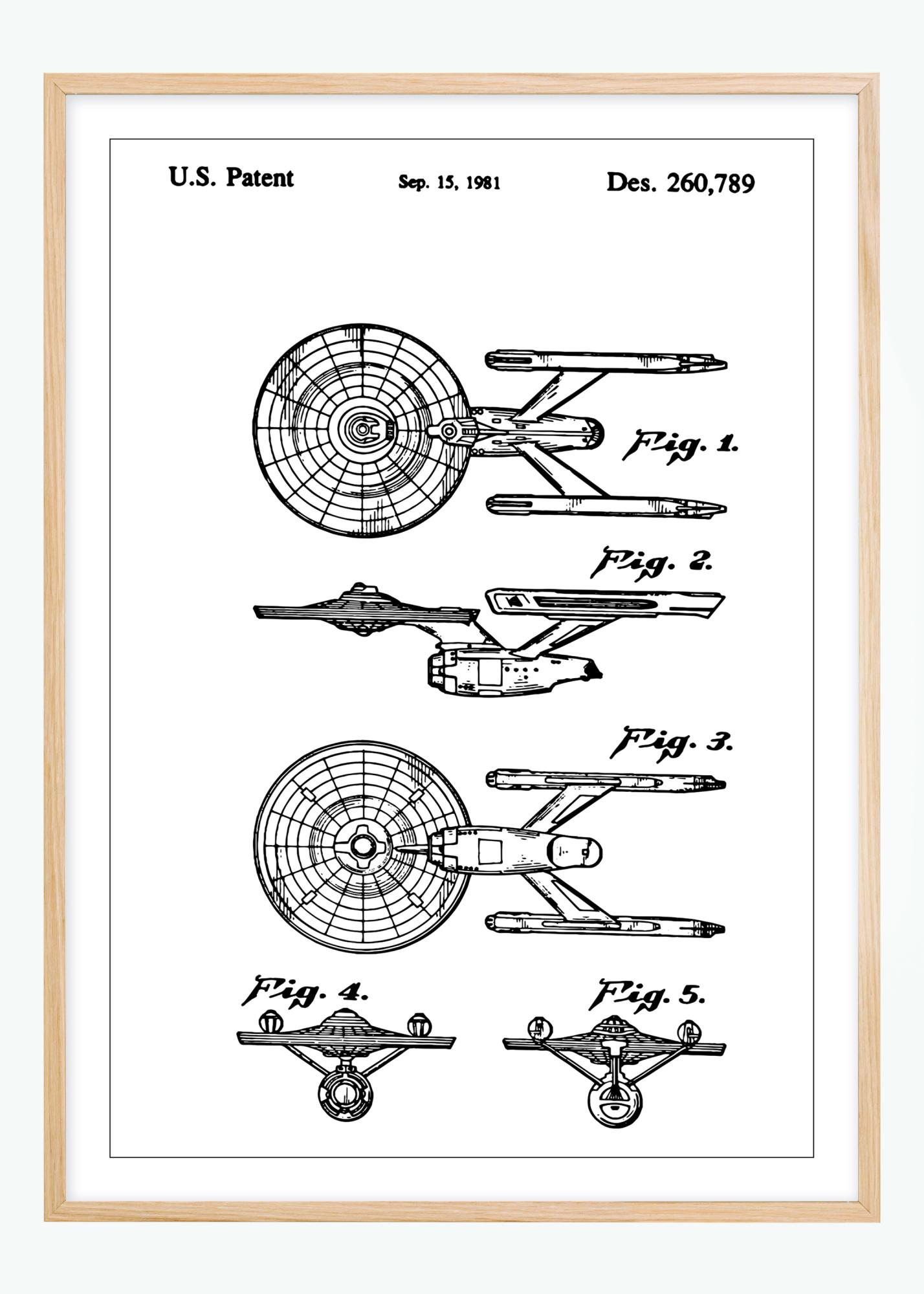 Este póster de patente muestra un dibujo detallado del Enterprise de StarTrek, otorgado el 15 de septiembre de 1981 bajo el número Des. 260,789. Las cinco figuras ilustran el ventilador desde diferentes ángulos, proporcionando una vista completa de su construcción y diseño. Los dibujos destacan la estructura técnica y la ejecución estética de este aparato cotidiano.