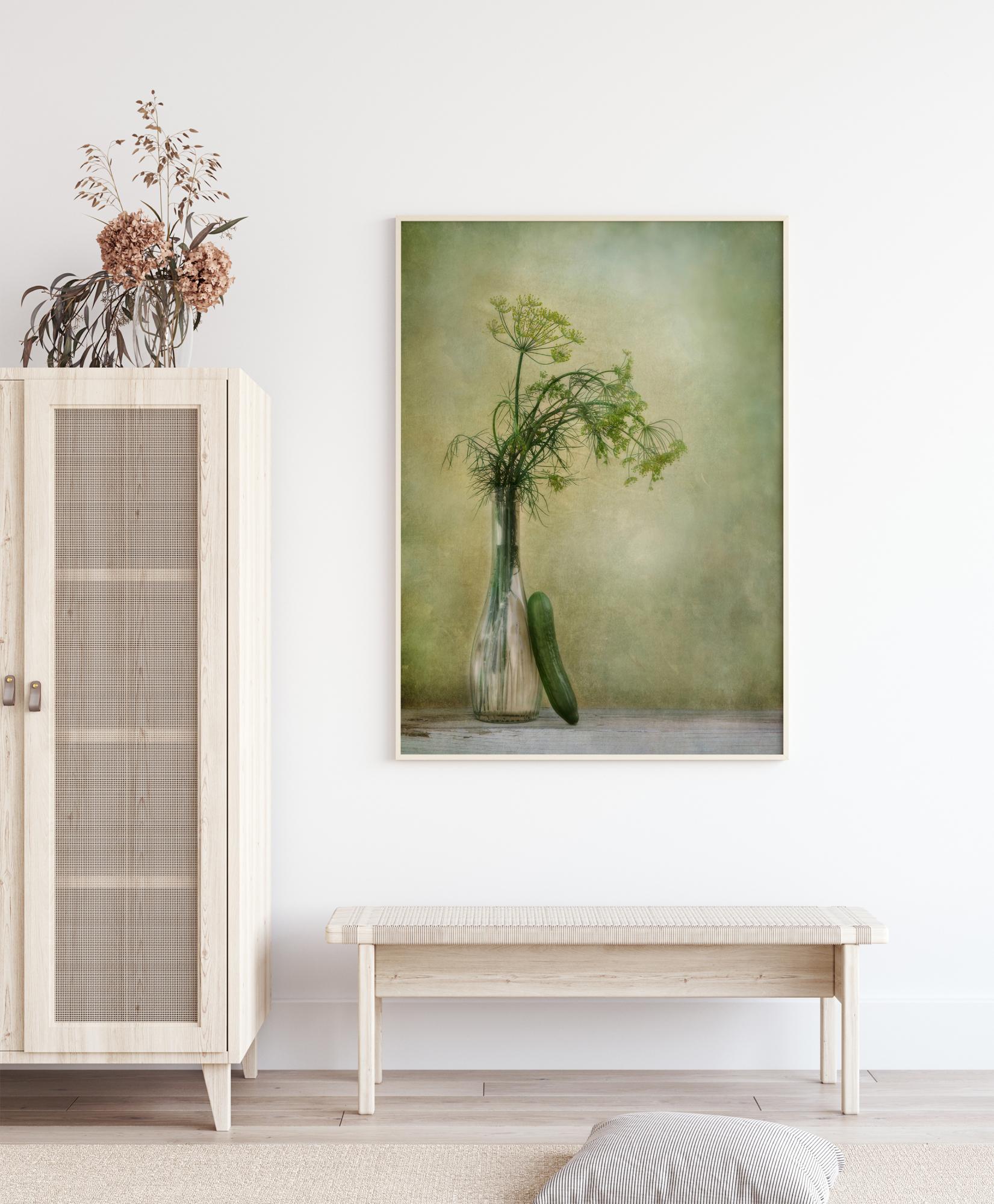 Un póster de verduras con eneldo y un pepino y una pared suave de color verde y amarillo. El jarrón de vidrio sostiene el eneldo mientras el pepino se inclina hacia el recipiente. Las acuarelas suaves en el fondo son más claras alrededor de las hojas, pero más oscuras en los bordes. Cuelga esta obra en una cocina para una sensación dulce y vegetal.