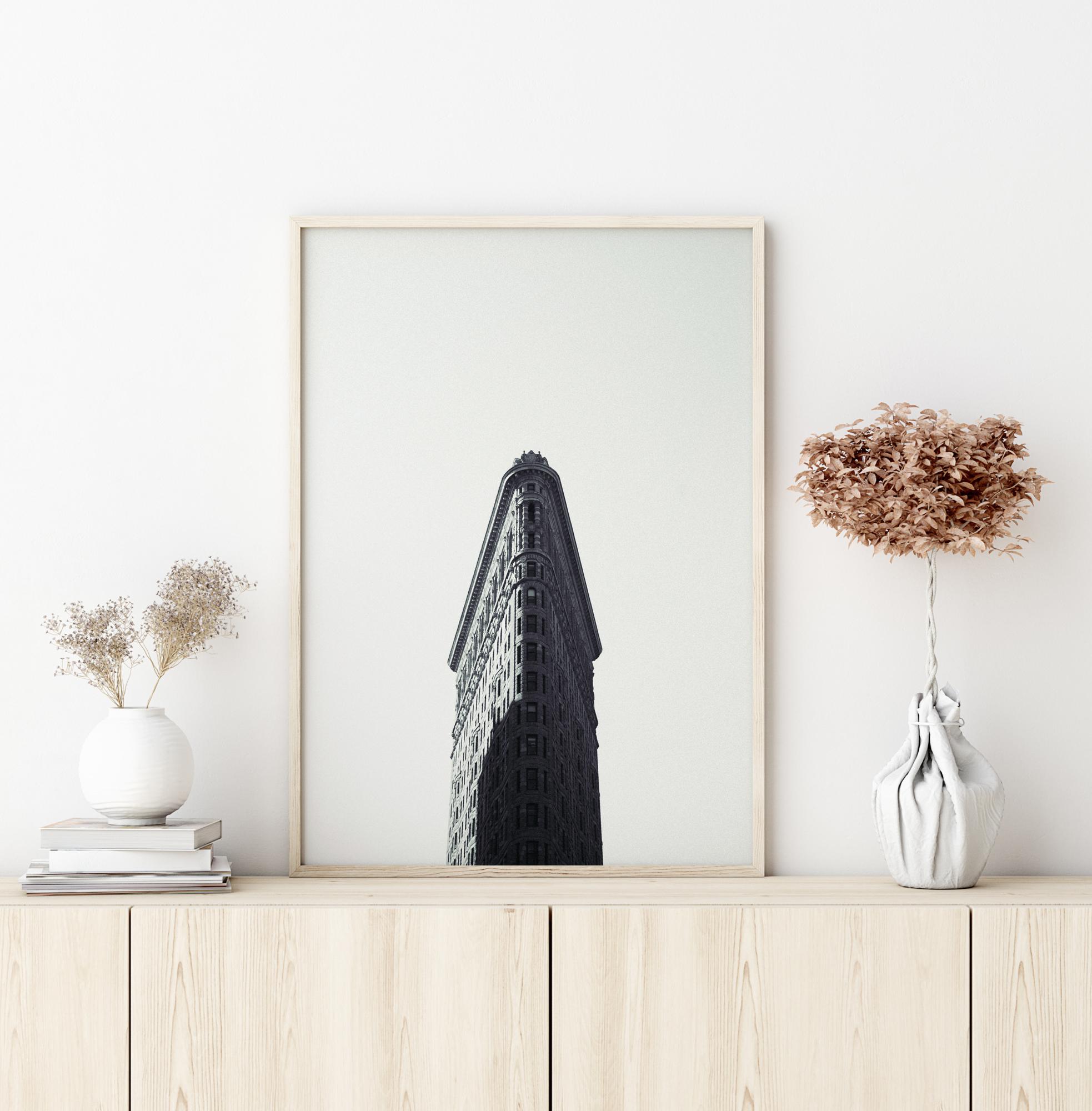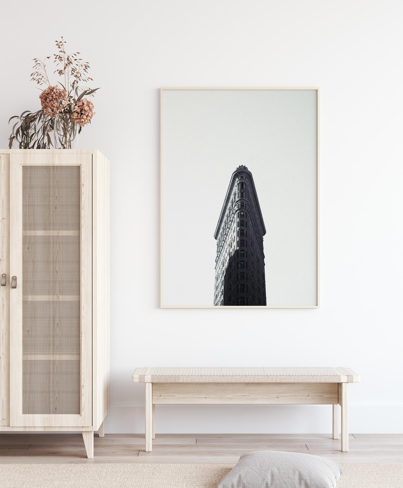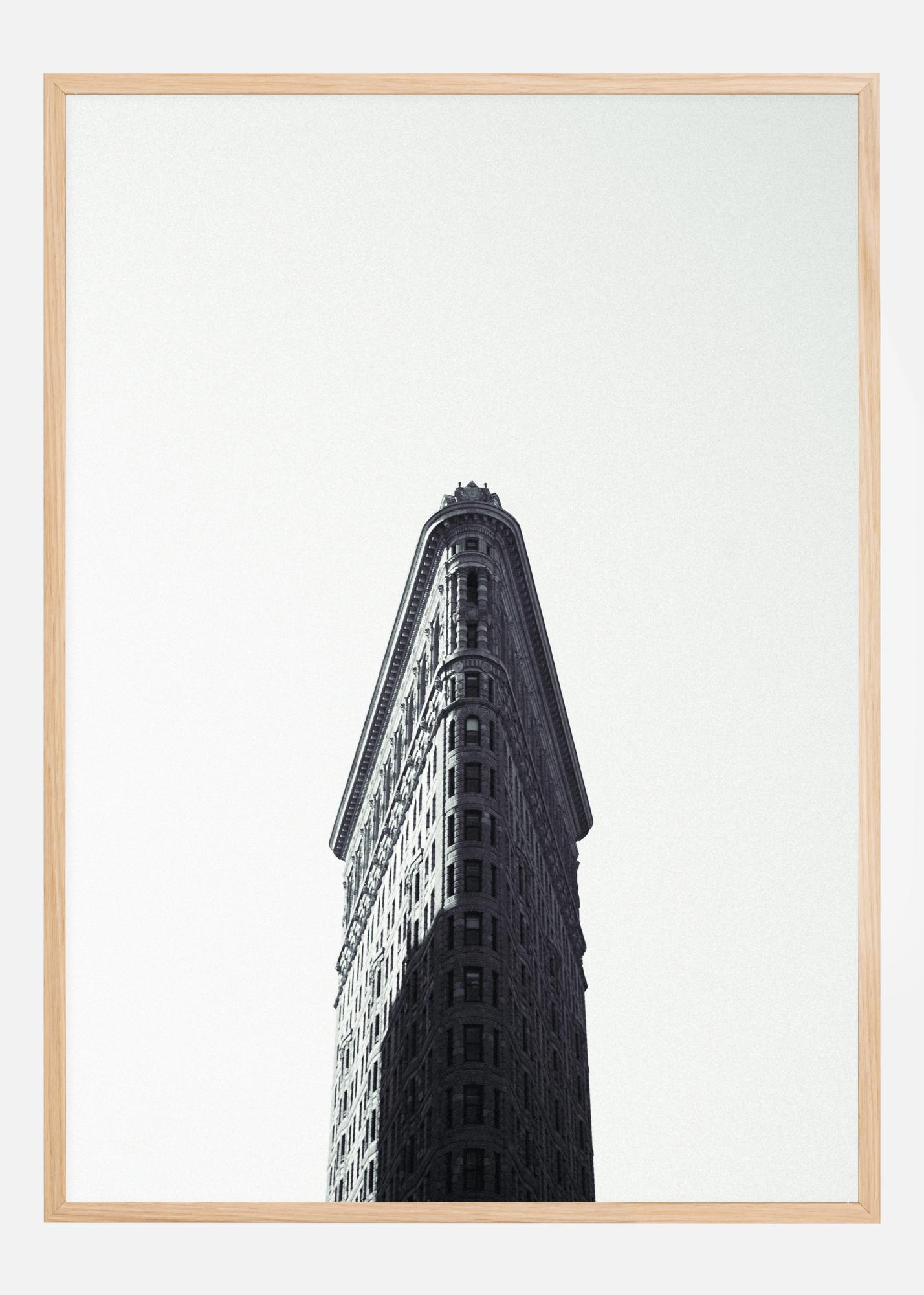Un póster arquitectónico que muestra la esquina frontal de un antiguo bloque de apartamentos. La fachada del edificio se asemeja a la proa de un barco, en fuerte contraste con el cielo blanco. La forma triangular captura la mirada y la guía hacia arriba del edificio. Cuelga esta obra en una pared de color sólido para crear una atmósfera artística.