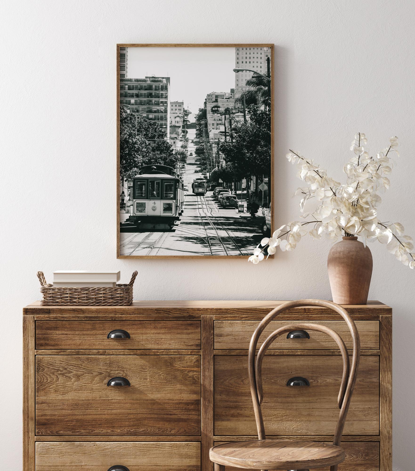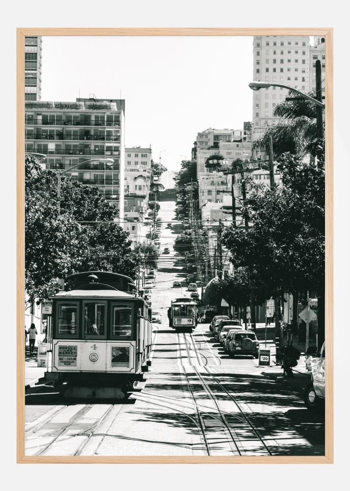 Un póster de paisaje urbano con el centro de la ciudad de San Francisco. Un tranvía sube por una colina entre los edificios en primer plano, con árboles a cada lado. Esta impresión en blanco y negro añade un toque de clase independientemente de en qué pared decidas colgarla.