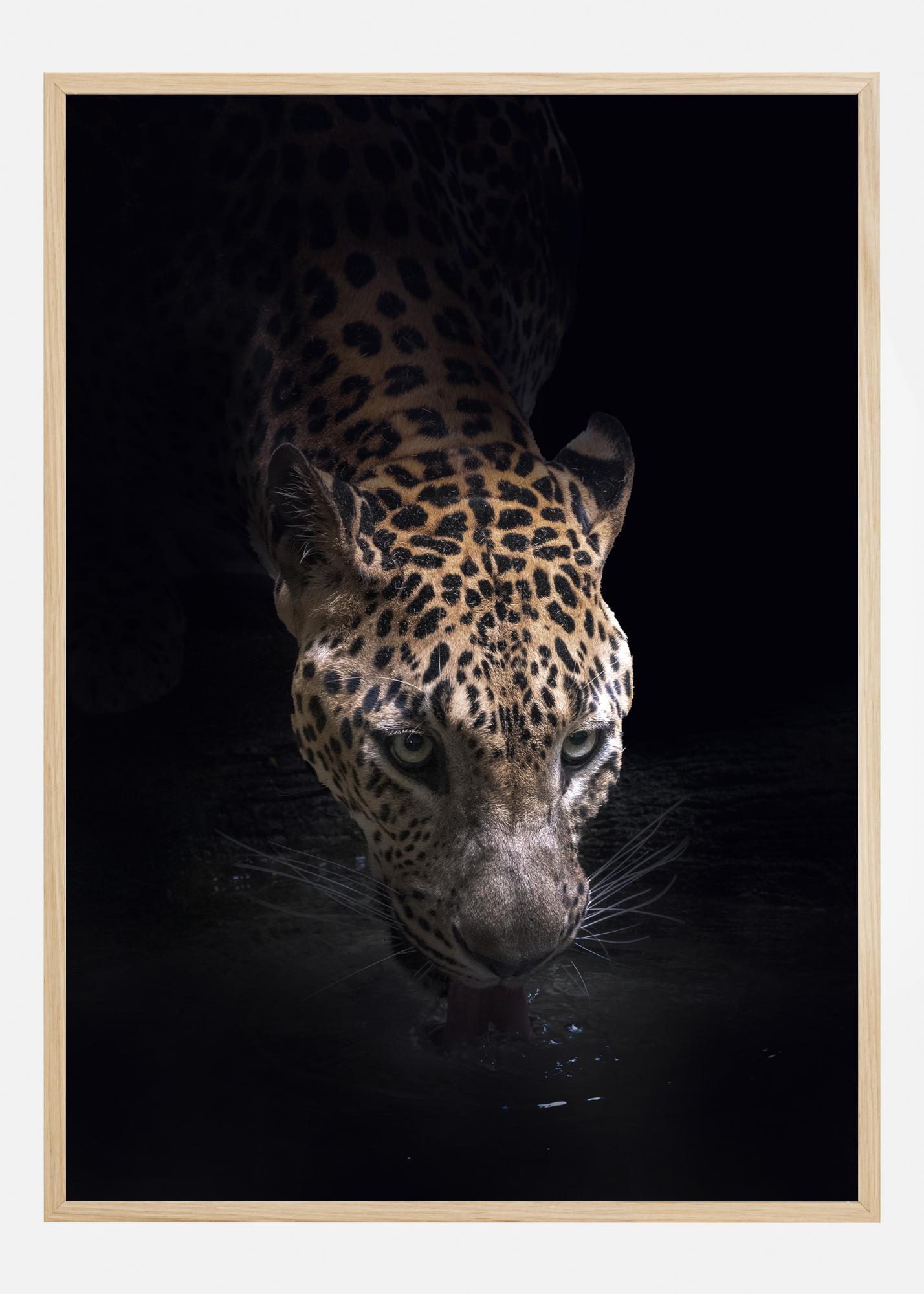Este póster dramático captura un leopardo en un momento íntimo mientras bebe agua tranquilamente, un poderoso instante de la naturaleza salvaje capturado en el tiempo. El fondo negro resalta el color dorado del magnífico pelaje y las manchas distintivas, creando un efecto casi tridimensional. El leopardo está orientado hacia el observador con una mirada llena de la concentración y presencia de un animal salvaje, estableciendo una conexión inmediata entre el animal y el ser humano.
