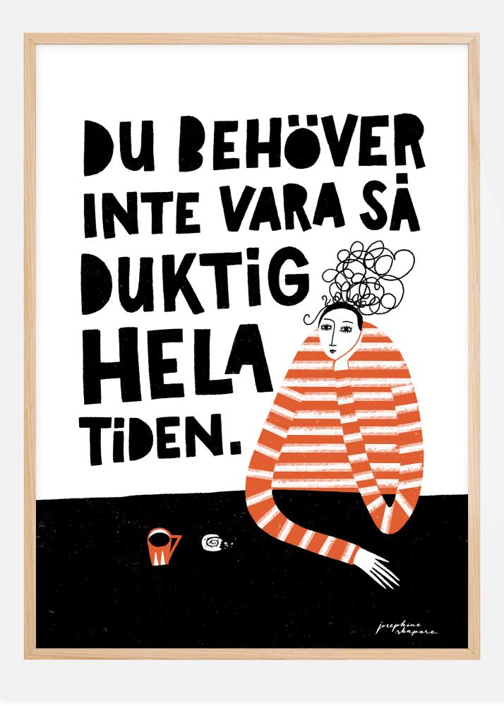 Un divertido y motivador póster con una mujer sentada en una mesa con su café con la siguiente cita "No tienes que ser la mejor todo el tiempo" escrito en inglés. Inspírate cada mañana con tu café y comienza tu día de manera positiva.