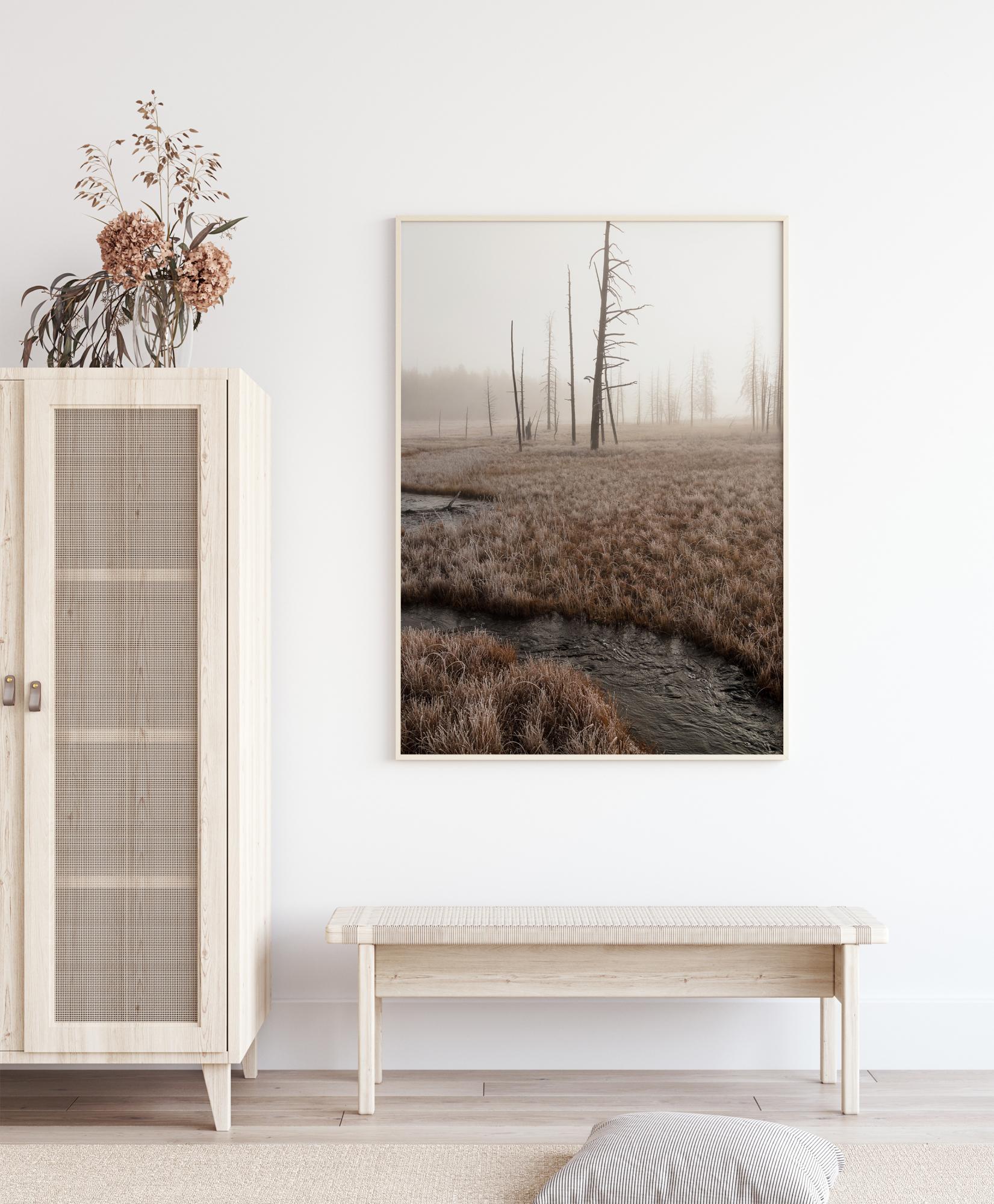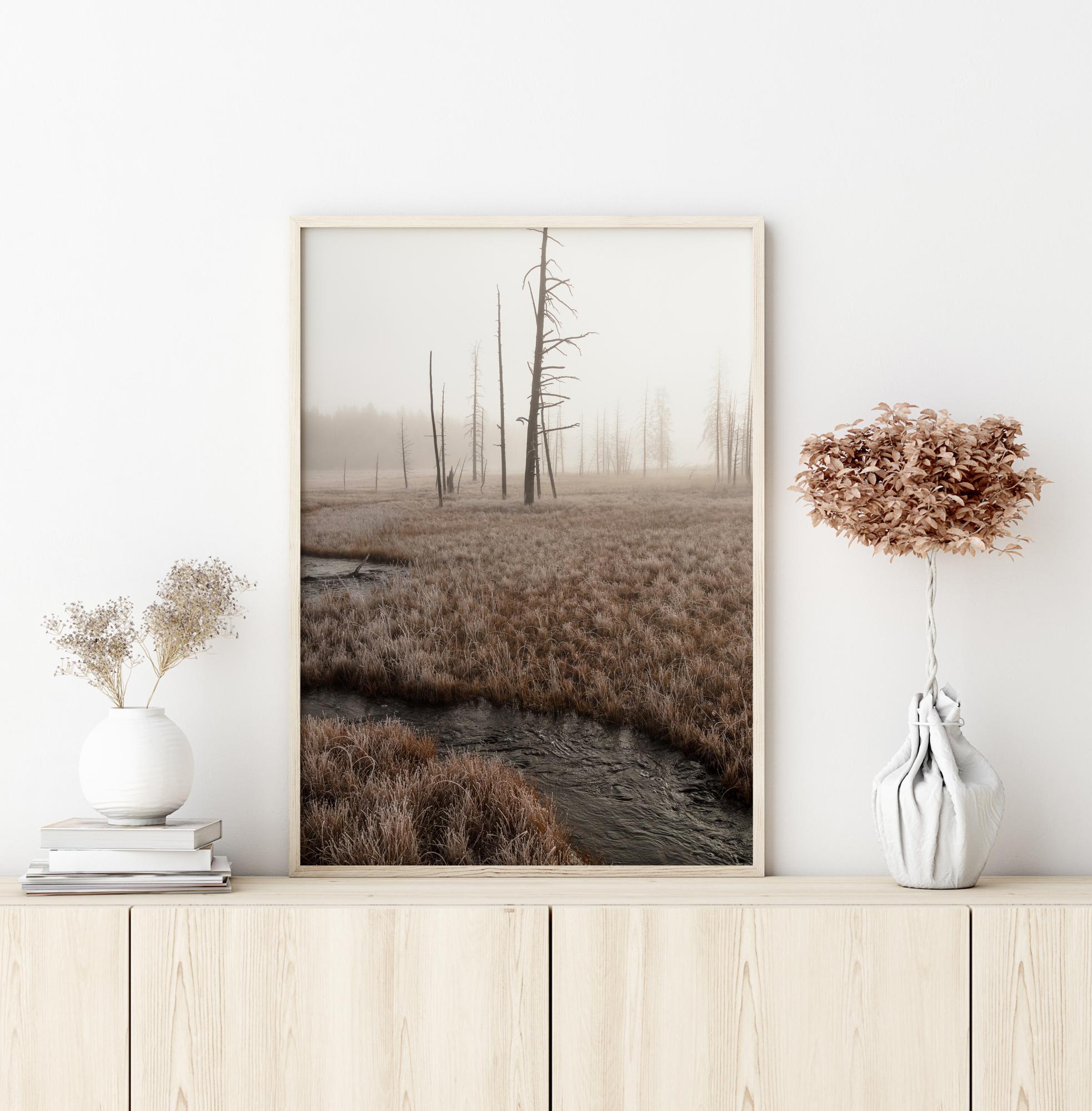 Un paisaje sobrenatural con una llanura de árboles muertos y un río que fluye a través de ella. En esta foto de la mañana temprana, la niebla envuelve los árboles y la hierba amarilla. Sigue el río mientras serpentea a través del paisaje hasta el bosque distante. Piérdete en otro tiempo y lugar cuando cuelgues esto.