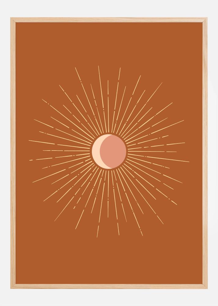 Este póster minimalista y elegantemente diseñado con un eclipse solar abstracto se convierte en un acento moderno y estilizado en cualquier pared. Con sus líneas limpias y motivo radiante sobre un fondo de terracota profundo, esta impresión representa una mezcla perfecta de simplicidad y sofisticación. El elemento central del diseño, un círculo con una explosión de líneas, simboliza luz y energía, y añade un efecto dinámico en la sala.