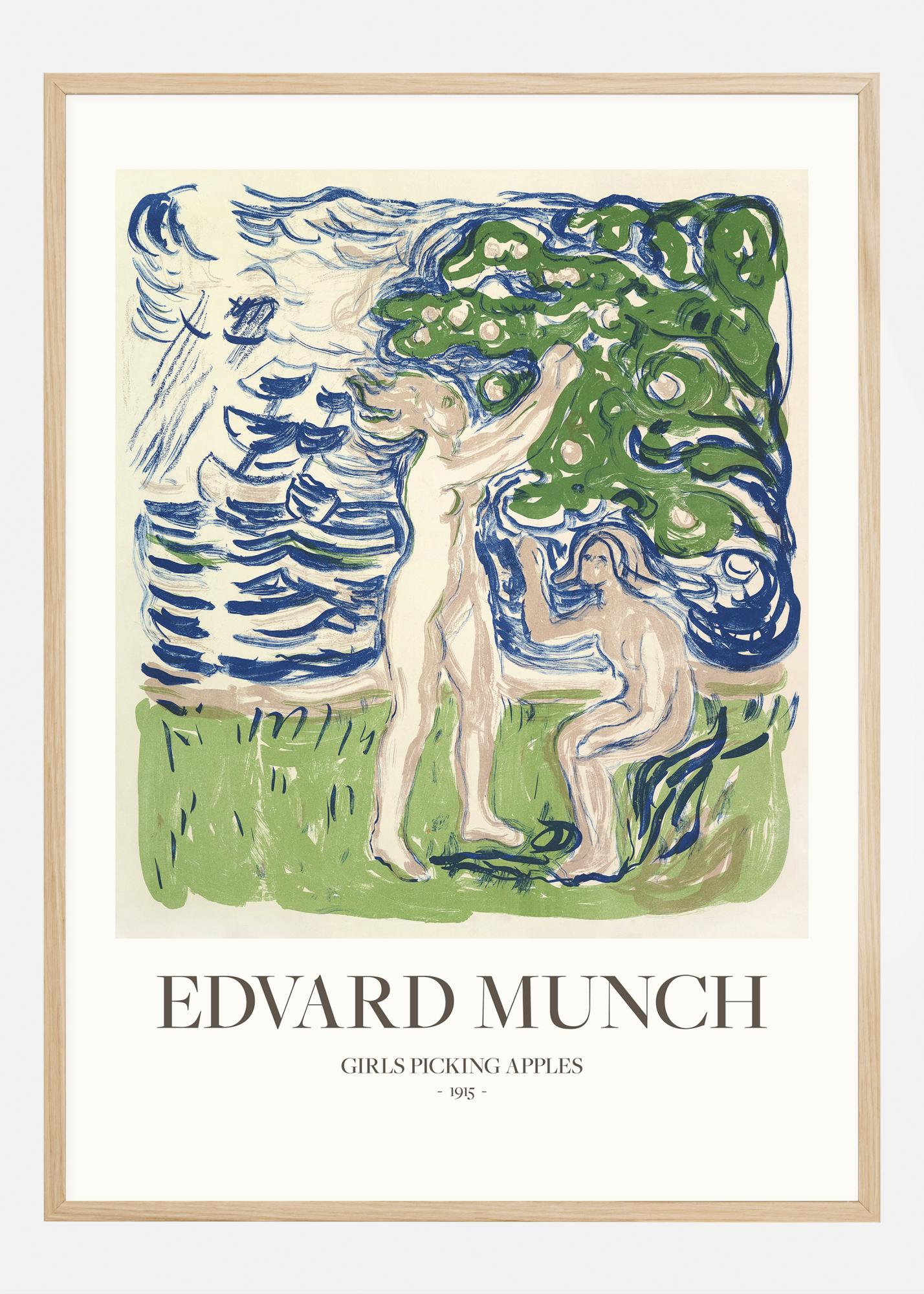 Este póster representa 'Niñas Recogiendo Manzanas', una obra de 1915 de Edvard Munch, que captura una escena idílica y atmosférica. La obra de arte ofrece una representación sencilla pero expresiva de dos figuras entre los árboles, sus cuerpos y rostros resaltados con pinceladas sueltas y libres. El esquema de color está dominado por un verde fresco y un marrón terroso que crean el césped y los troncos de los árboles, mientras que el cielo azul y blanco proporciona un fondo vibrante que resalta los tonos manzana verdes claros y los suaves colores de piel. Esta impresión es un homenaje al simple placer de la vida y un toque artístico perfecto para darle a cualquier habitación una sensación de naturaleza y libertad.