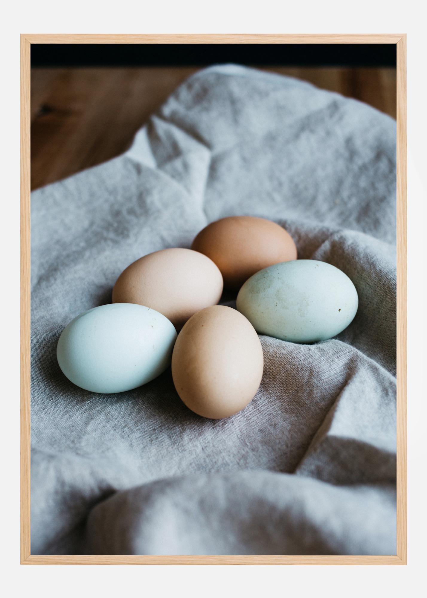 Un póster de bodegón (naturaleza muerta) con cinco huevos sobre un paño de cocina blanco en la mesa. Los huevos son de diferentes colores marrones y blancos y parecen haber sido recién puestos. Los tonos cálidos crean una sensación rústica donde se puede apreciar la atmósfera natural y viva. Perfecto para un entorno de cocina.