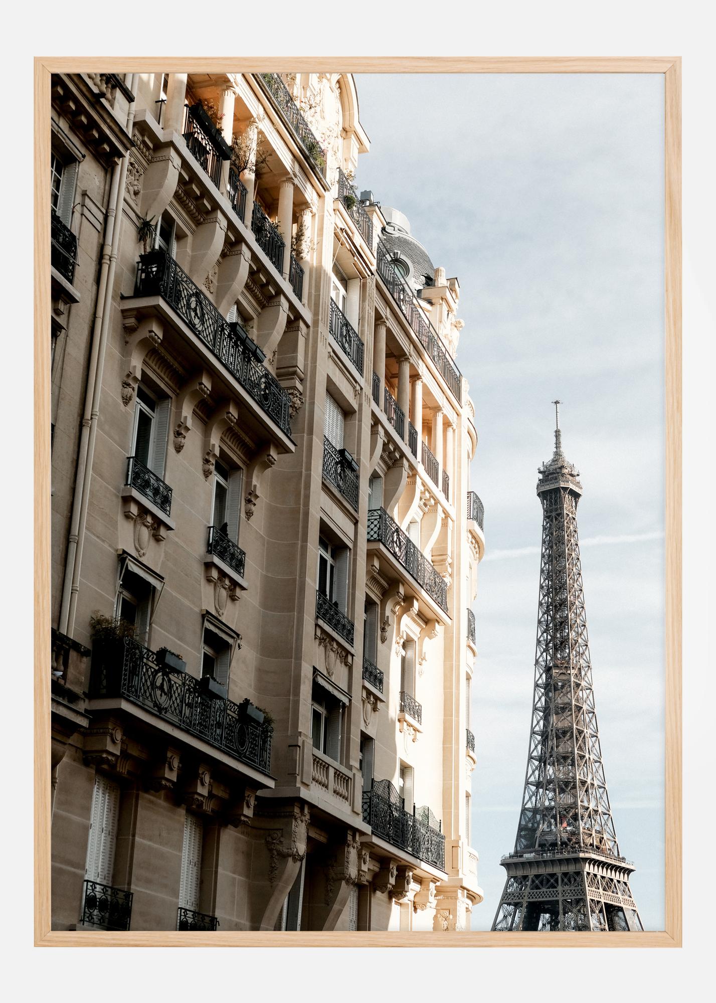 Este póster representa una vista clásica de París donde la Torre Eiffel se eleva orgullosamente detrás de las típicas casas residenciales de la ciudad, con sus balcones de hierro forjado y detalles escultóricos en la fachada. Es una escena que respira atmósfera y elegancia parisina, perfecta para añadir un toque de estilo francés a cualquier hogar. La imagen captura el equilibrio perfecto entre las joyas arquitectónicas de la ciudad y el espacio abierto del cielo, brindando una sensación de amplitud y libertad que es sinónimo del alma de París.