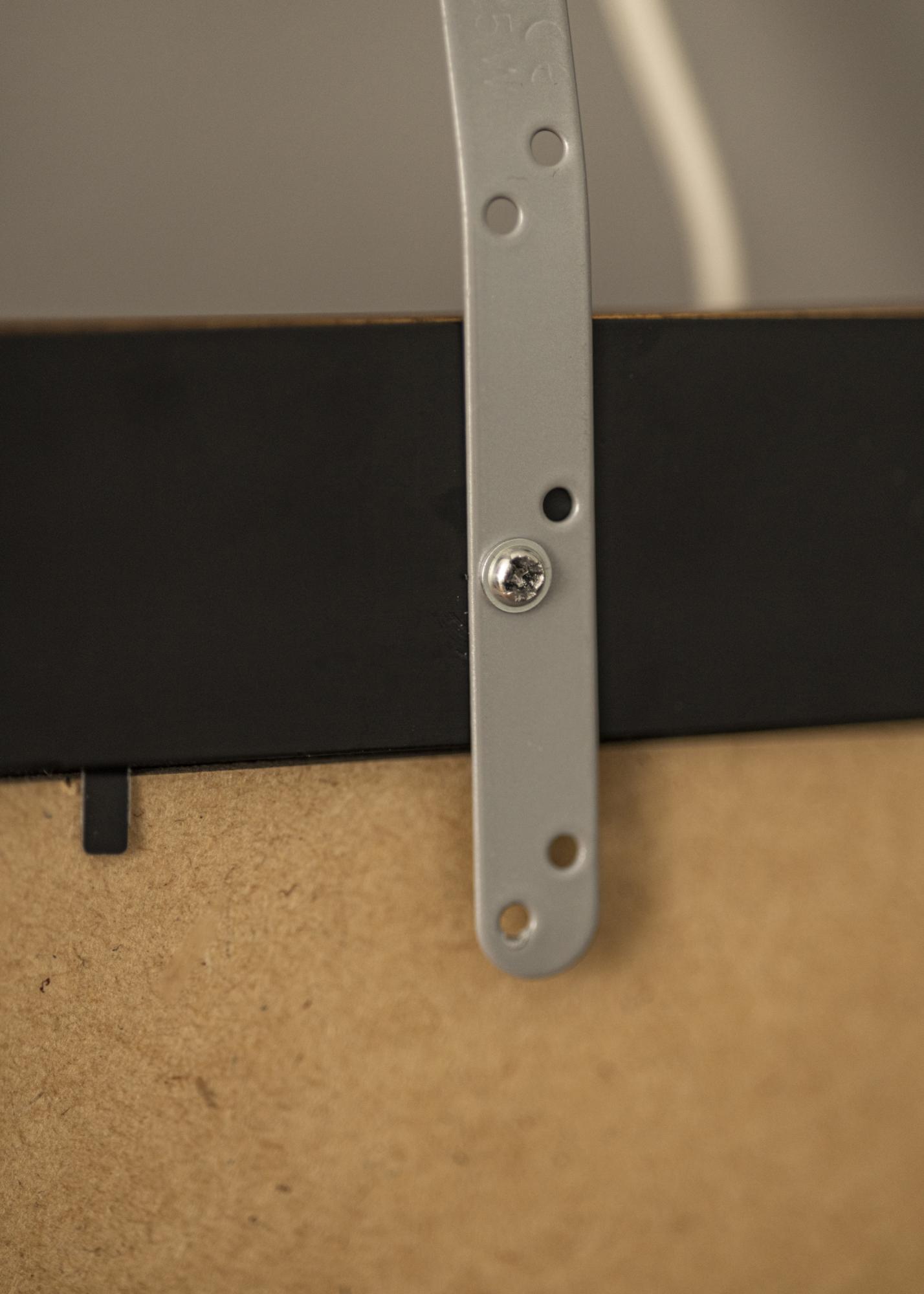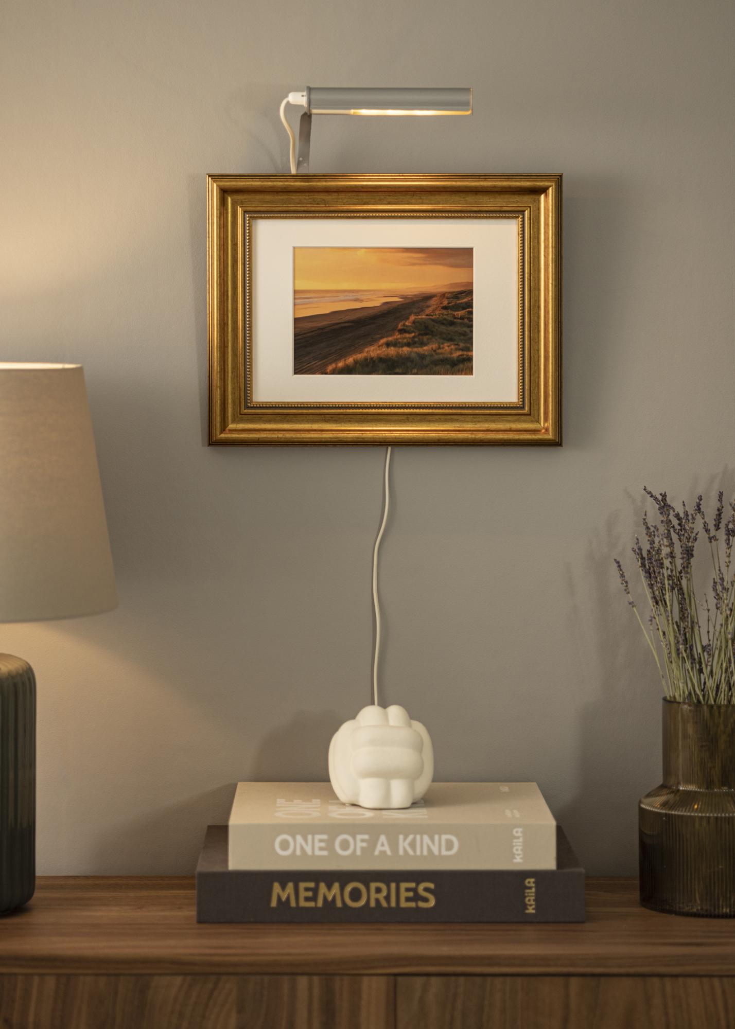Normalmente, se coloca la iluminación para cuadros en la parte trasera del marco. La desventaja de esto es que se requiere un marco de madera (algunos marcos compuestos funcionan) con un perfil ancho para poder atornillar en el marco. Con nuestro soporte de pared, no tienes que preocuparte por eso, sencillamente monta tu iluminación para cuadros directamente en la pared detrás del cuadro.