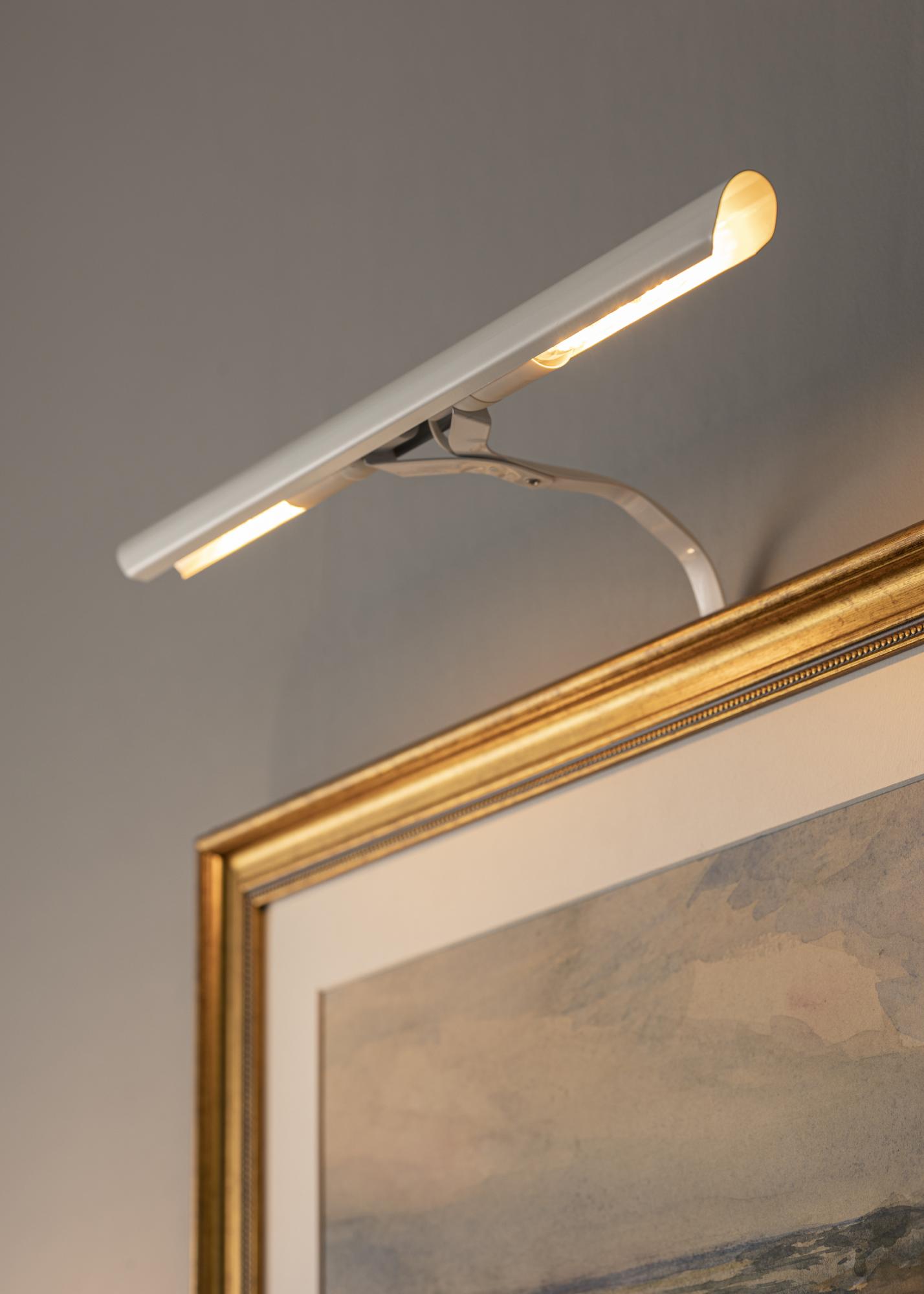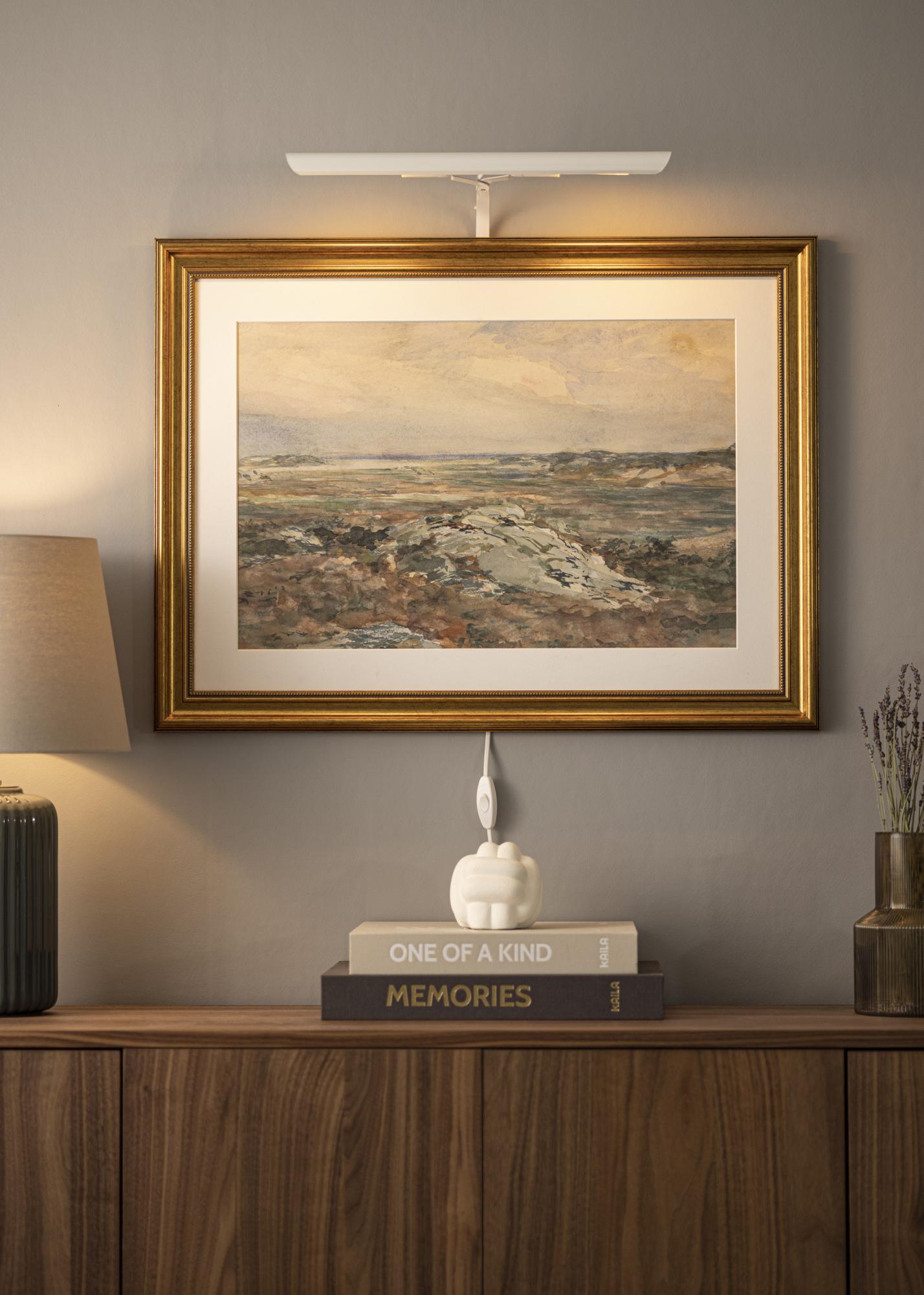 Normalmente, se coloca la iluminación para cuadros en la parte trasera del marco, la desventaja de esto es que se requiere un marco de madera (algunos marcos compuestos funcionan) que tenga un perfil ancho para poder atornillar en el marco. Con nuestro soporte de pared, no tienes que preocuparte por eso, sencillamente monta tu iluminación para cuadros directamente en la pared detrás del cuadro.