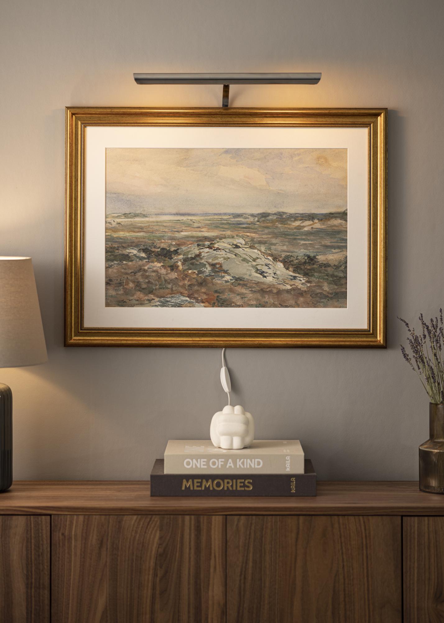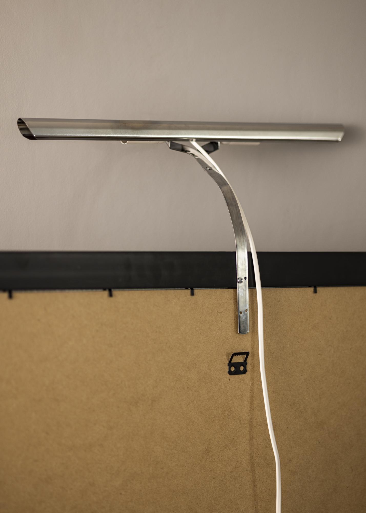 Normalmente, se coloca la iluminación para cuadros en la parte trasera del marco, la desventaja de esto es que se requiere un marco de madera (algunos marcos compuestos funcionan) que tenga un perfil ancho para poder atornillar en el marco. Con nuestro soporte de pared, no tienes que preocuparte por eso, sencillamente monta tu iluminación para cuadros directamente en la pared detrás del cuadro.
