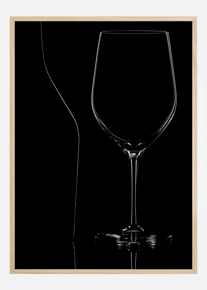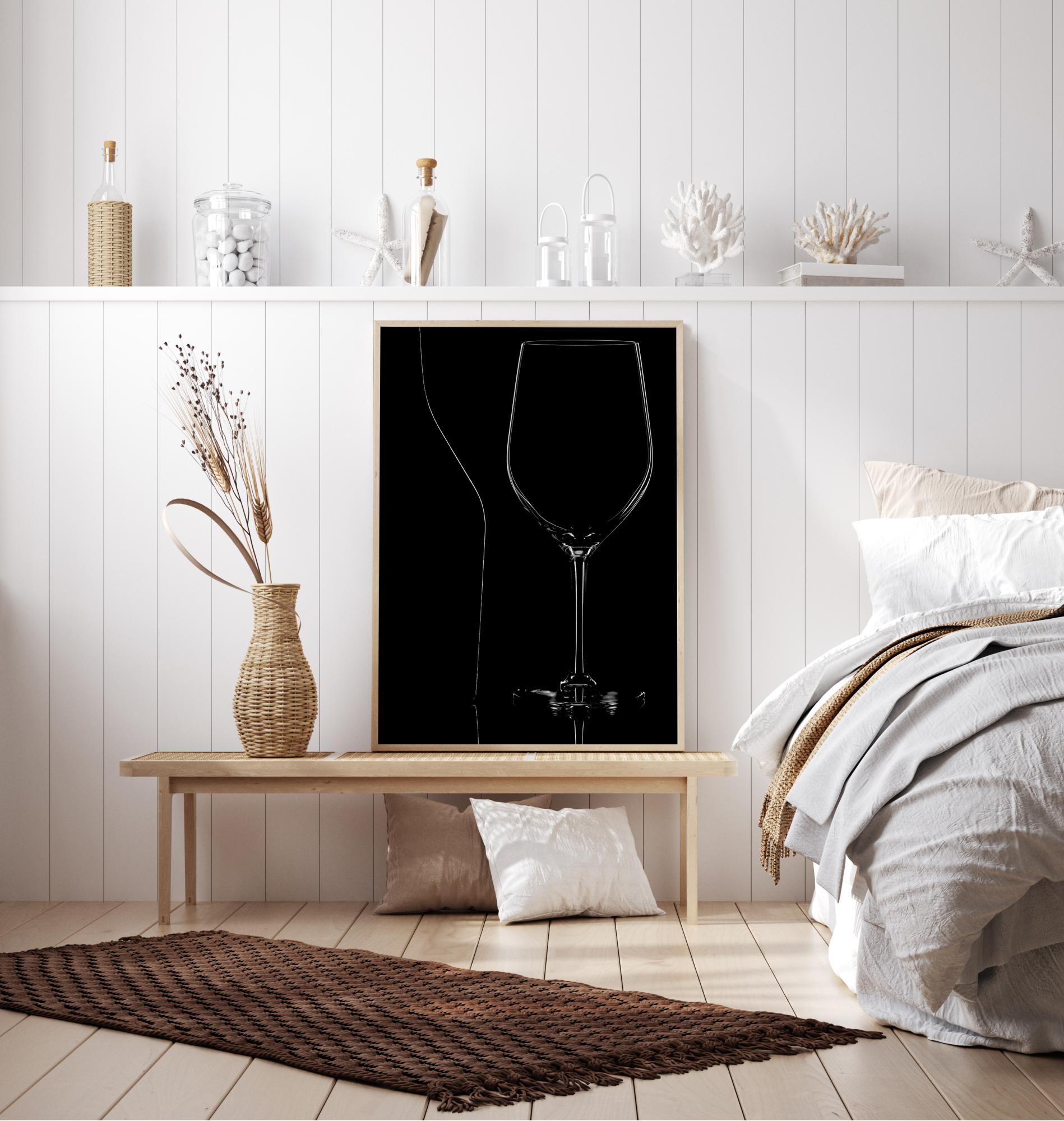 Un elegante póster con una copa de vino sobre un fondo negro. Esta imagen abstracta irradia clase ya que solo se ve el vaso gracias a la luz reflejada alrededor de los bordes. Combínalo con una pared blanca para mantener la elegancia dramática.
