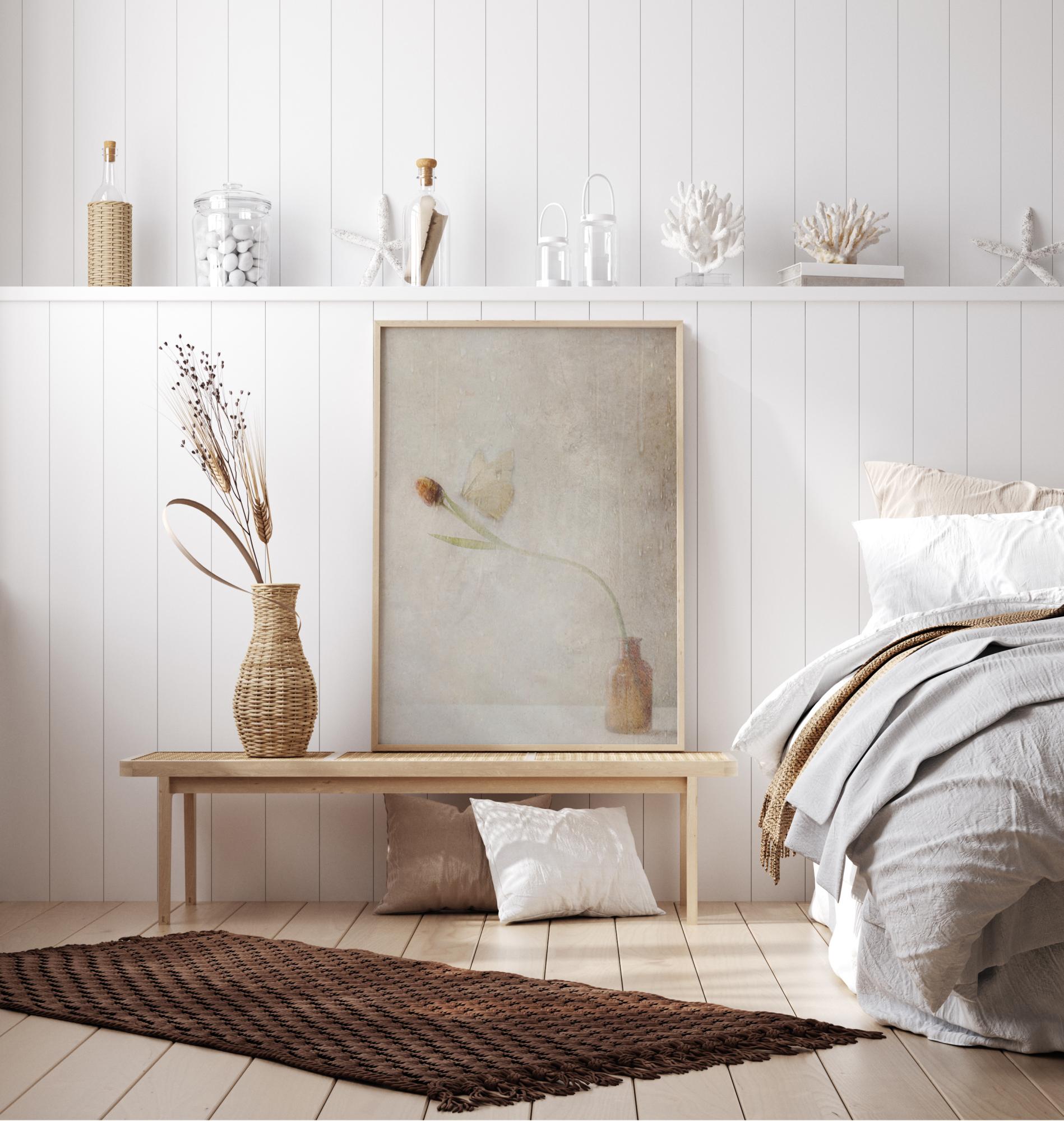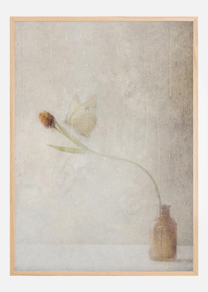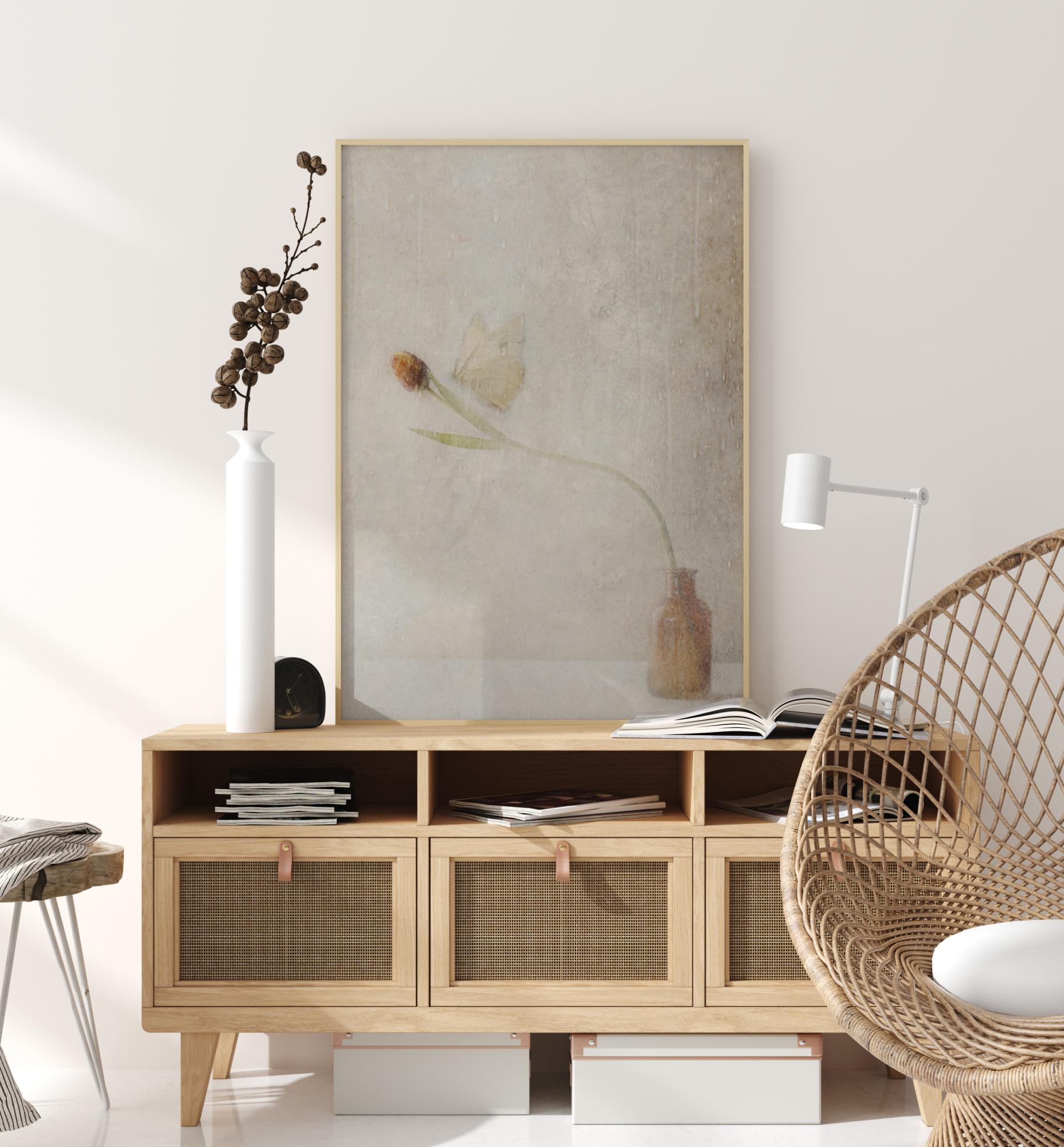 Un póster discreto con una mariposa que aterriza en una flor. Esta imagen sutil con tonos marrones le da calidez a la habitación. La mariposa aterriza suavemente en la flor que se inclina hacia el centro de la imagen. Las alas casi se fusionan con la pared de fondo en este encuentro efímero.