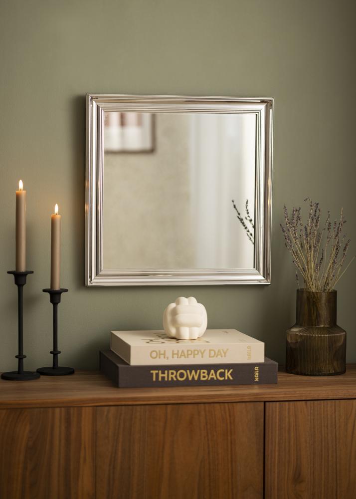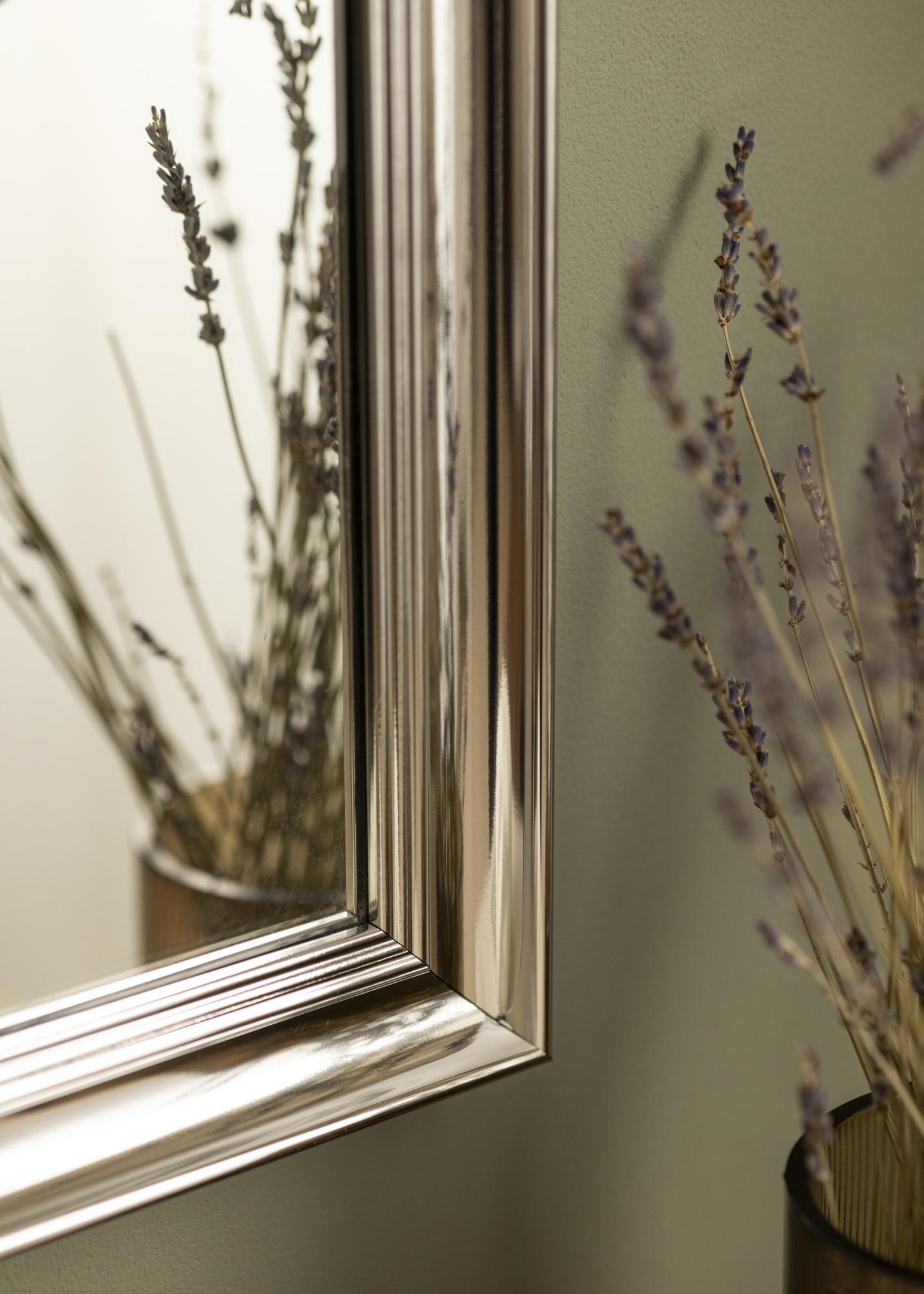 Alice Plateado es un espejo cuyo marco tiene un diseño clásico y sobrio con líneas rectas que se construyen para enfocar la atención en el motivo.