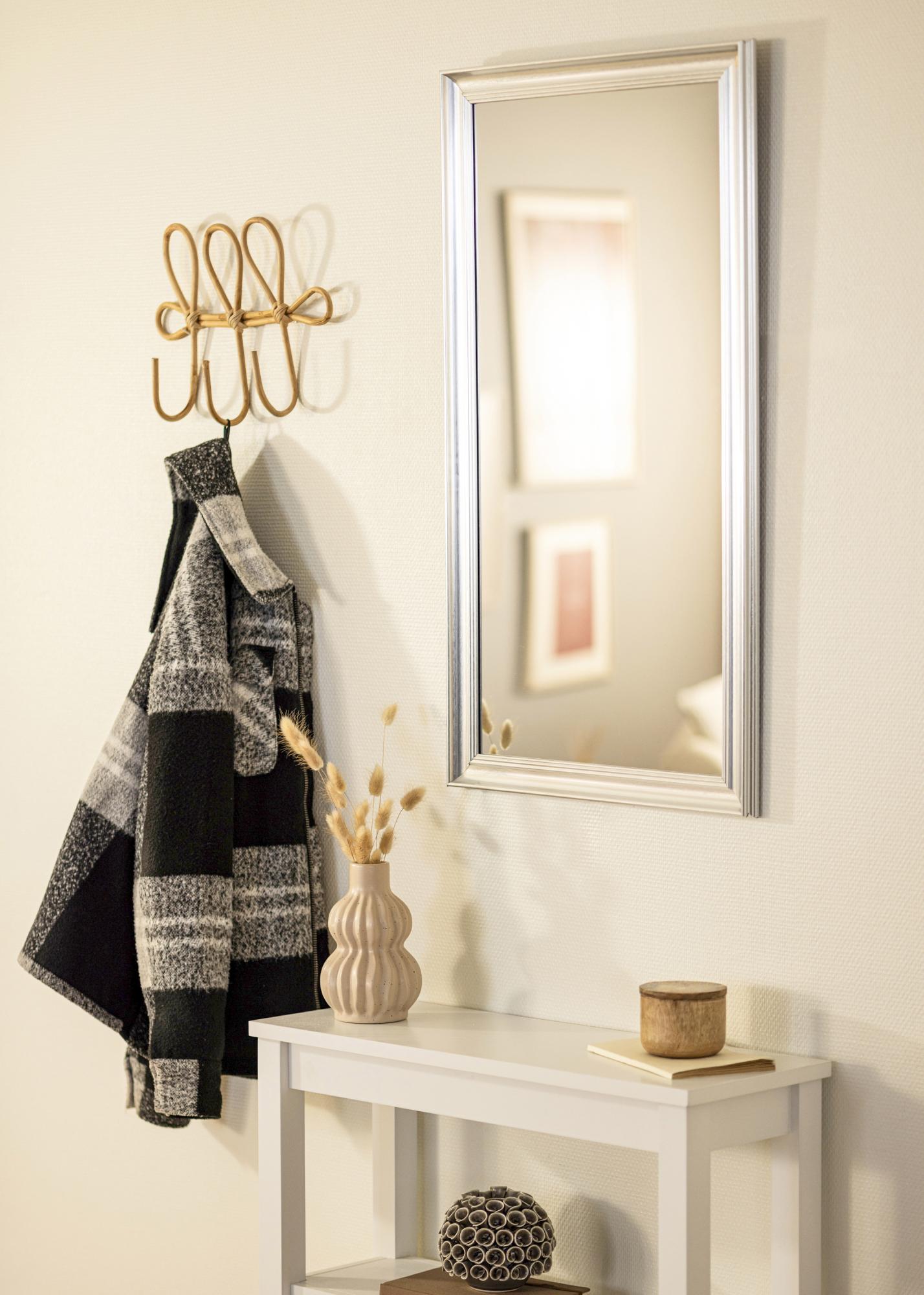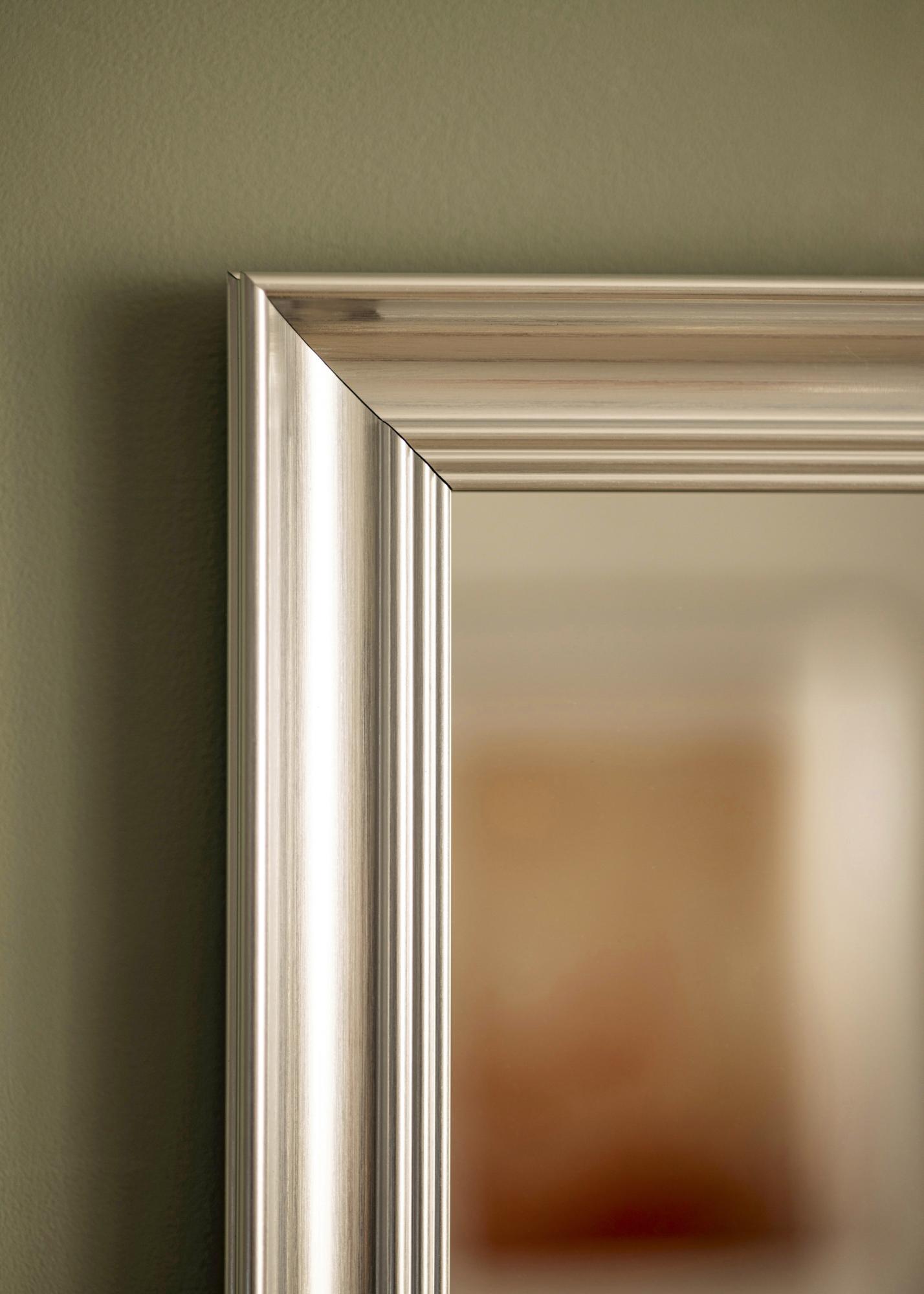 Alice Plateado es un espejo cuyo marco tiene un diseño clásico y sobrio con líneas rectas que se construyen para enfocar la atención en el motivo.