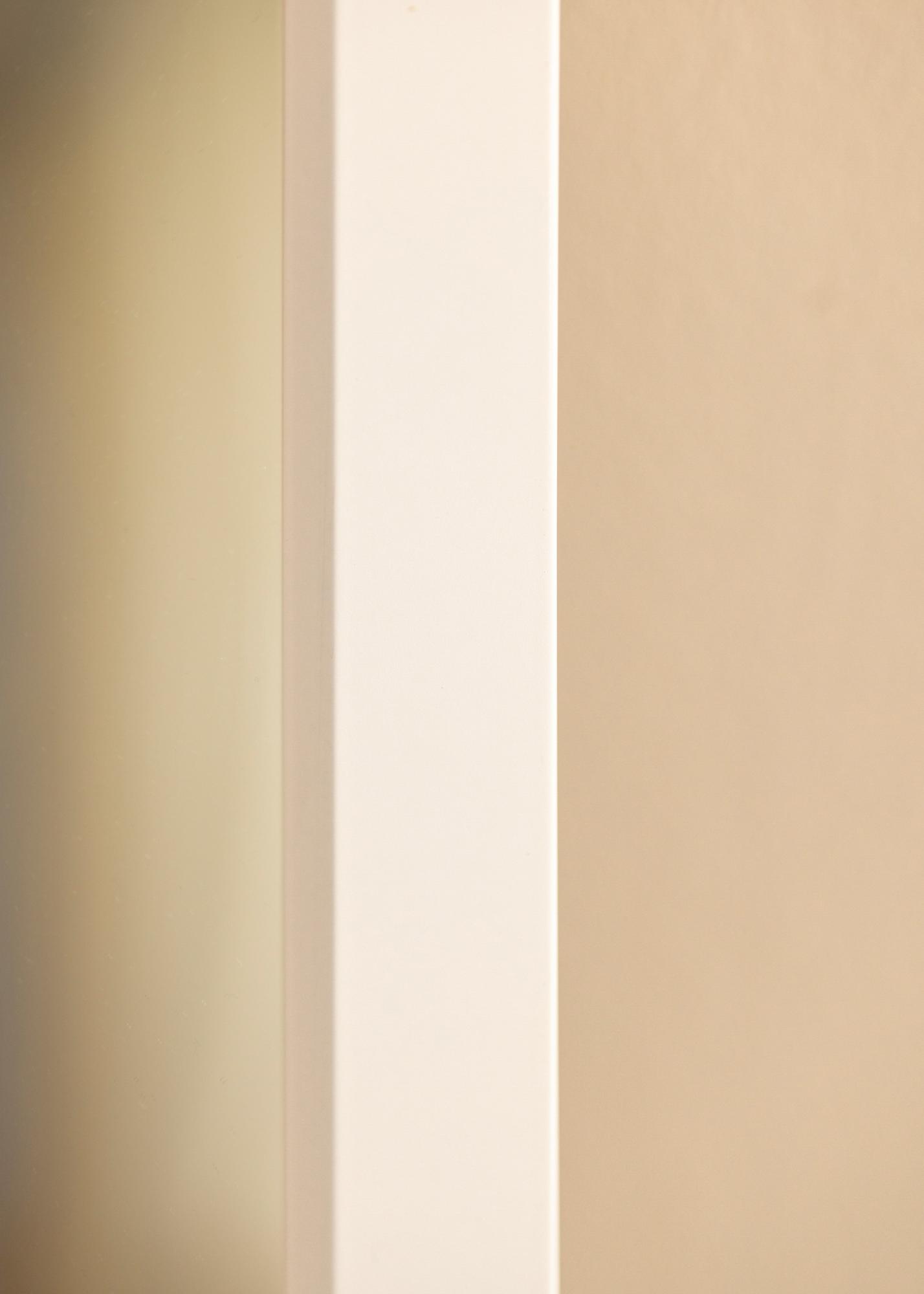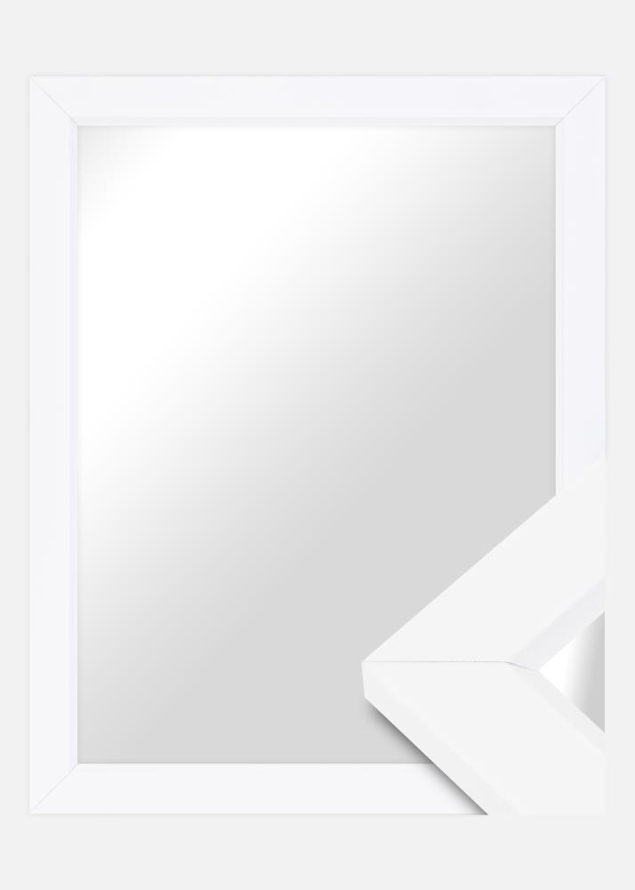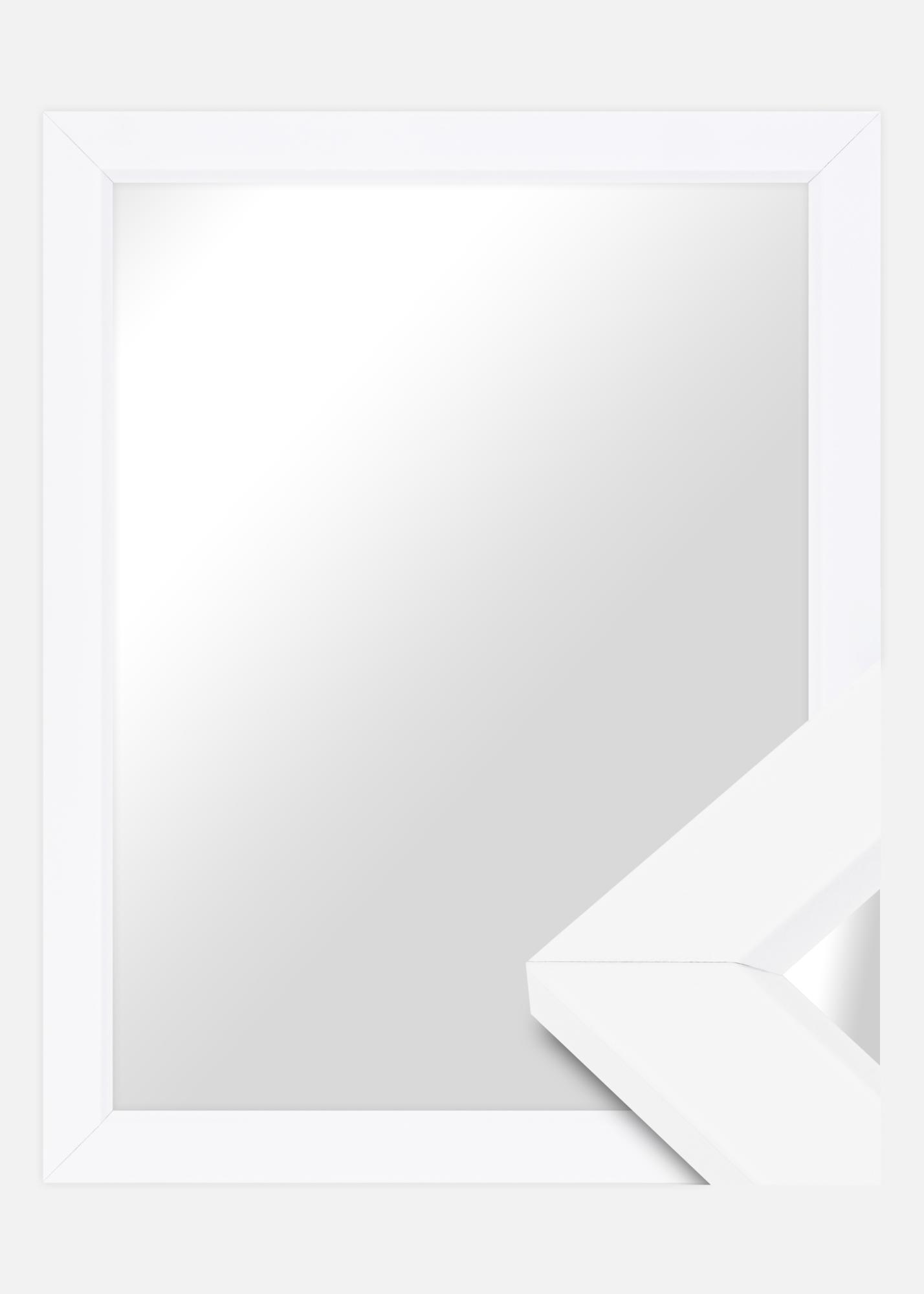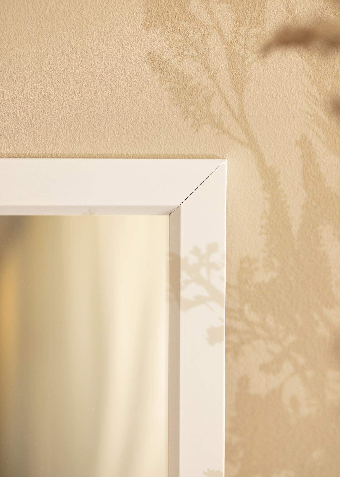 Elegante espejo con un sencillo marco blanco fabricado en aluminio que tiene un borde interior biselado. El aspecto elegante y fino del marco hace que el espejo se adapte bien a todas las habitaciones del hogar, independientemente del estilo de decoración, pero se ve especialmente bonito en un interior luminoso con un toque minimalista. Combina el espejo con pósters gráficos en marcos blancos en las paredes y objetos de vidrio como accesorios para crear una sensación luminosa y aireada en la decoración.