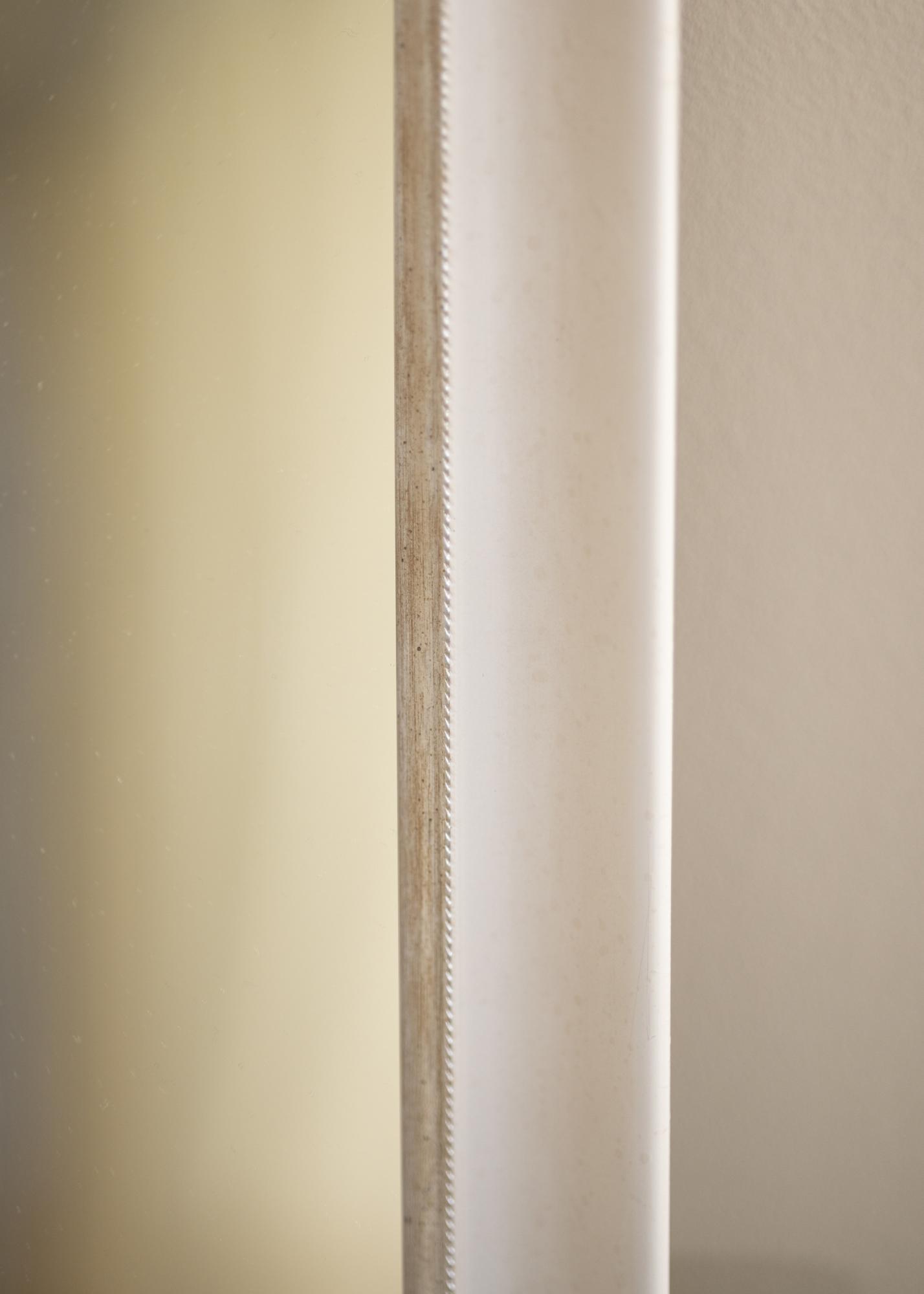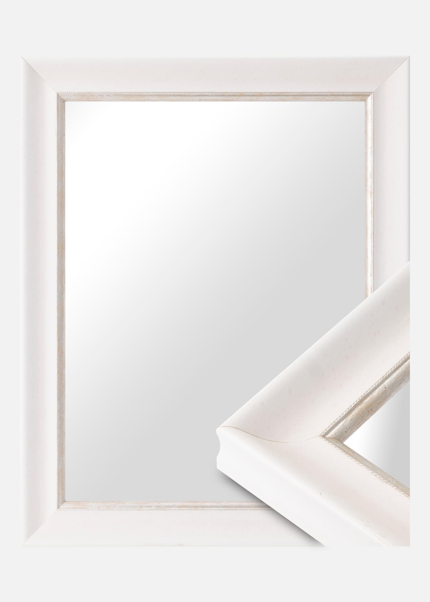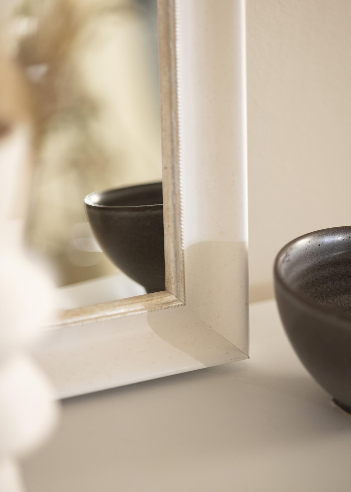 Espejo sólido en cualquier tamaño con un perfil clásico blanco. Cerca de la imagen hay un elegante borde plateado que le da al espejo un brillo adicional.