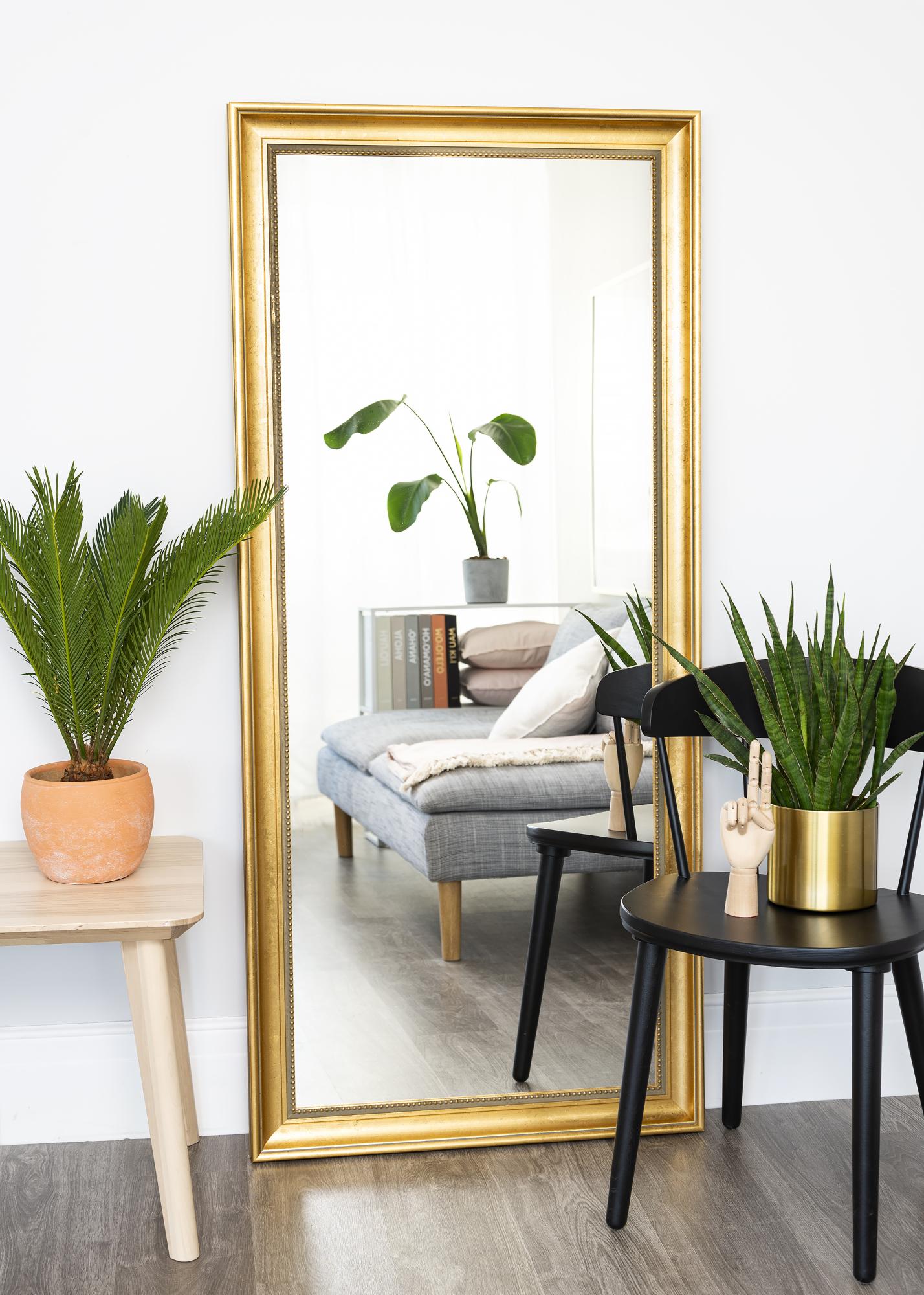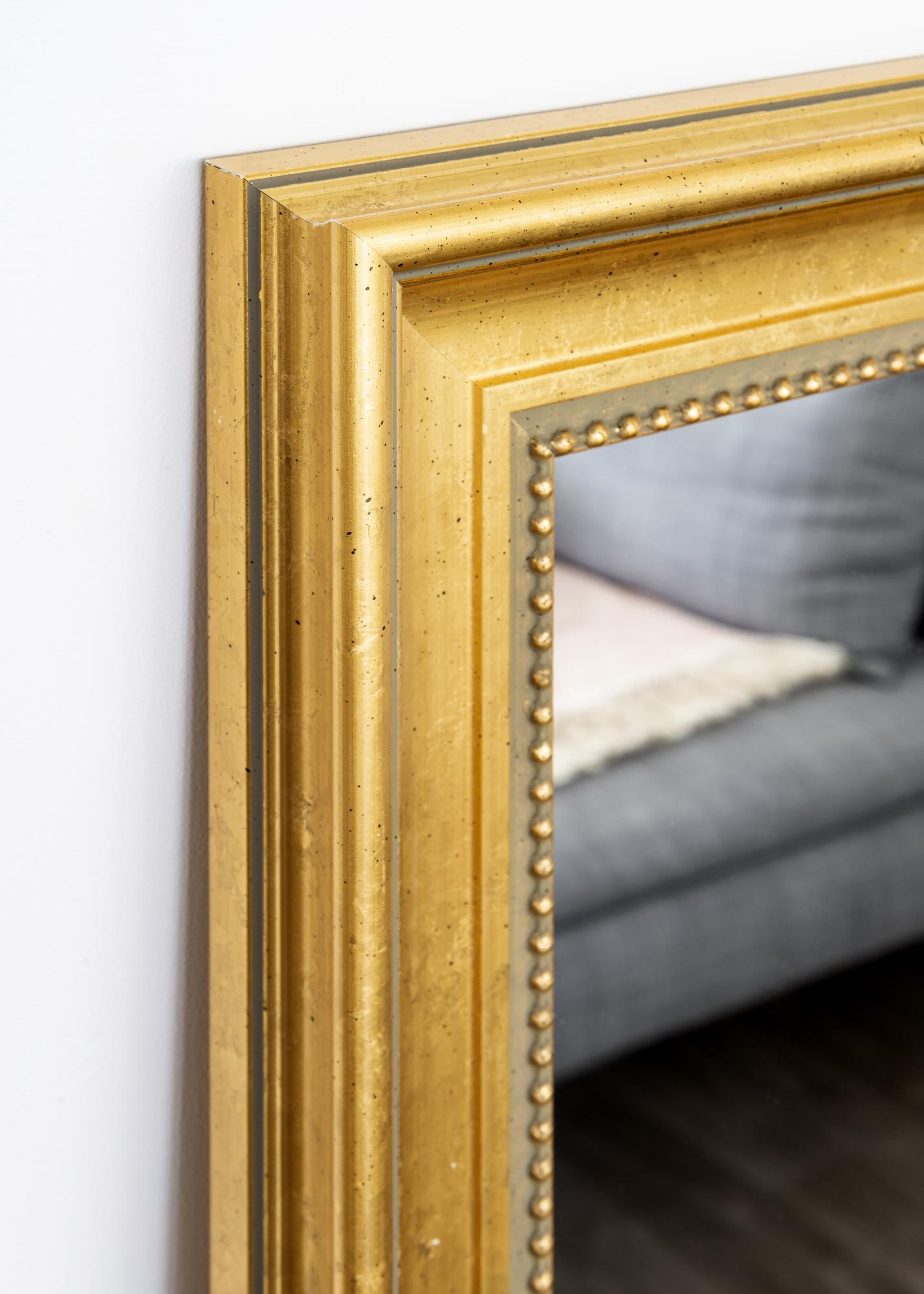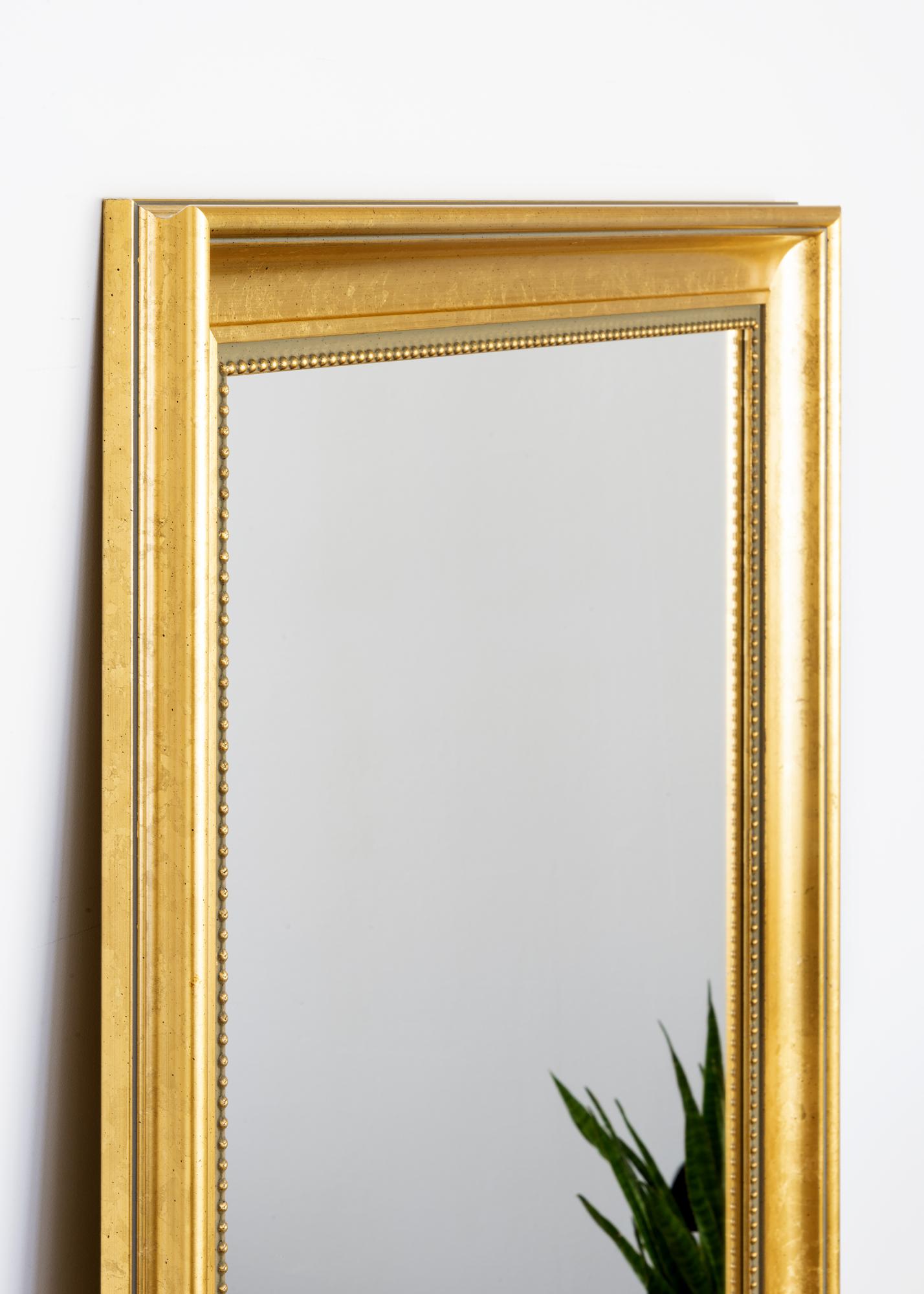 Adquiere un elegante espejo y haz que el interior del recibidor, la sala de estar o el baño sean extra lujosos. Este elegante espejo está disponible en varios tamaños, por lo que encontrarás fácilmente uno que se adapte a tu propósito. El marco del espejo tiene un diseño clásico con un marco ancho y un discreto diseño de perlas cerca del vidrio. La madera es de una silvicultura sostenible y está pintada en un hermoso tono dorado.