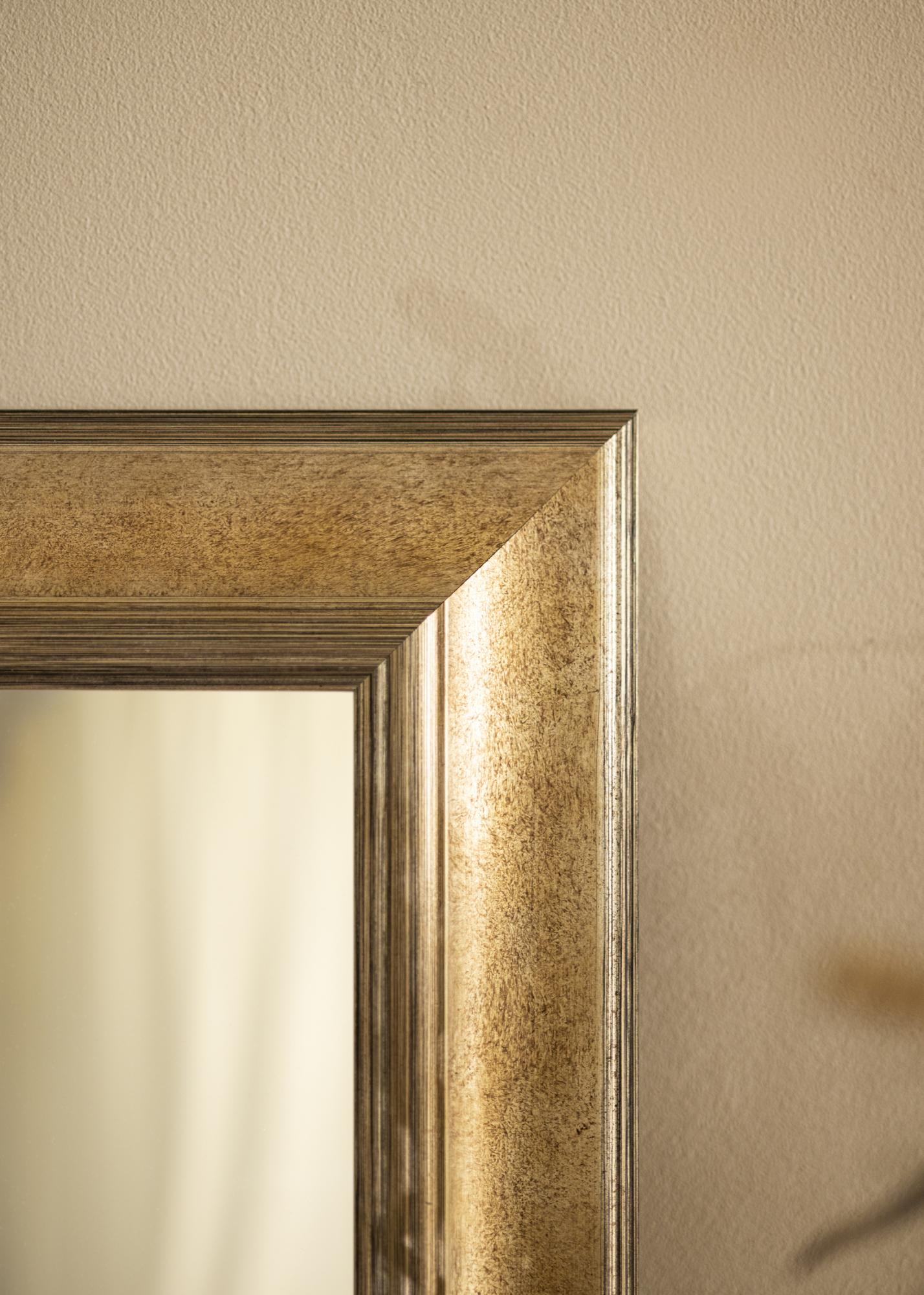 El tono plata oscura del espejo proporciona una sensación clásica y atemporal, lo que facilita combinarlo con diferentes estilos de decoración. La superficie cepillada tiene sutiles cambios de color que destacan tanto la profundidad como la textura, lo que le otorga al espejo un carácter único. Las decoraciones finas y lineales a lo largo de los bordes añaden una dimensión extra de elegancia y refinamiento.