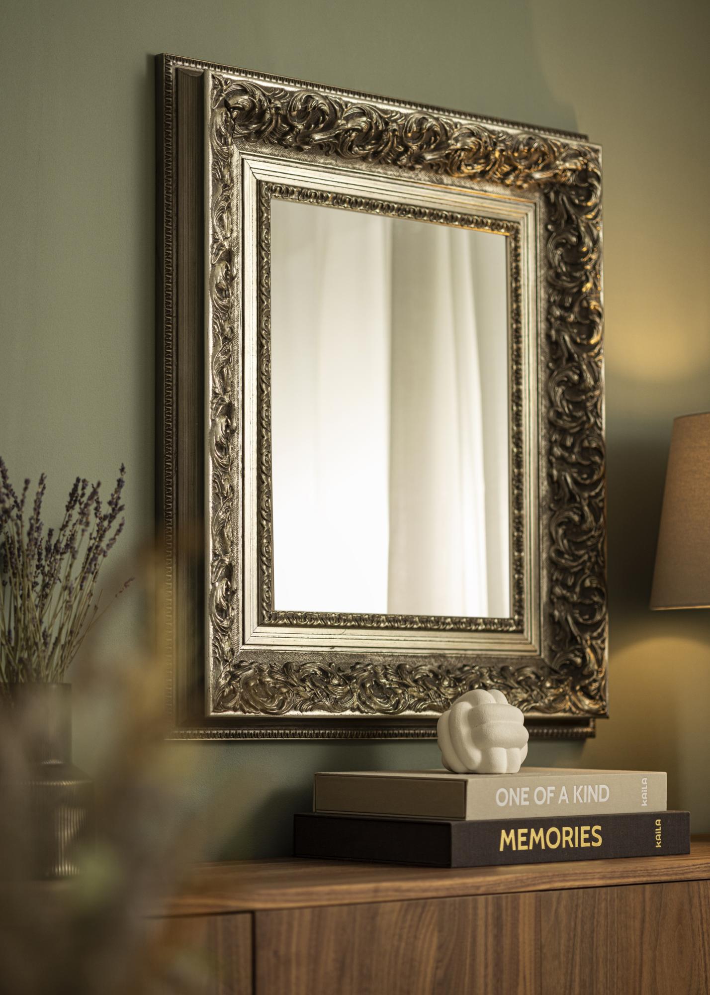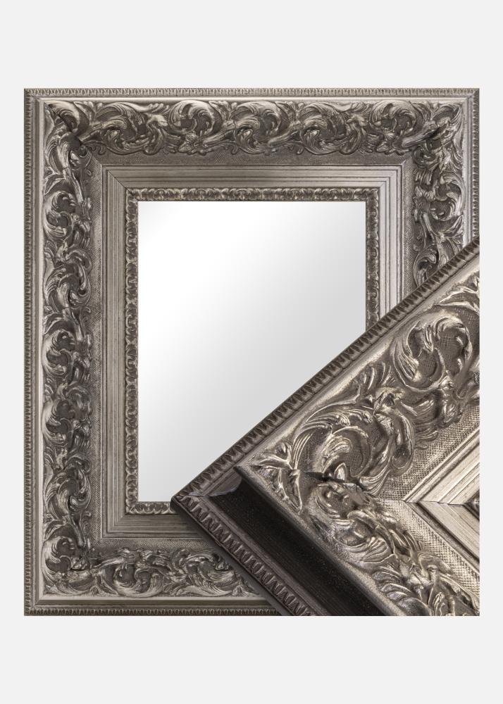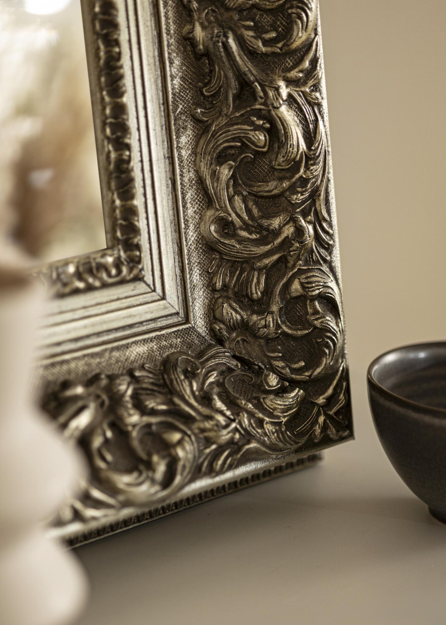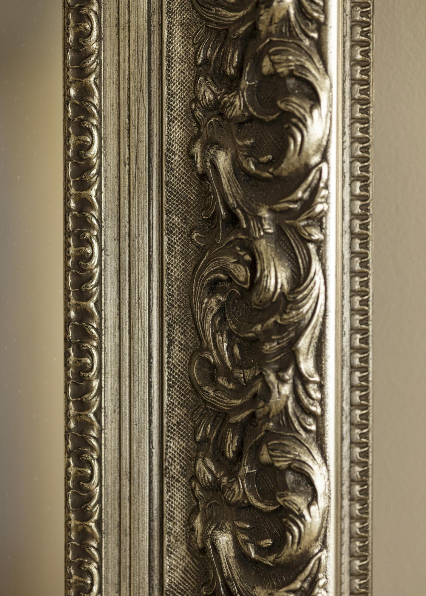 El espejo Birmingham Plata es un espejo hecho a medida que fabricamos nosotros, lo que te da la posibilidad de tenerlo en las dimensiones exactas que desees. Con su impresionante marco de 152 mm de ancho y una profundidad de 74 mm, este espejo se convierte en un detalle llamativo en cualquier habitación donde se coloque. El marco está hecho de pino y tiene un diseño ricamente ornamentado en plata antigua, lo que le da al espejo un carácter único.