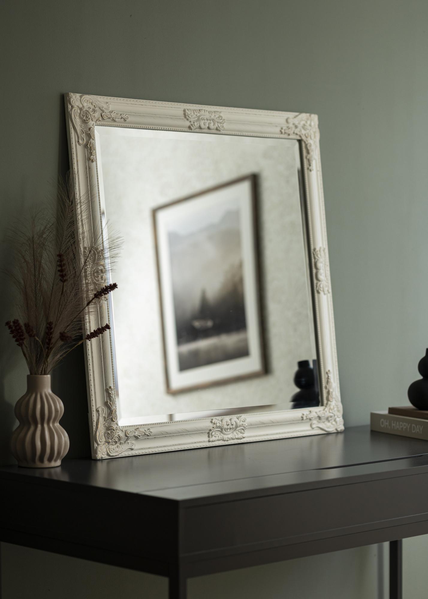 Descubre el elegante espejo cuadrado de 80x80 cm, el tamaño perfecto para ser funcional y decorativo en tu hogar. Este espejo tiene una forma cuadrada que proporciona una sensación simétrica y equilibrada, convirtiéndolo en un elemento llamativo en cualquier habitación. El marco blanco está ricamente decorado con detalles clásicos, lo que crea una elegancia y encanto atemporal.