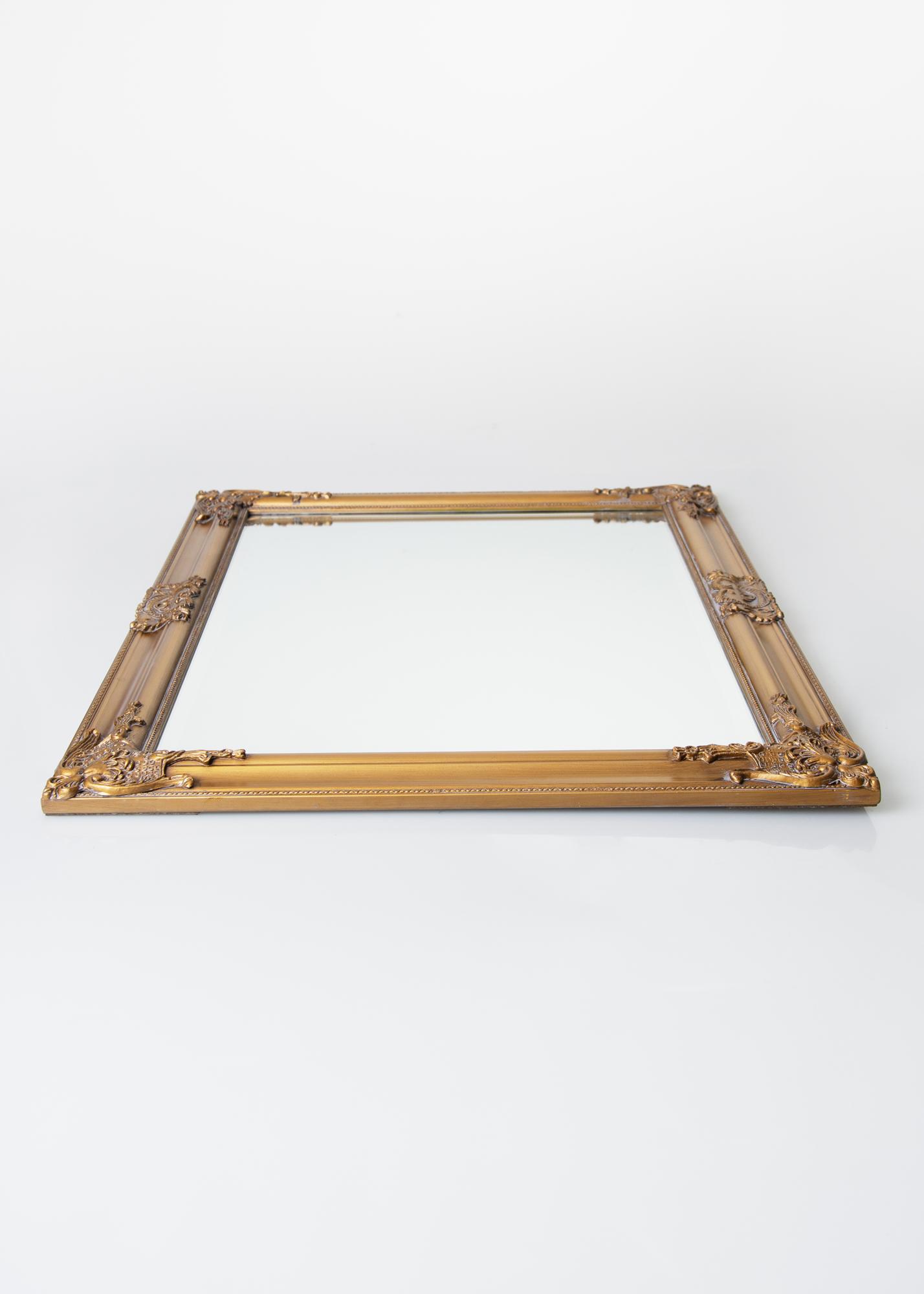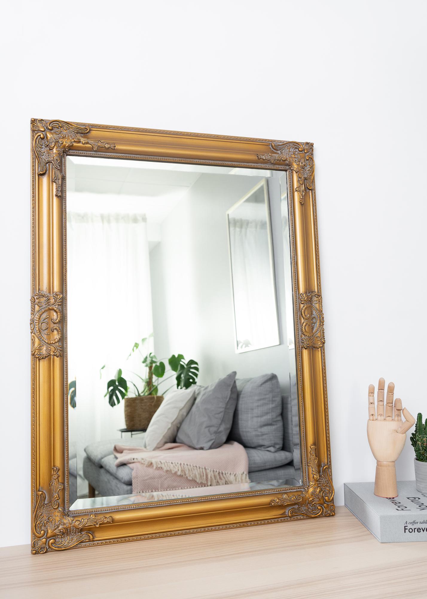La serie de espejos Bologna Dorado tiene un diseño latino con una decoración abundante en las esquinas y en los puntos medios de los bordes. Tiene un marco un poco más estrecho que muchos otros espejos de este estilo. El marco está hecho de madera y la decoración ha sido moldeada en yeso antes de ser aplicada al marco. Es perfecto como espejo de baño.