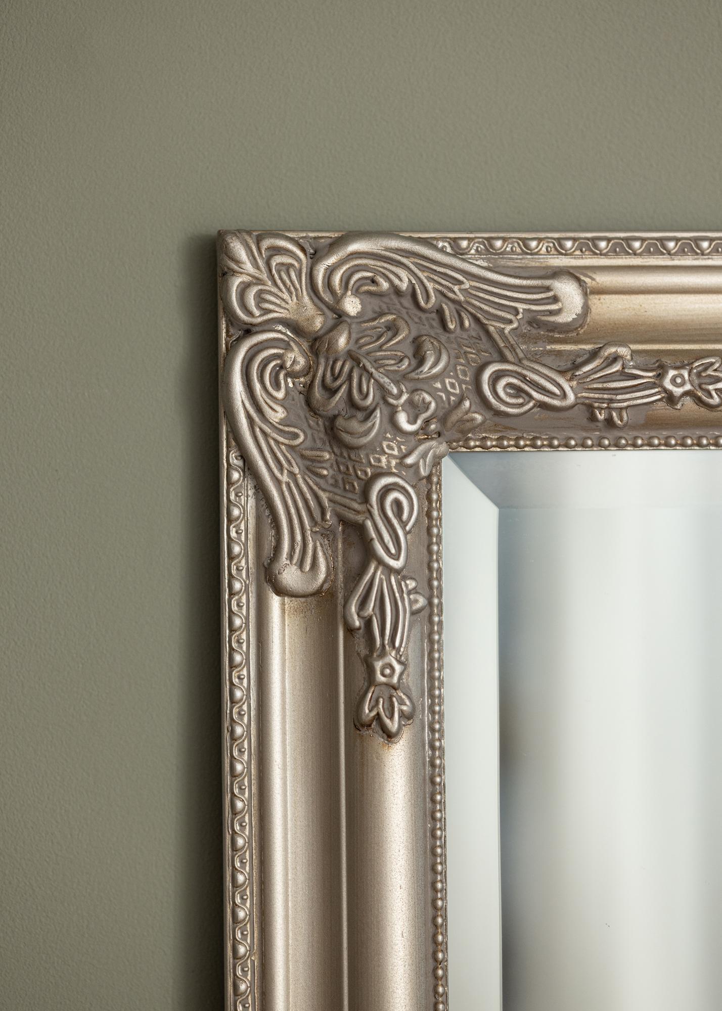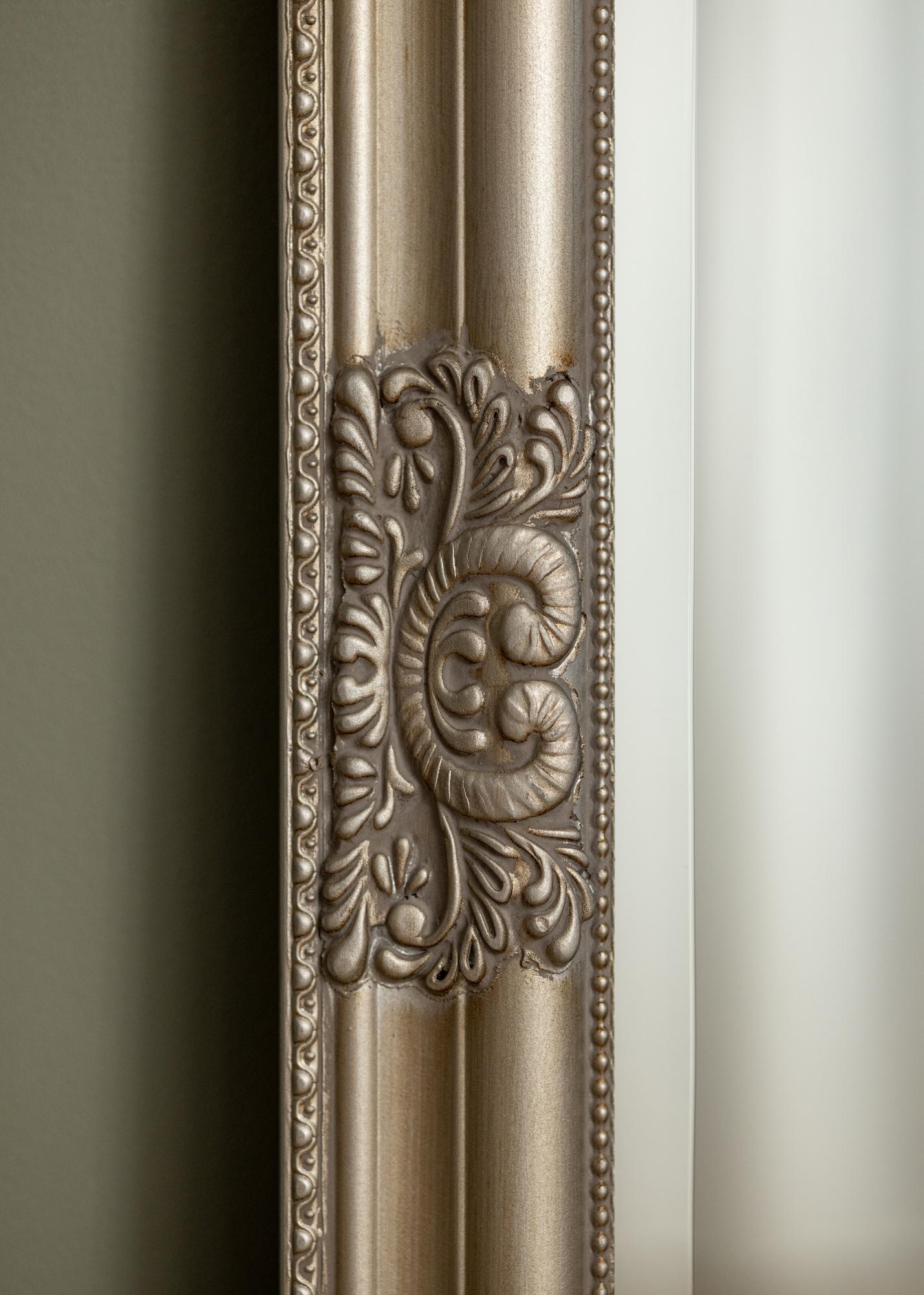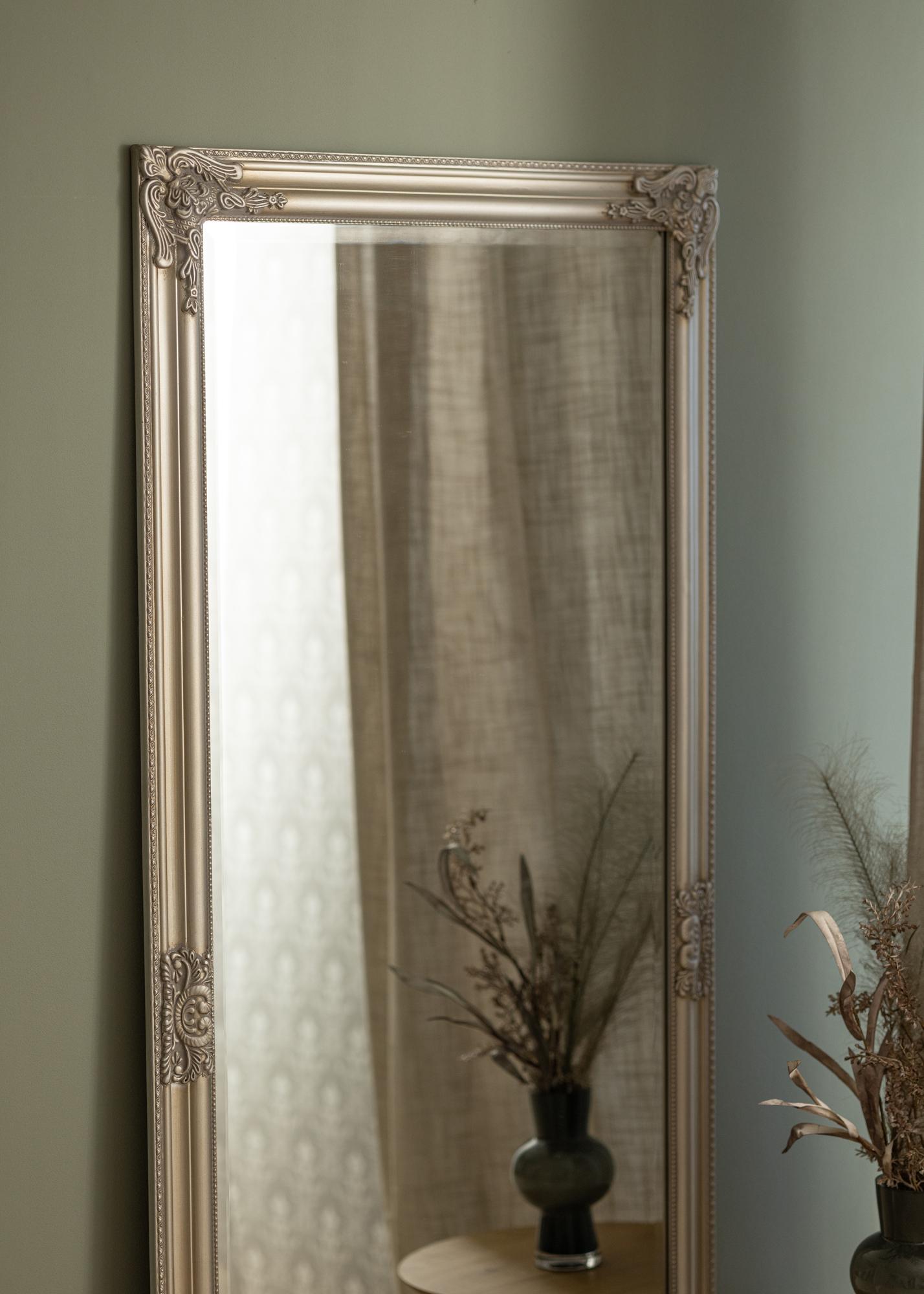Su marco ricamente ornamentado está lleno de finos detalles y patrones, lo que le da al espejo un encanto vintage difícil de resistir. El marco plateado resalta el brillante acabado del espejo y contribuye a crear una atmósfera lujosa en la habitación. Este espejo es el compañero ideal para aquellos que aprecian la elegancia clásica y desean crear un ambiente refinado y acogedor.