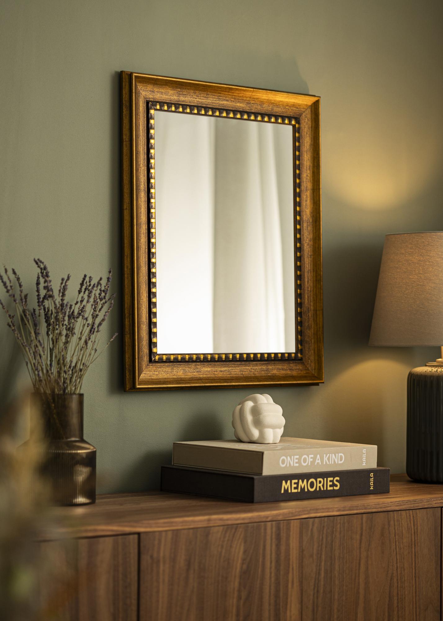 Este espejo tiene un color marrón cálido con un elegante acabado antiguo que brinda al espacio un encanto atemporal. El perfil ancho tiene un brillo sutil y está decorado con un distintivo detalle a rayas en oro y negro a lo largo del borde interior. Esto crea un hermoso contraste y atrae la mirada hacia el centro del espejo.