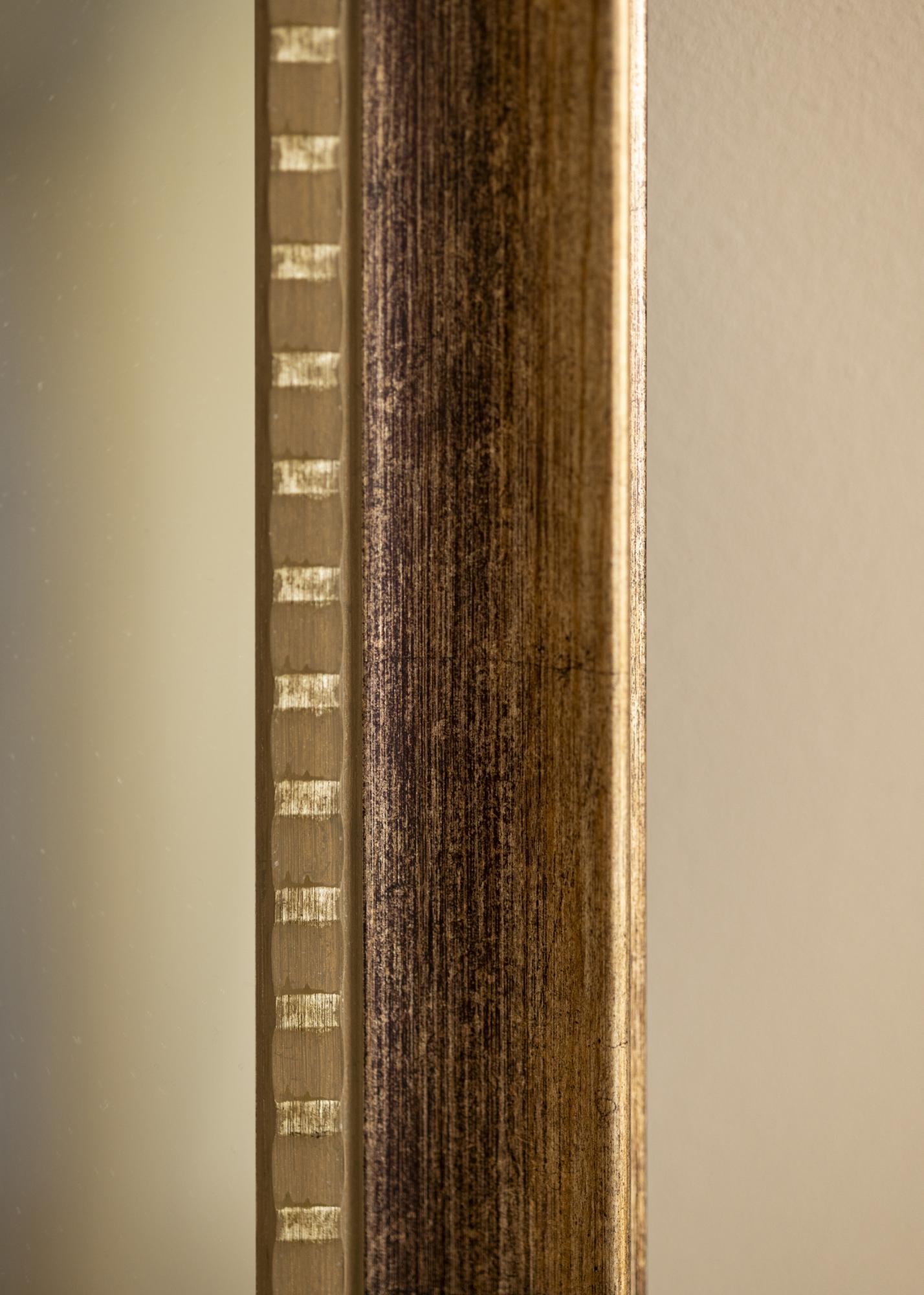 Un borde interior decorativo está adornado con pequeños detalles dorados regulares. Estos crean un elegante contraste con el tono más oscuro de la madera y añaden una dimensión extra de sofisticación. El borde exterior tiene un ligero bisel con un acabado dorado discreto, lo que otorga al marco una sensación lujosa y atemporal que nunca pasa de moda.