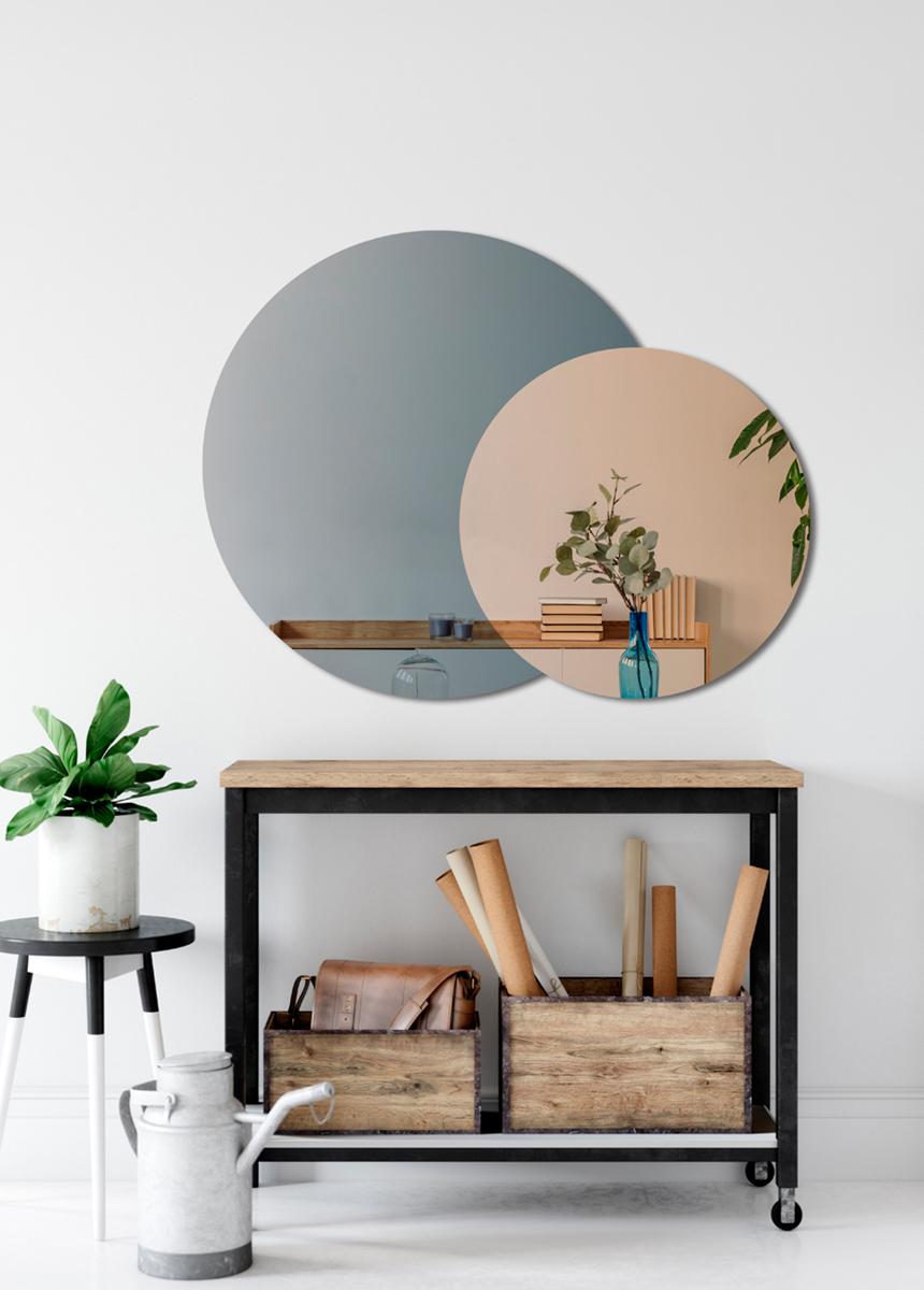 Este es un espejo fascinante y moderno de la marca danesa Incado que consta de dos espejos de forma circular que están unidos. La parte grande del espejo es incolora mientras que la parte más pequeña está tonalizada en dorado rosa - ¡un espejo elegante!