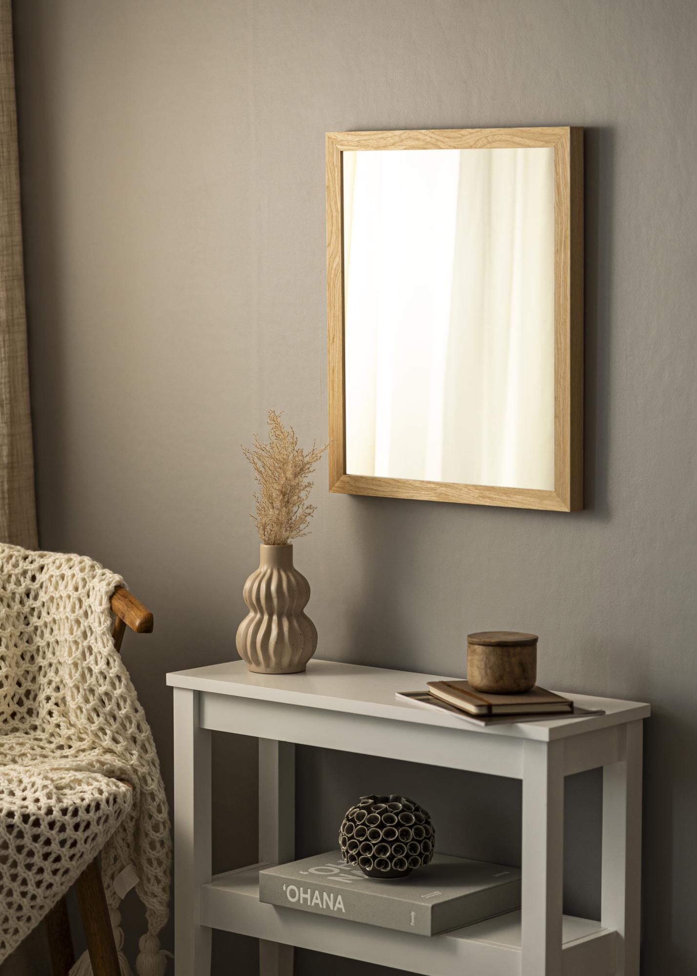 Este espejo tiene un elegante color beige que se integra en la mayoría de los estilos de decoración. El marco tiene un ancho de 28 mm y le da al espejo una sensación moderna y estilizada. Con una profundidad de 33 mm, el espejo tiene una construcción robusta que lo hace tanto duradero como estable. Fabricado en pino, ofrece un acabado cálido y natural de madera que crea una atmósfera acogedora en cualquier habitación donde se coloque.