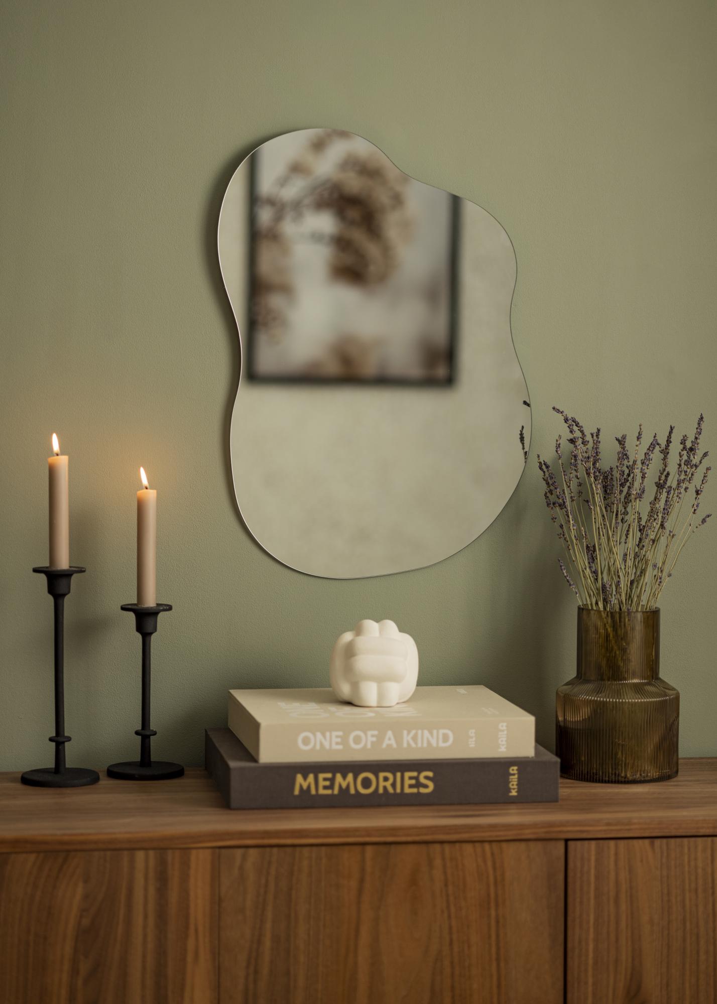 Curvy Cloud es un elegante espejo de pared con un diseño único y una forma asimétrica. Los bordes crean un suave diseño ondulado que, junto con la falta de marco de espejo, da una impresión minimalista. Incluso el fino vidrio del espejo de 4 mm contribuye a esa sensación. El espejo se puede fijar a la pared con la ayuda de los soportes en la parte trasera.