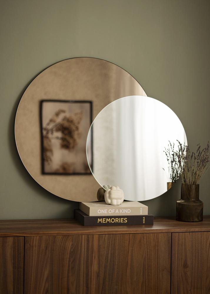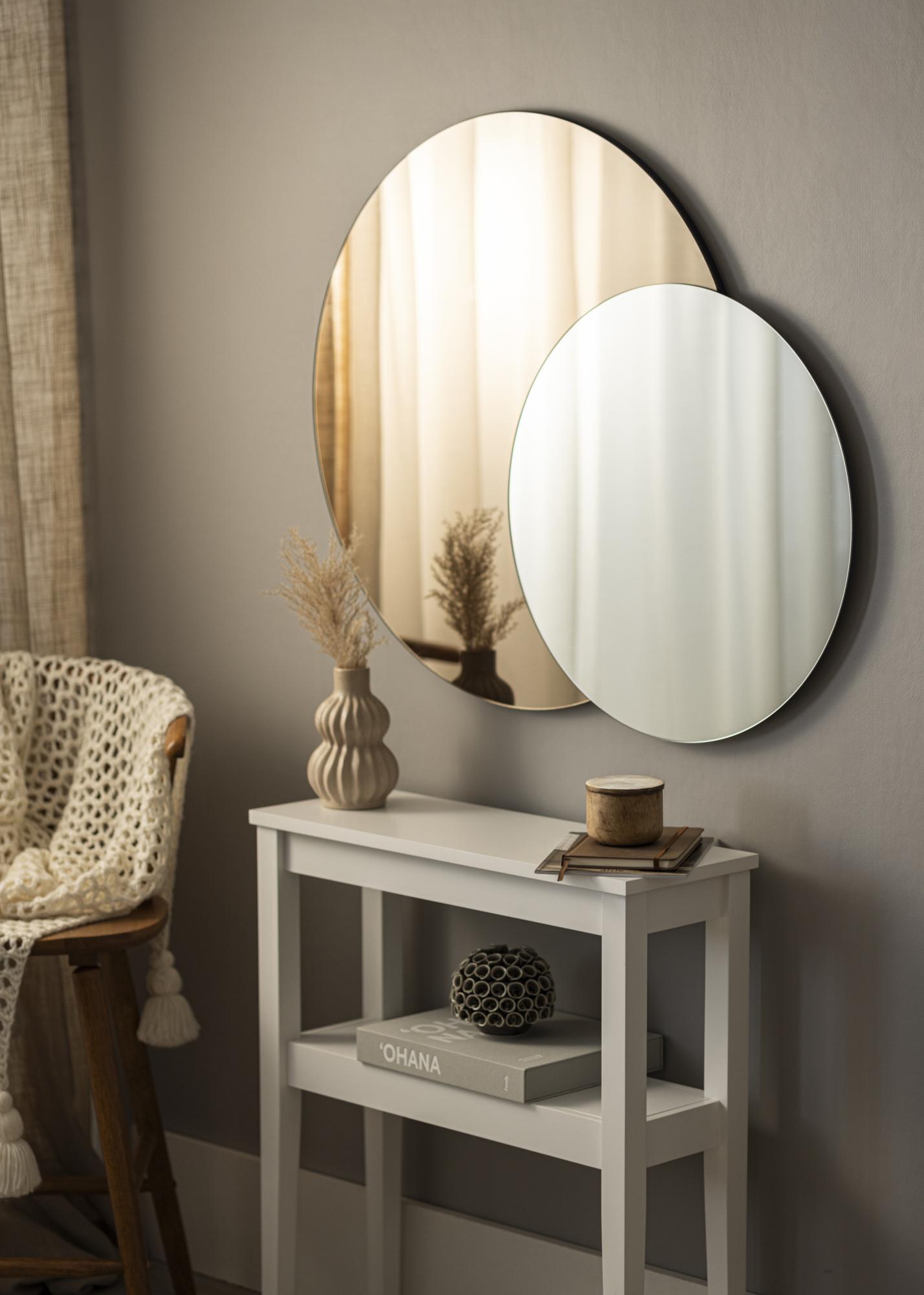 Danska Incado está detrás de este ingenioso espejo que consta de dos espejos redondos unidos. Tiene un tamaño de 80x100 cm y un diseño único. Una parte es de bronce oscuro y la otra es incolora.