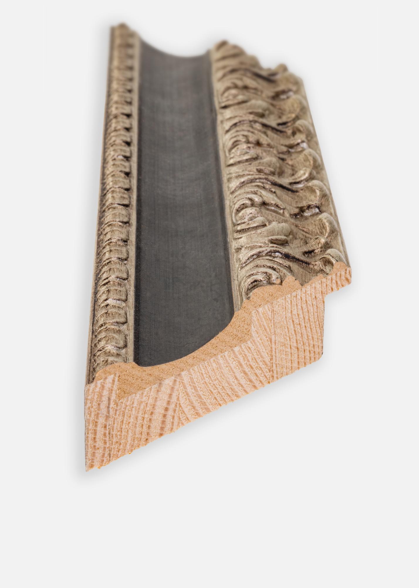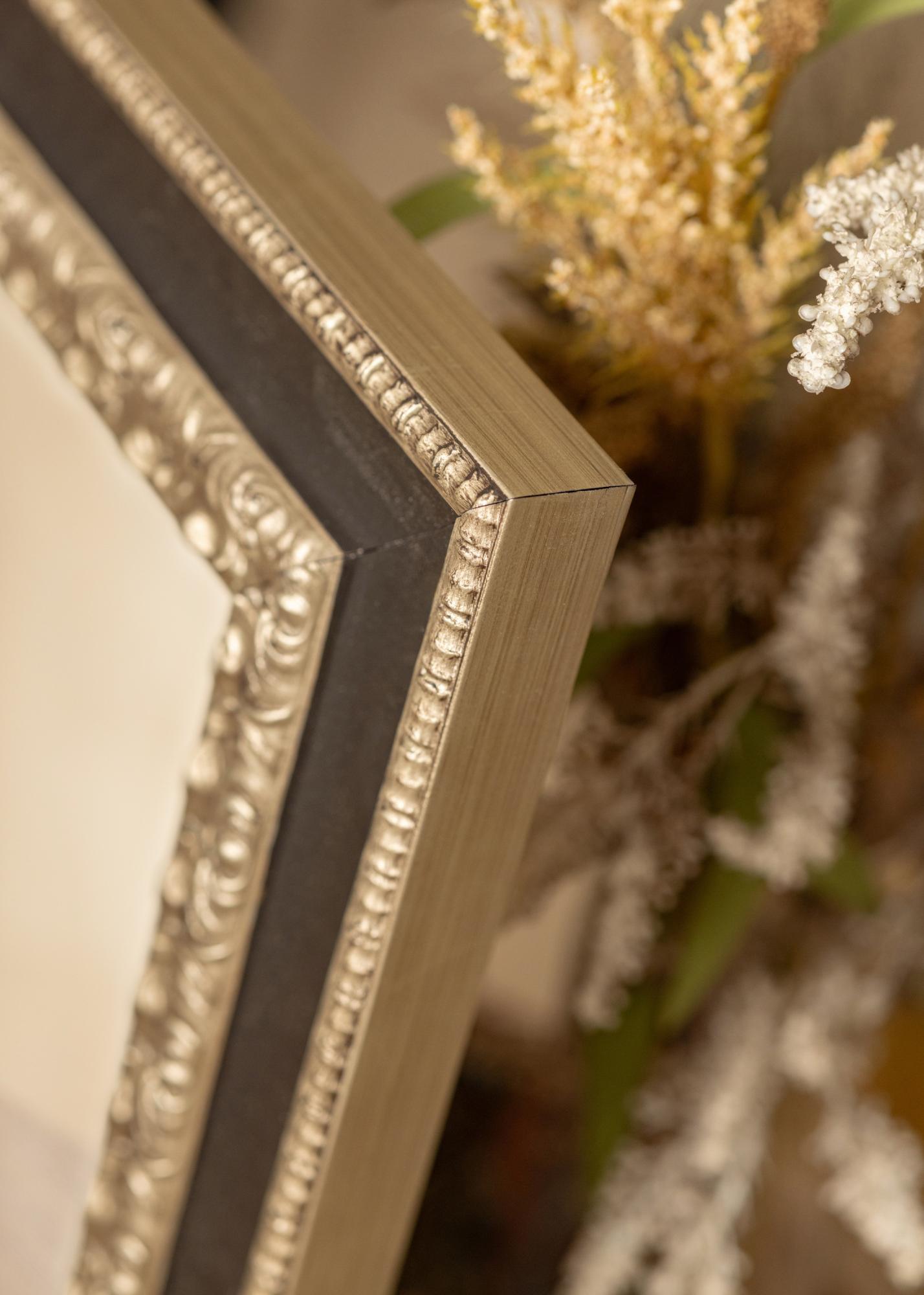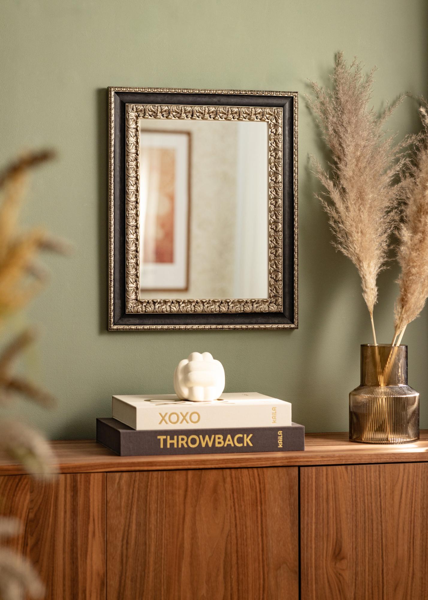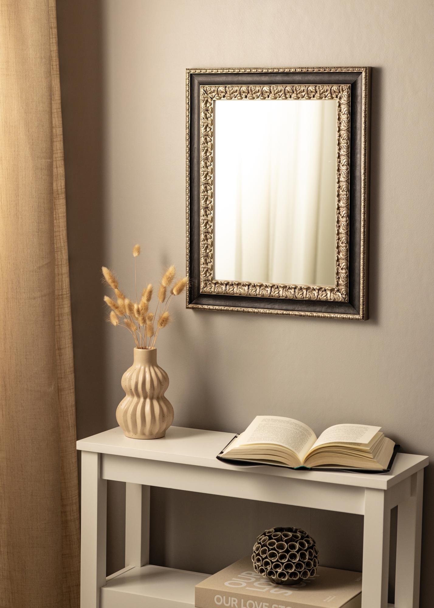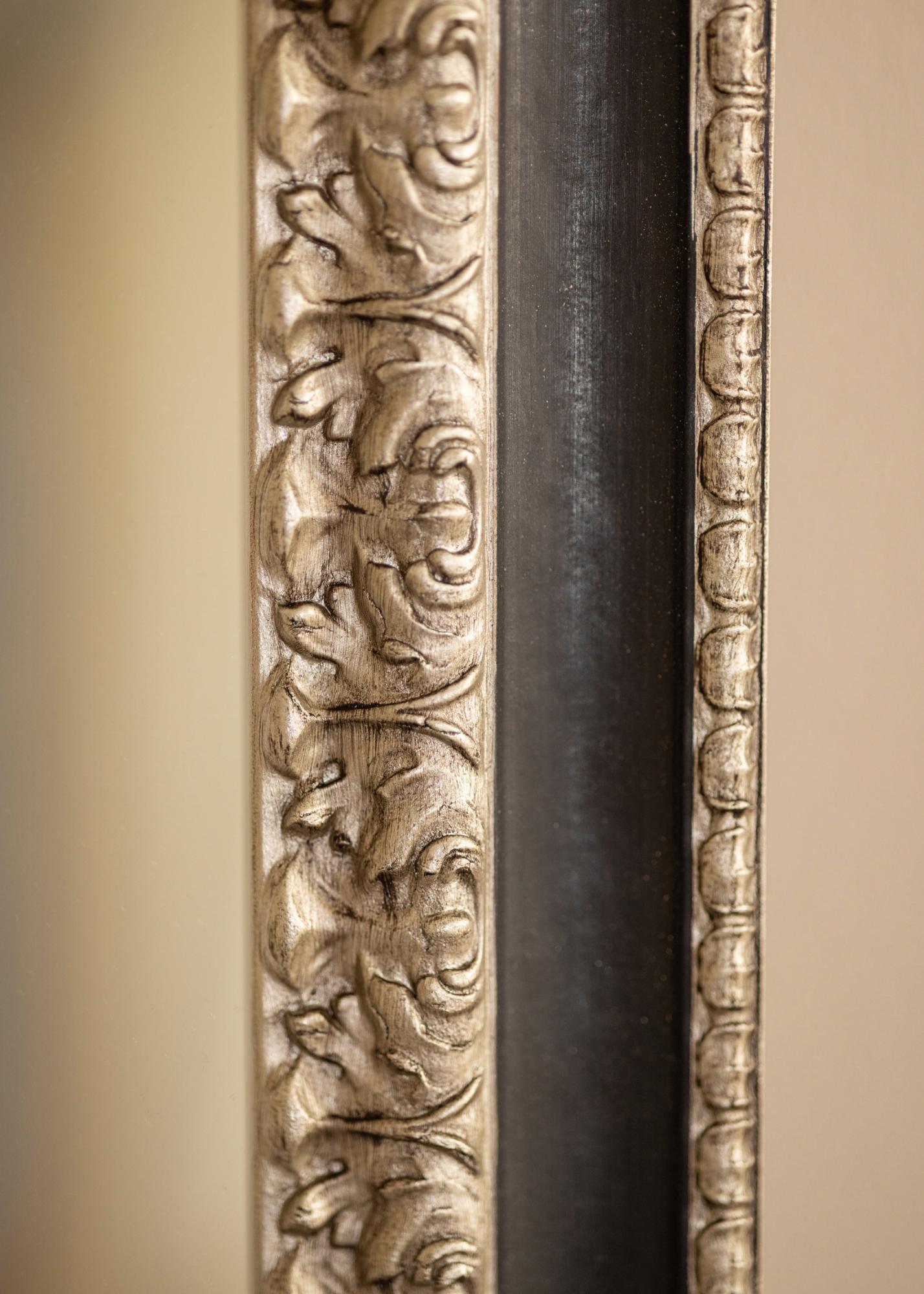 "Drottningholm Plateado" es un hermoso espejo de estilo retro de Italia, hecho de pino ensamblado con dedos y pintado a mano. El espejo tiene un perfil plateado ricamente decorado con un borde negro ancho que le da a la moldura su elegante sensación.