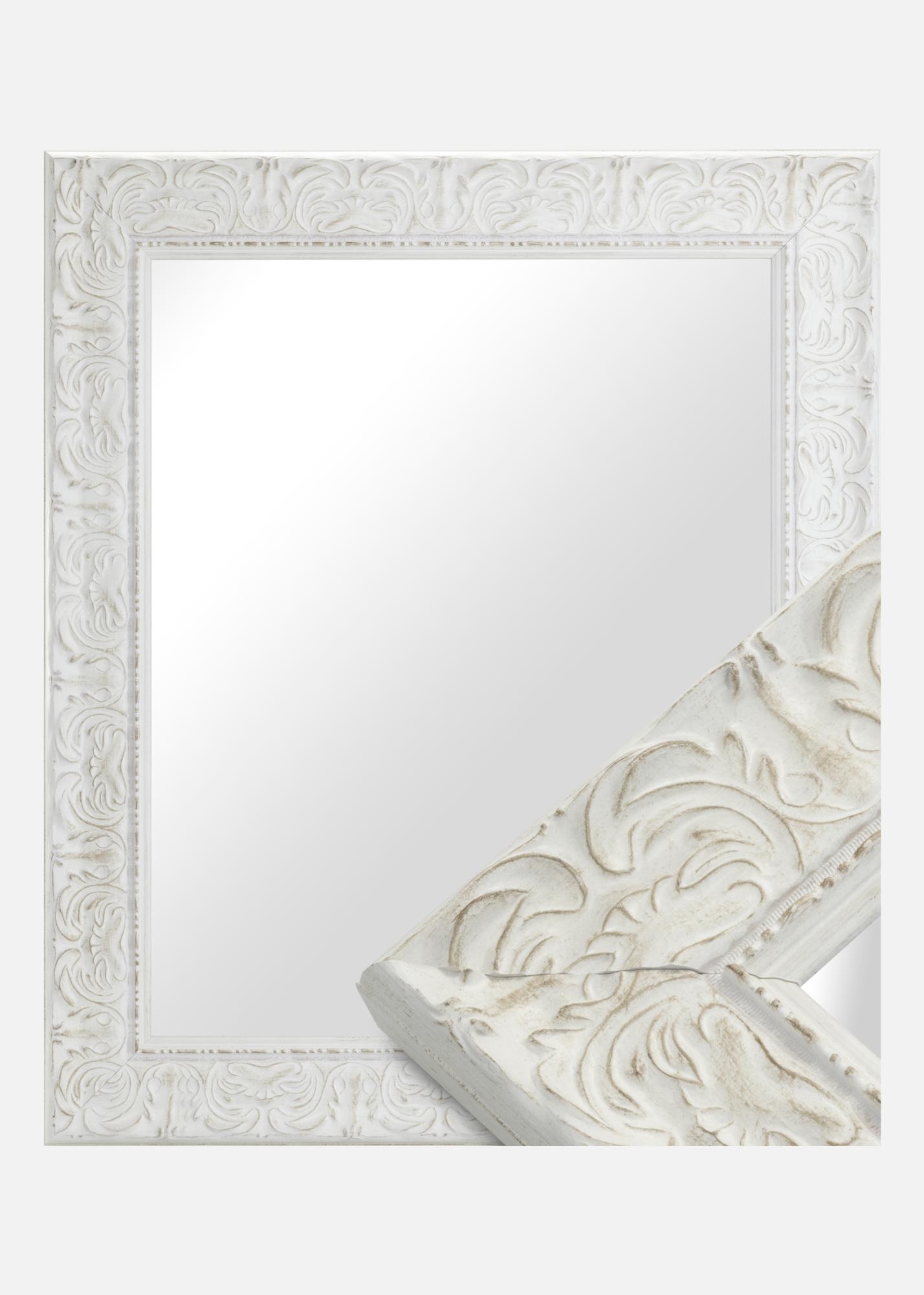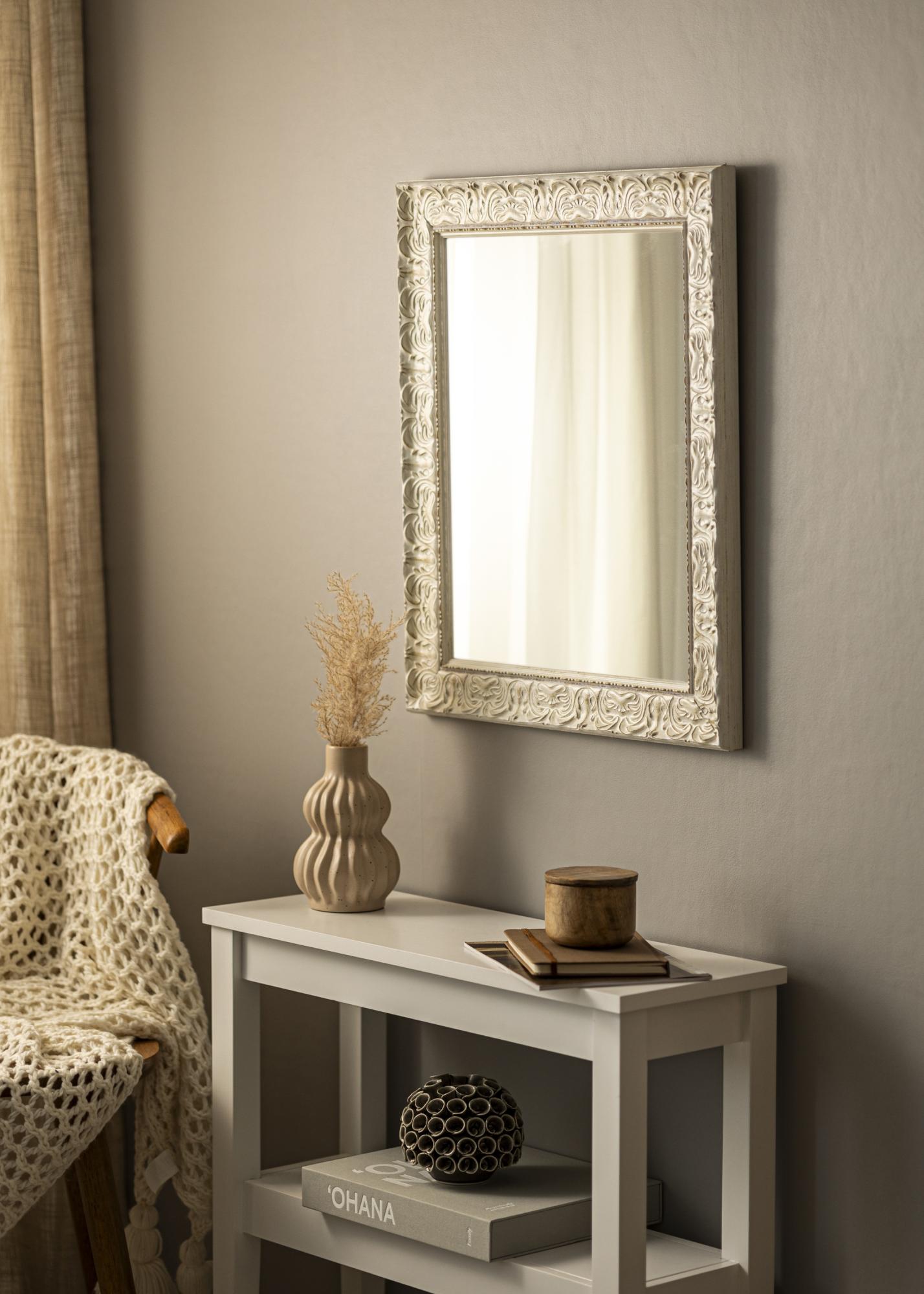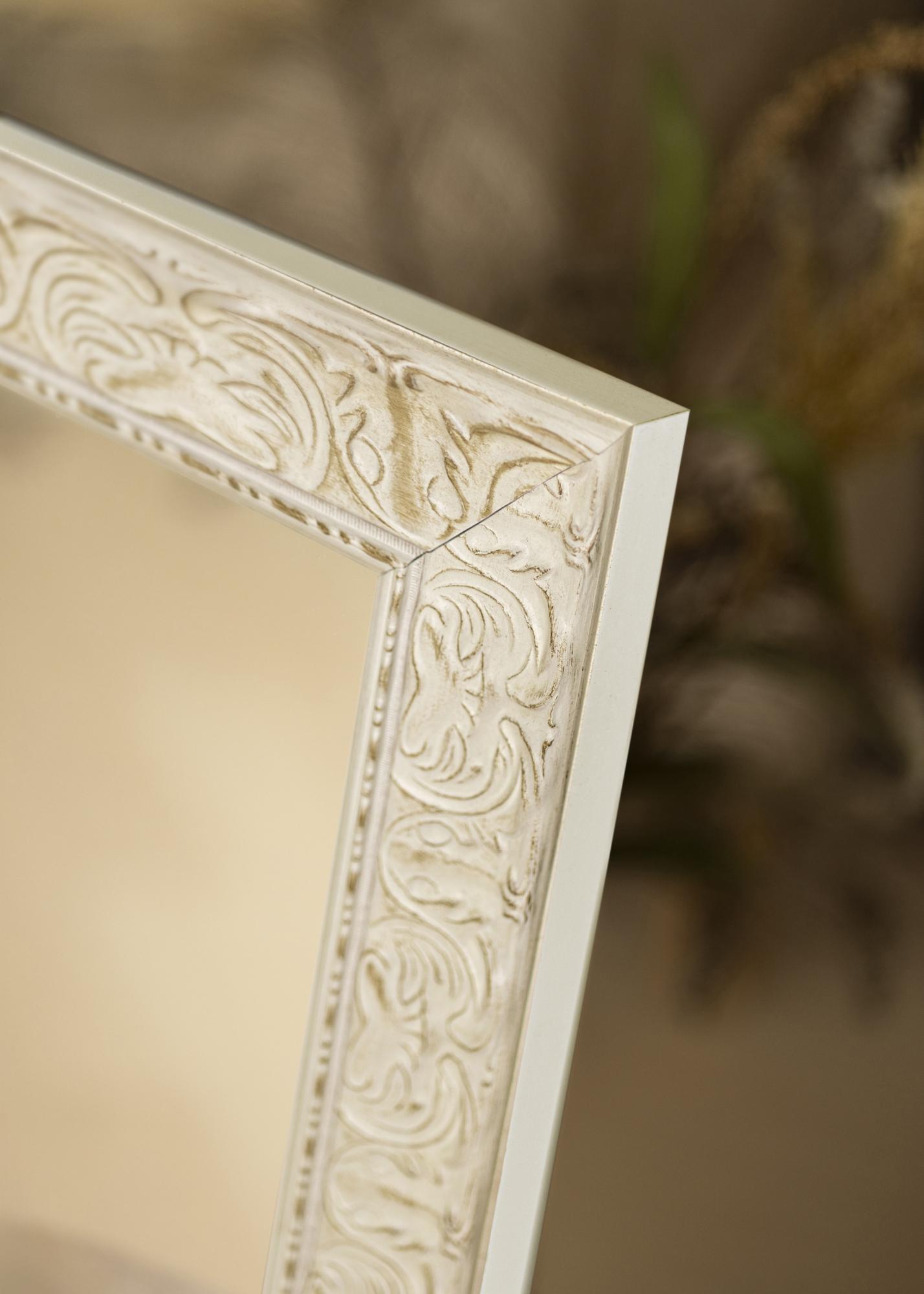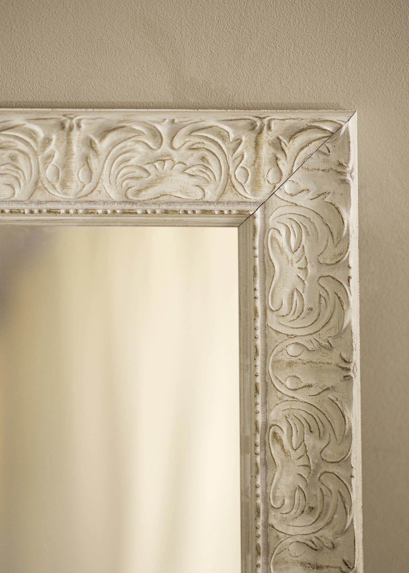 El acabado blanco antiguo del espejo con relieve decorativo y superficie sutilmente gastada le confiere un carácter único. Los detalles ornamentados refuerzan su expresión clásica y lo convierten en un punto focal de la habitación. Ya sea que tengas una decoración moderna o tradicional, este espejo se integrará y al mismo tiempo aportará algo extra.