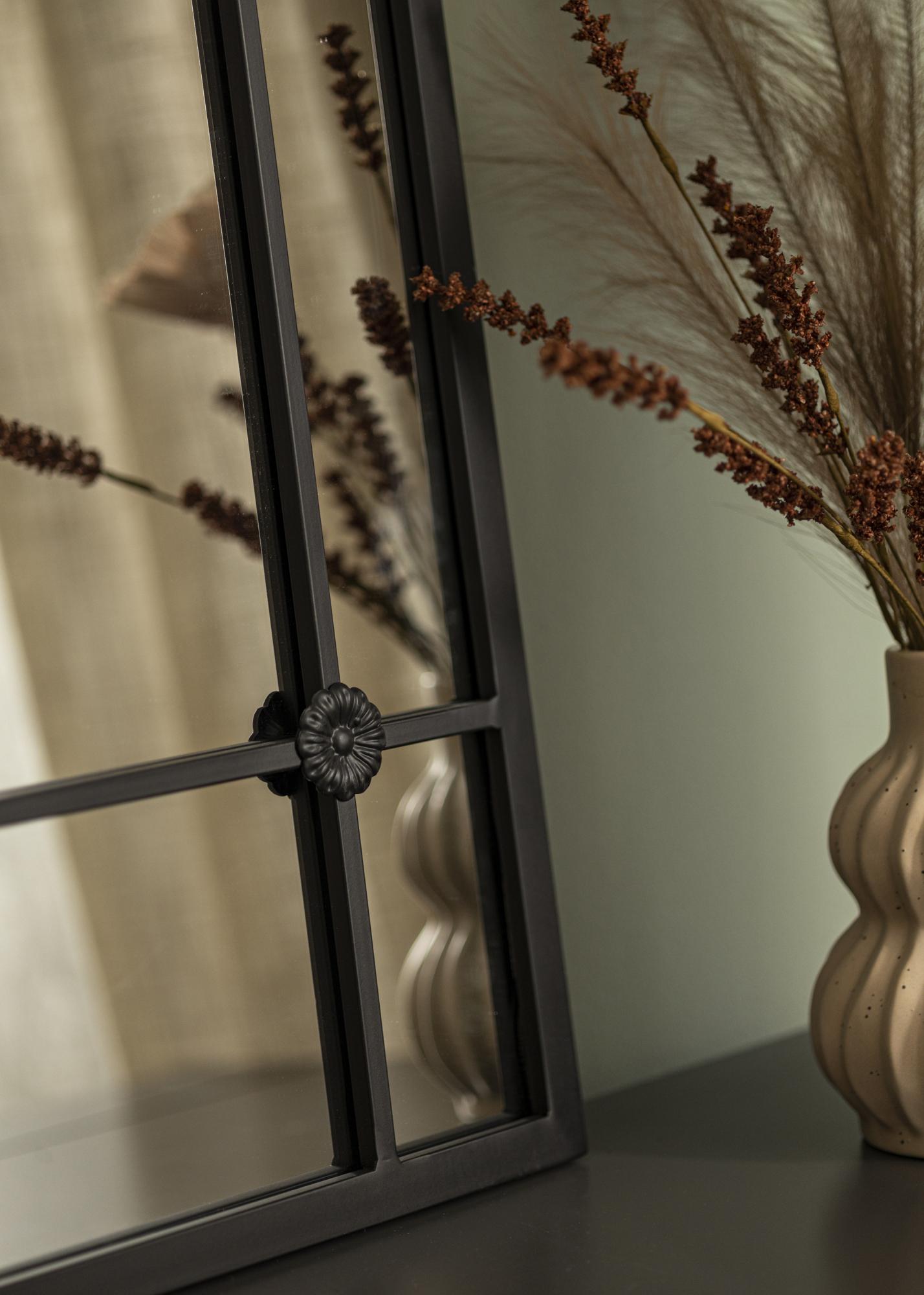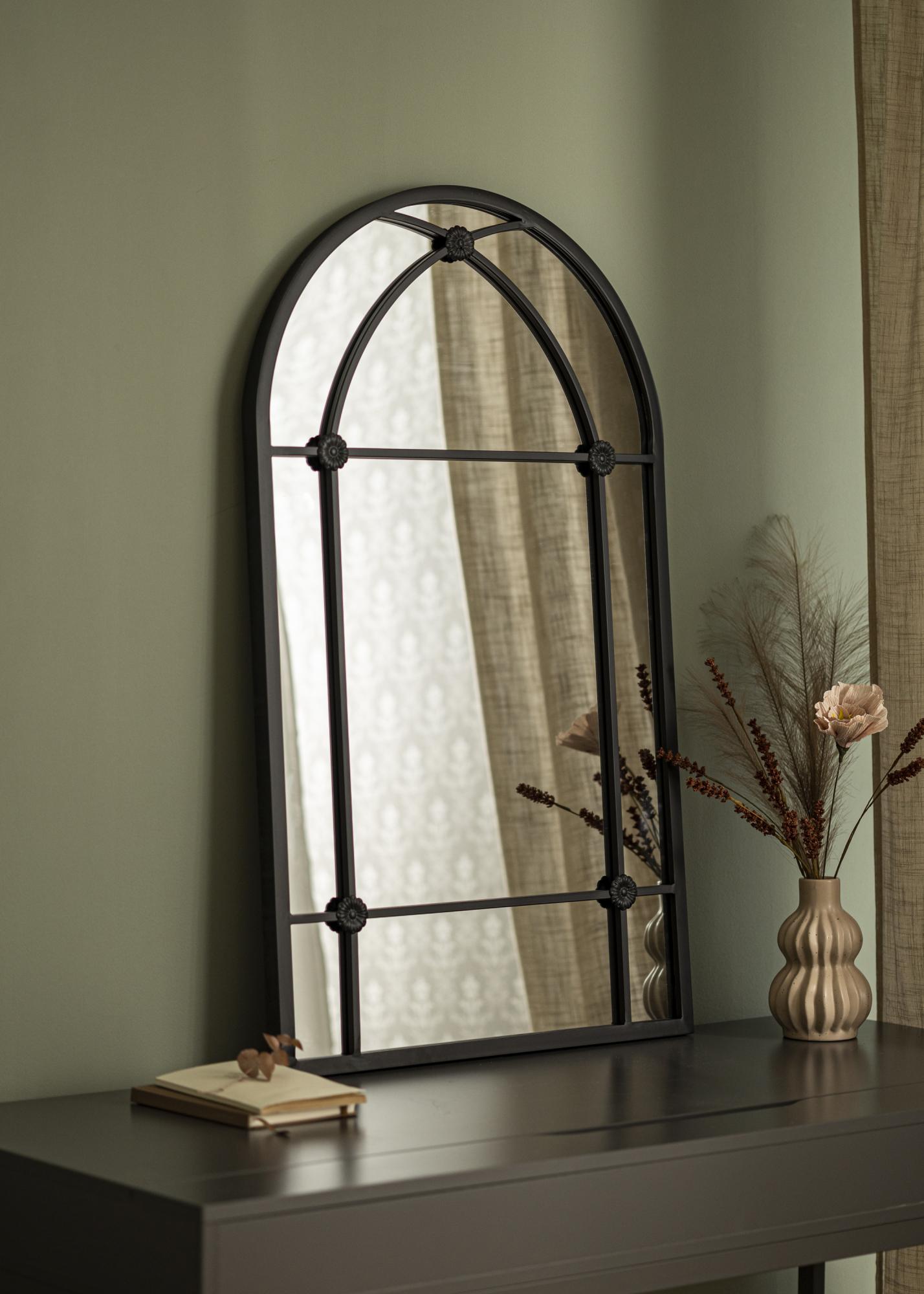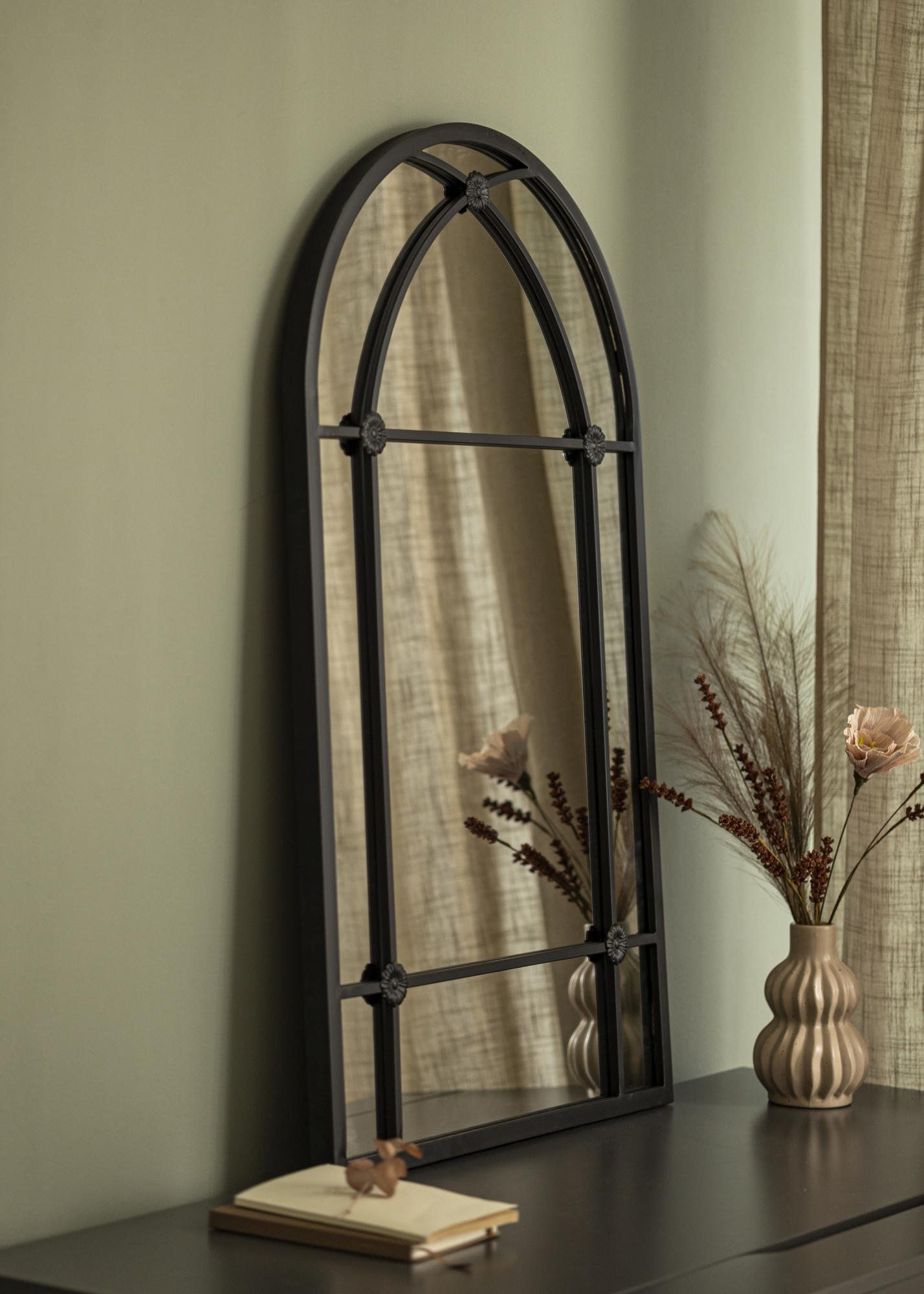 Con su silueta arqueada y su detallado trabajo de hierro, este espejo recuerda a las clásicas ventanas que aportan una sensación de profundidad y amplitud a la habitación. No solo es un objeto práctico para el uso diario, sino también un elemento decorativo artístico que captura la atención y contribuye a la atmósfera del espacio.