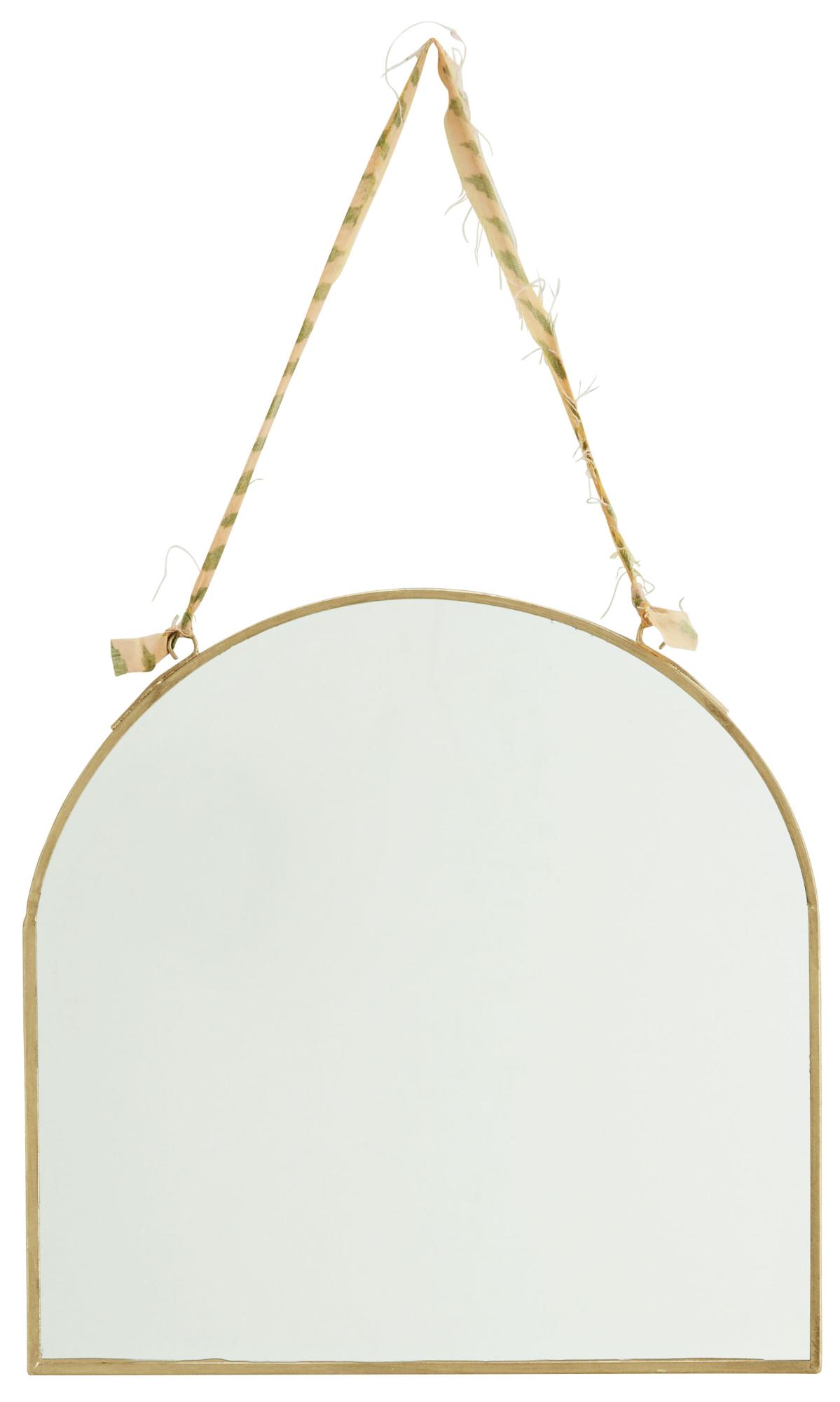 Espejo en forma de bóveda de Madam Stoltz, con marco de color latón. El espejo se cuelga con una cinta de algodón, lo que le da una expresión bohemia que se adapta perfectamente a salas de estar y dormitorios. El espejo de pared mide 23x23 cm. El tamaño compacto hace que el espejo de pared sea muy elegante para combinar con otros modelos de espejos.