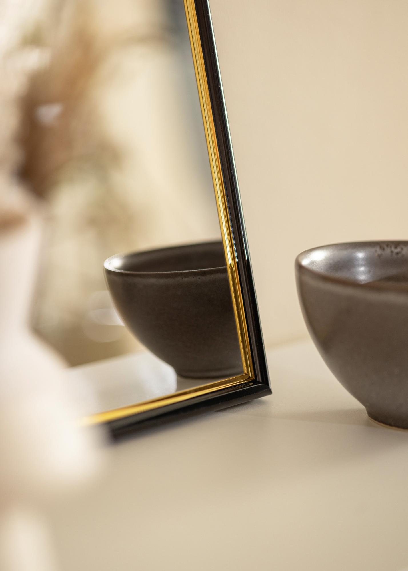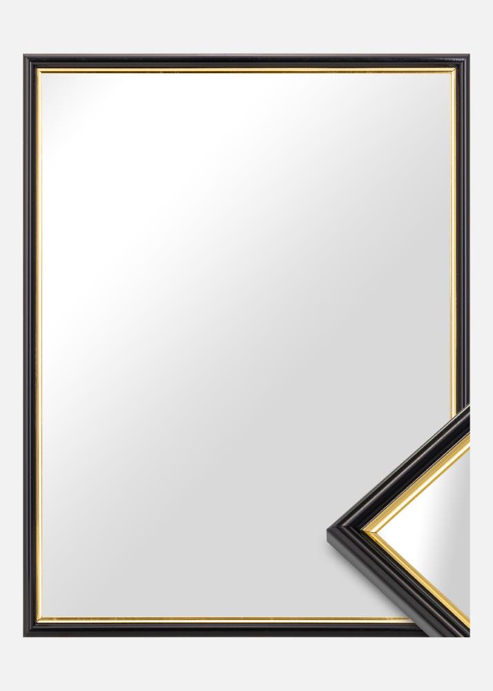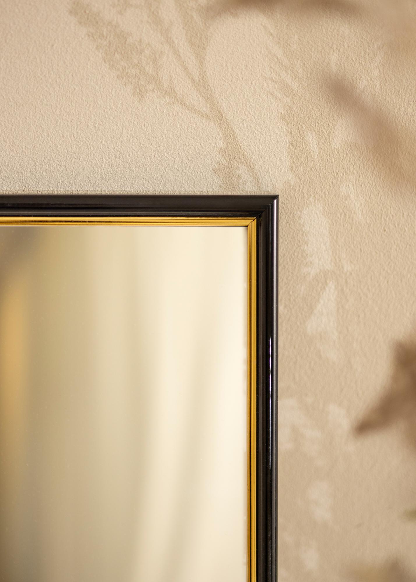 Cambia la atmósfera en el recibidor, el baño o la sala de estar cuando cuelgues este lujoso espejo. El espejo es negro con una parte dorada cerca del cristal. Los colores combinan bien con detalles de decoración en negro, dorado, lila o tonos pastel. Debido a que se fabrica según tus deseos, puedes estar seguro de que encajará perfectamente donde lo quieras.