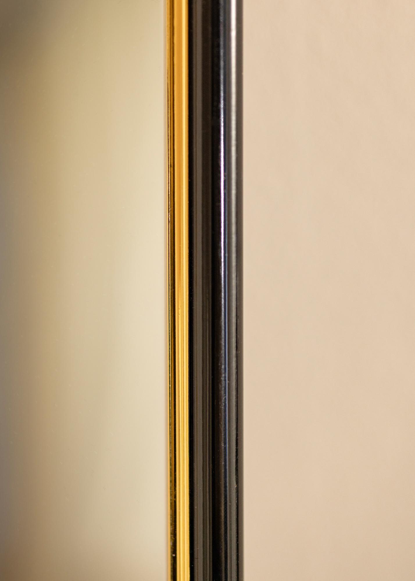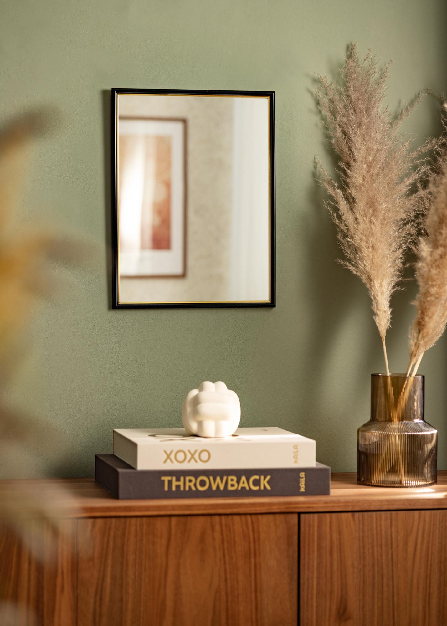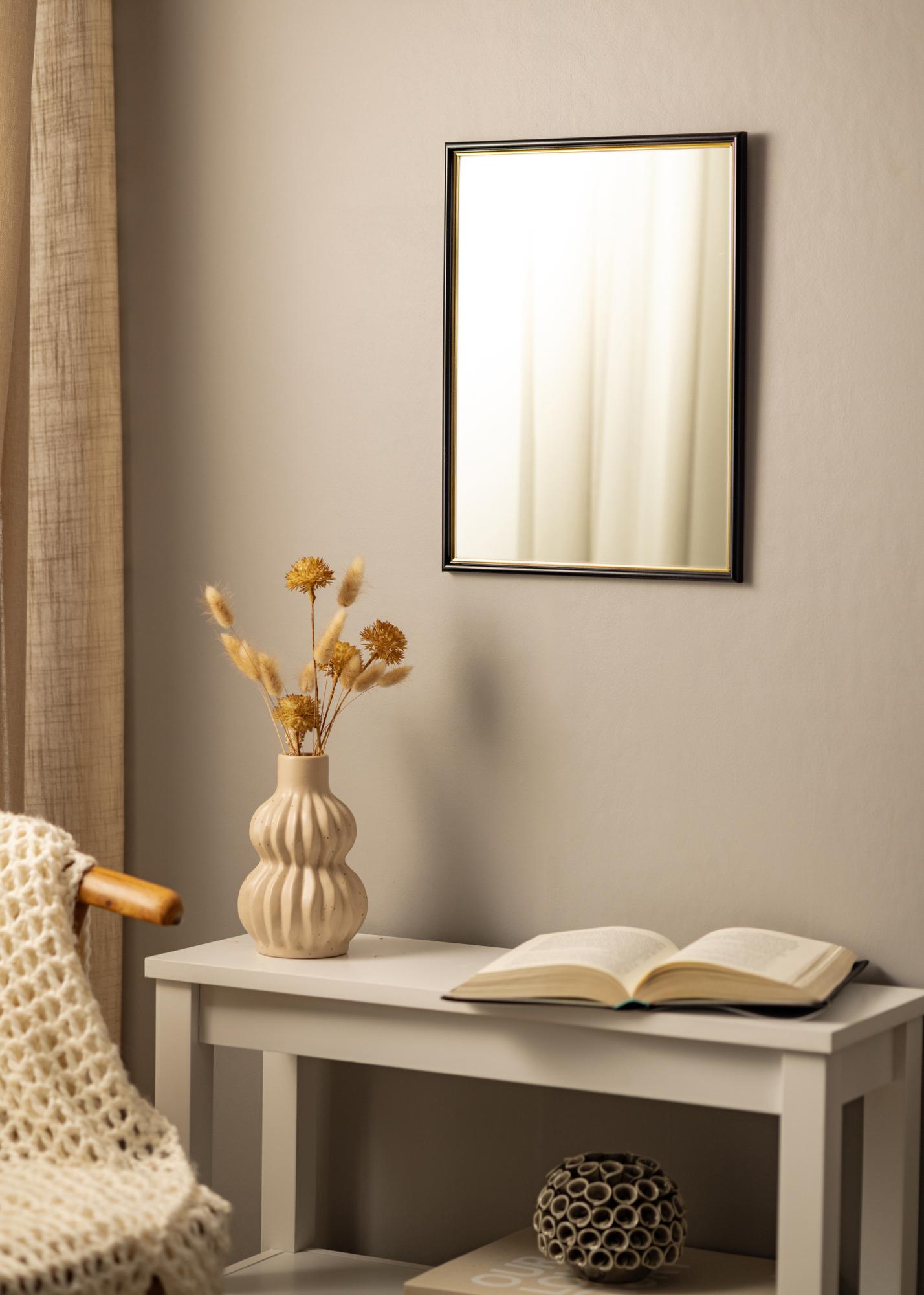 Cambia la atmósfera en el recibidor, el baño o la sala de estar cuando cuelgues este lujoso espejo. El espejo es negro con una parte dorada cerca del cristal. Los colores combinan bien con detalles de decoración en negro, dorado, lila o tonos pastel. Debido a que se fabrica según tus deseos, puedes estar seguro de que encajará perfectamente donde lo quieras.