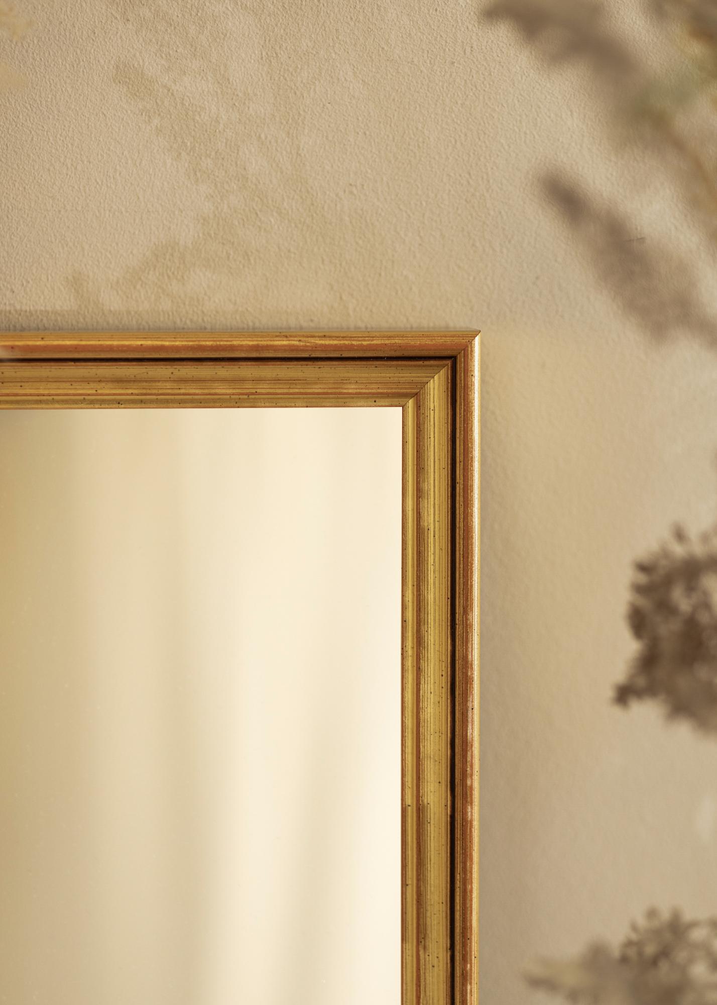 Este espejo tiene una profundidad de 39 mm, lo que le da una sensación robusta sin ser demasiado pesado o dominante. Fabricado de pino, combina durabilidad con una ligereza que facilita su montaje en la pared. La superficie dorada tiene un ligero acabado antiguo con pequeños detalles oscuros, creando un carácter atemporal que se adapta tanto a estilos de decoración modernos como clásicos.