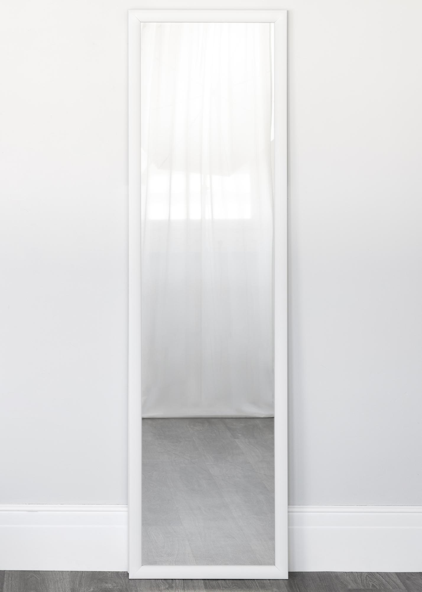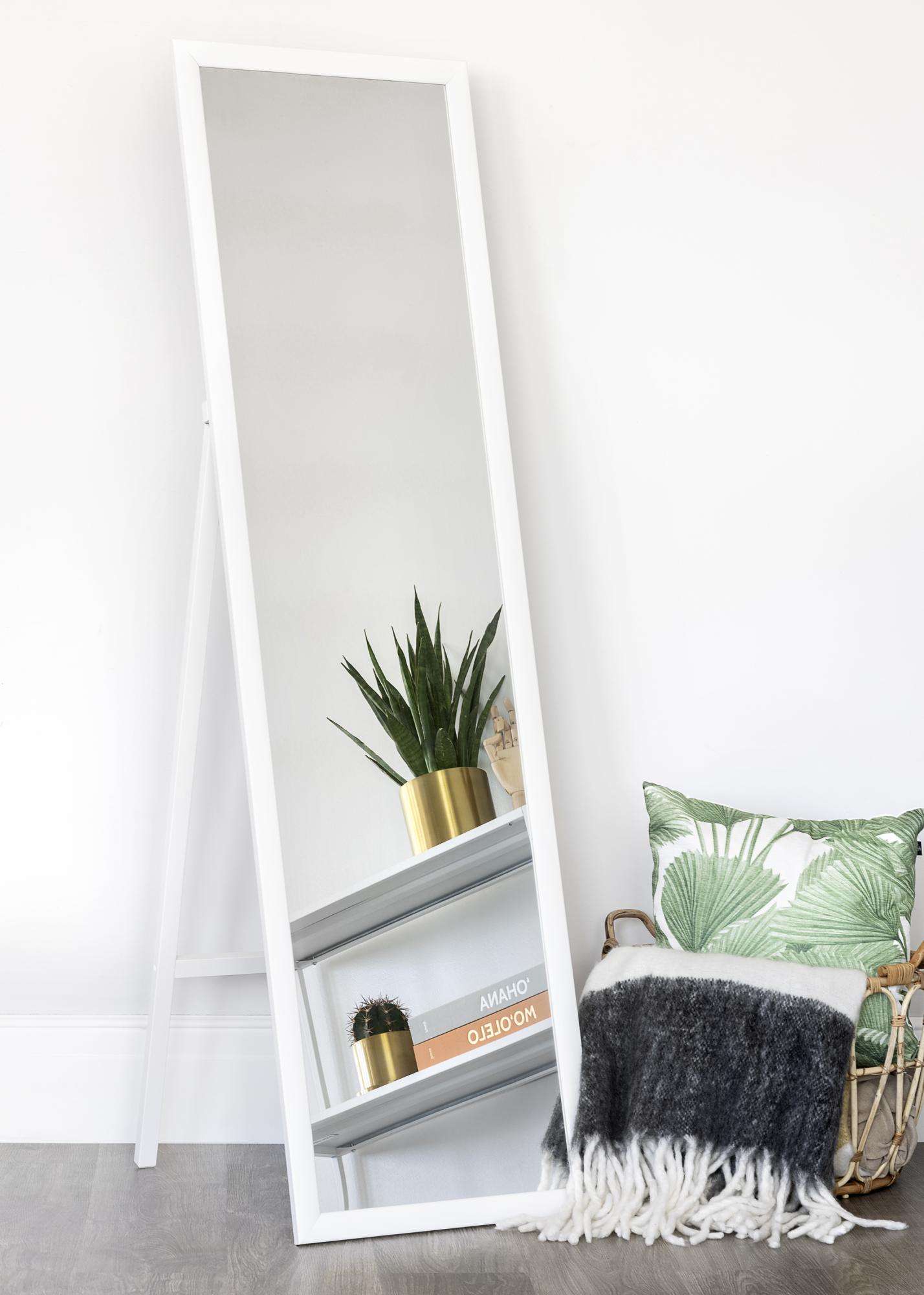 Espejo de suelo blanco en madera que se adapta perfectamente a entornos donde se necesita un espejo de cuerpo entero pero falta espacio en la pared para colgarlo. El aspecto elegante y el color del espejo hacen que se adapte a todos los tipos de decoración y esquemas de color. Es ideal para colocar en un vestidor con un área de suelo más grande o en el dormitorio, que funciona como almacenamiento para la ropa. El espejo es práctico ya que es fácil de mover según sea necesario.