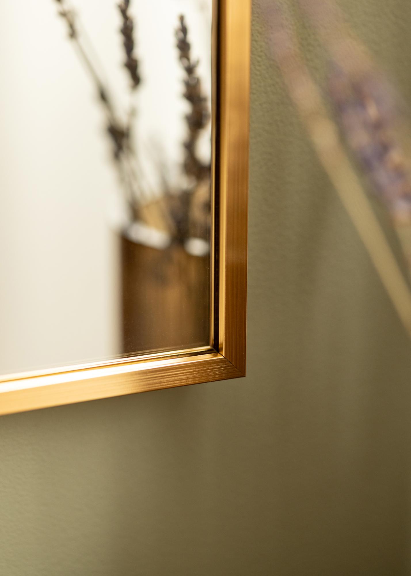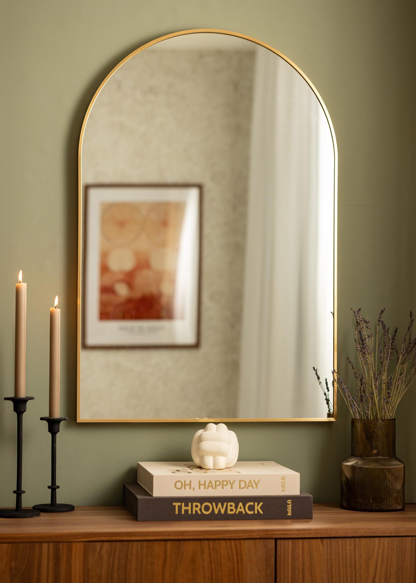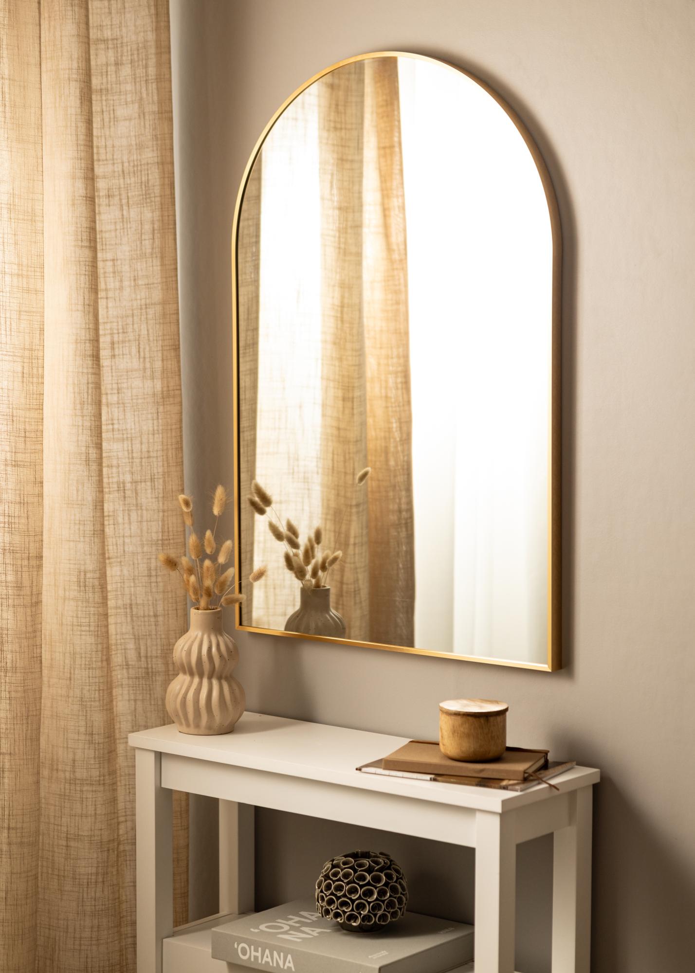 Este es un espejo de pared moderno que se puede utilizar en cualquier habitación. Puedes dejarlo como un detalle moderno en el dormitorio o la sala de estar, o usarlo como espejo de baño o espejo de entrada para poder reflejarte adecuadamente cuando te preparas para el día. El espejo tiene un marco de metal de 28 mm de profundidad, con un exclusivo tono dorado que le da una finura excepcional. La elegante forma inspirada en el arco refuerza aún más la expresión de lujo.