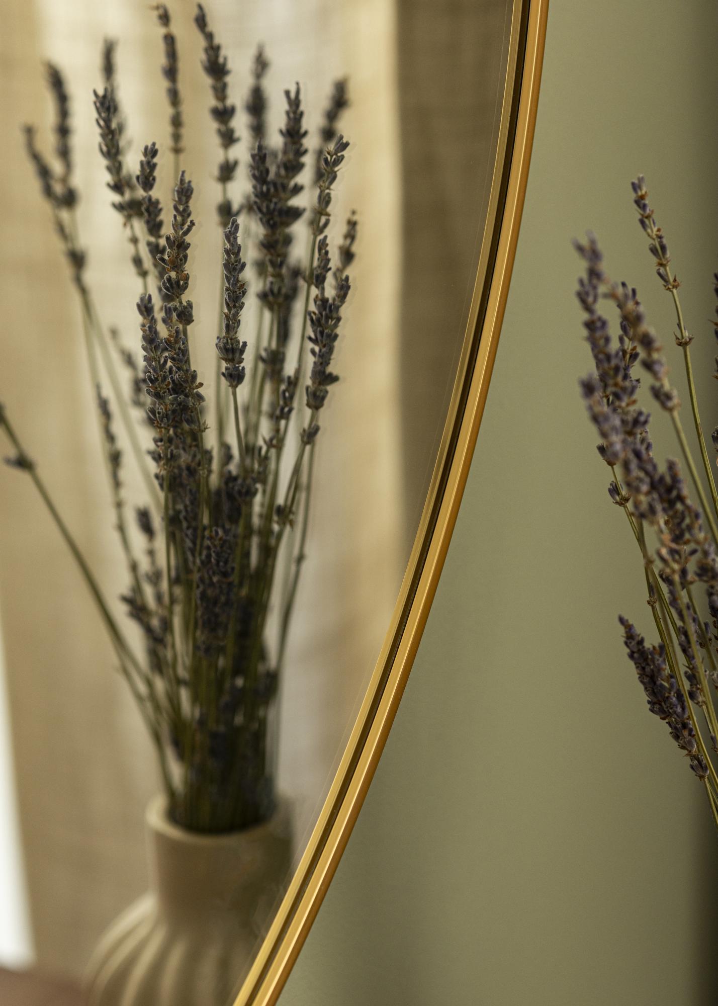 Este espejo de pared tiene una forma redonda clásica que está rodeada por un marco de aluminio con tono dorado elegante. El color y brillo del marco crean una atmósfera lujosa y se convierte en un detalle llamativo en cualquier pared. La forma redonda contribuye a una sensación suave y armoniosa en la habitación.