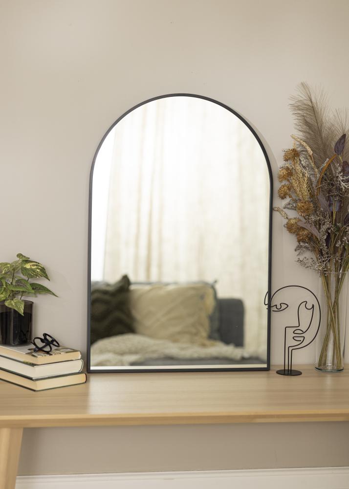 Esta es una excelente opción para aquellos que buscan un espejo de diseño moderno con una elegante forma arqueada y un elegante marco negro. El marco del espejo tiene 28 mm de profundidad y está hecho de metal. Este espejo se convertirá en un detalle decorativo imprescindible en el recibidor o la sala de estar, donde reflejará la luz de todas las fuentes de luz de la habitación de manera hermosa. El material resistente también permite su uso en el baño.