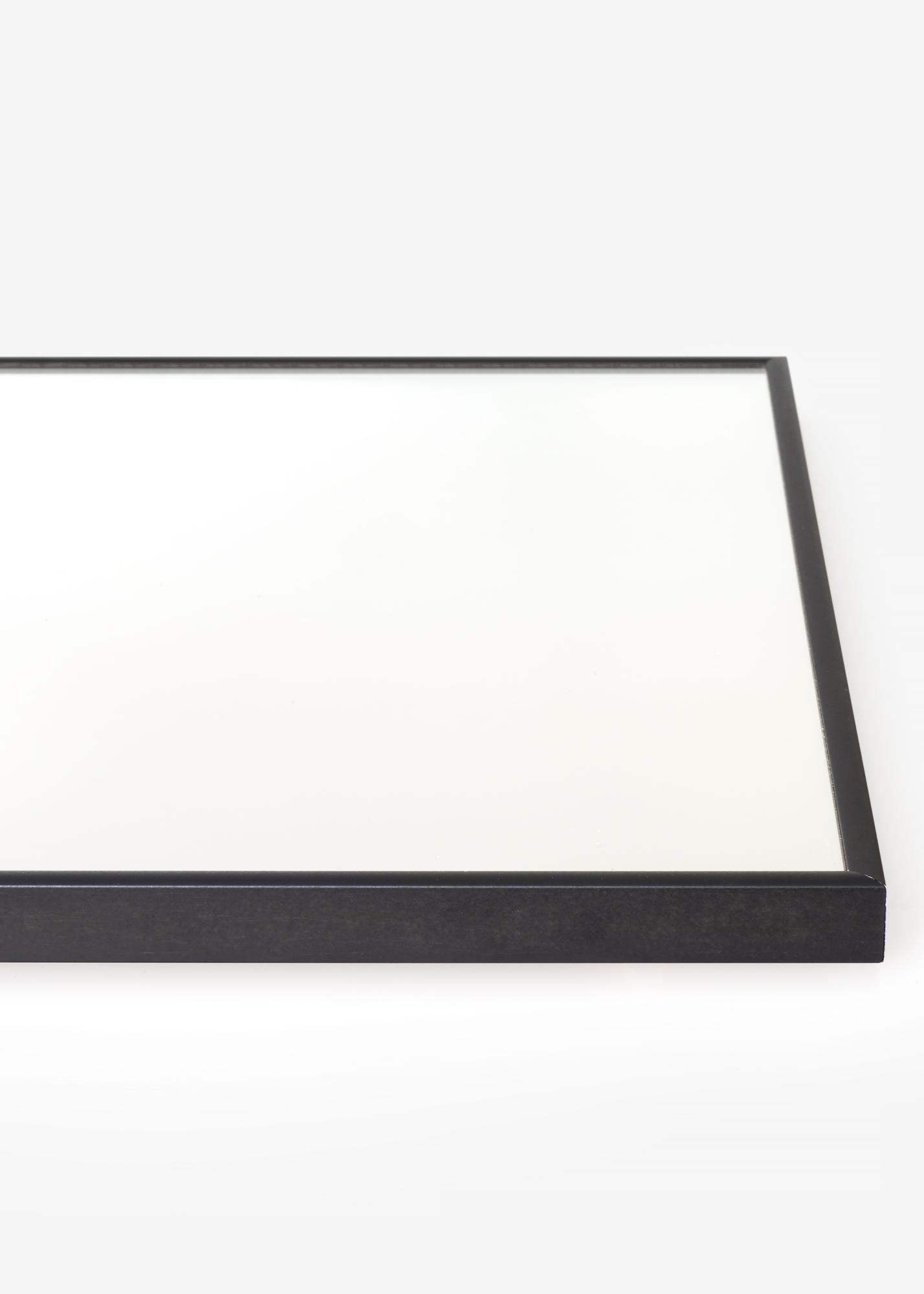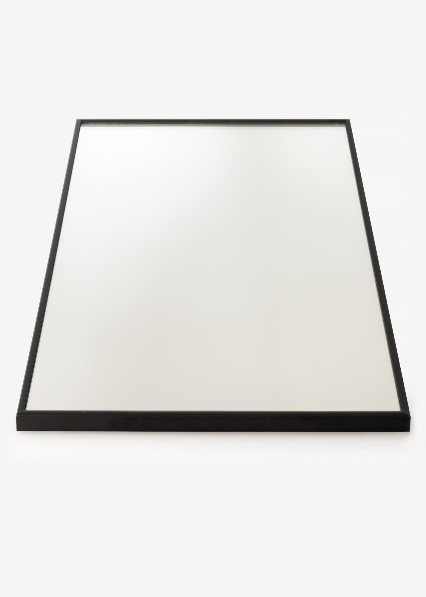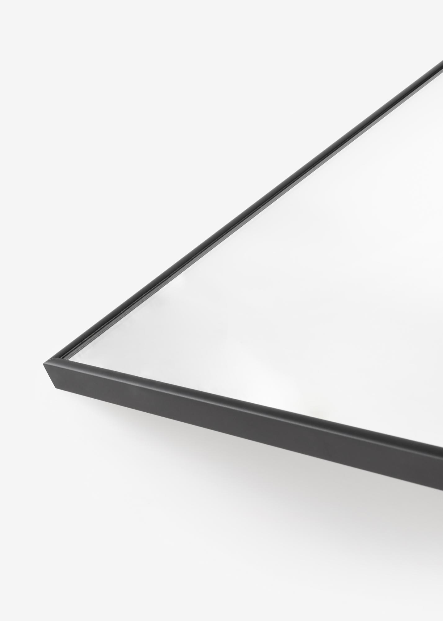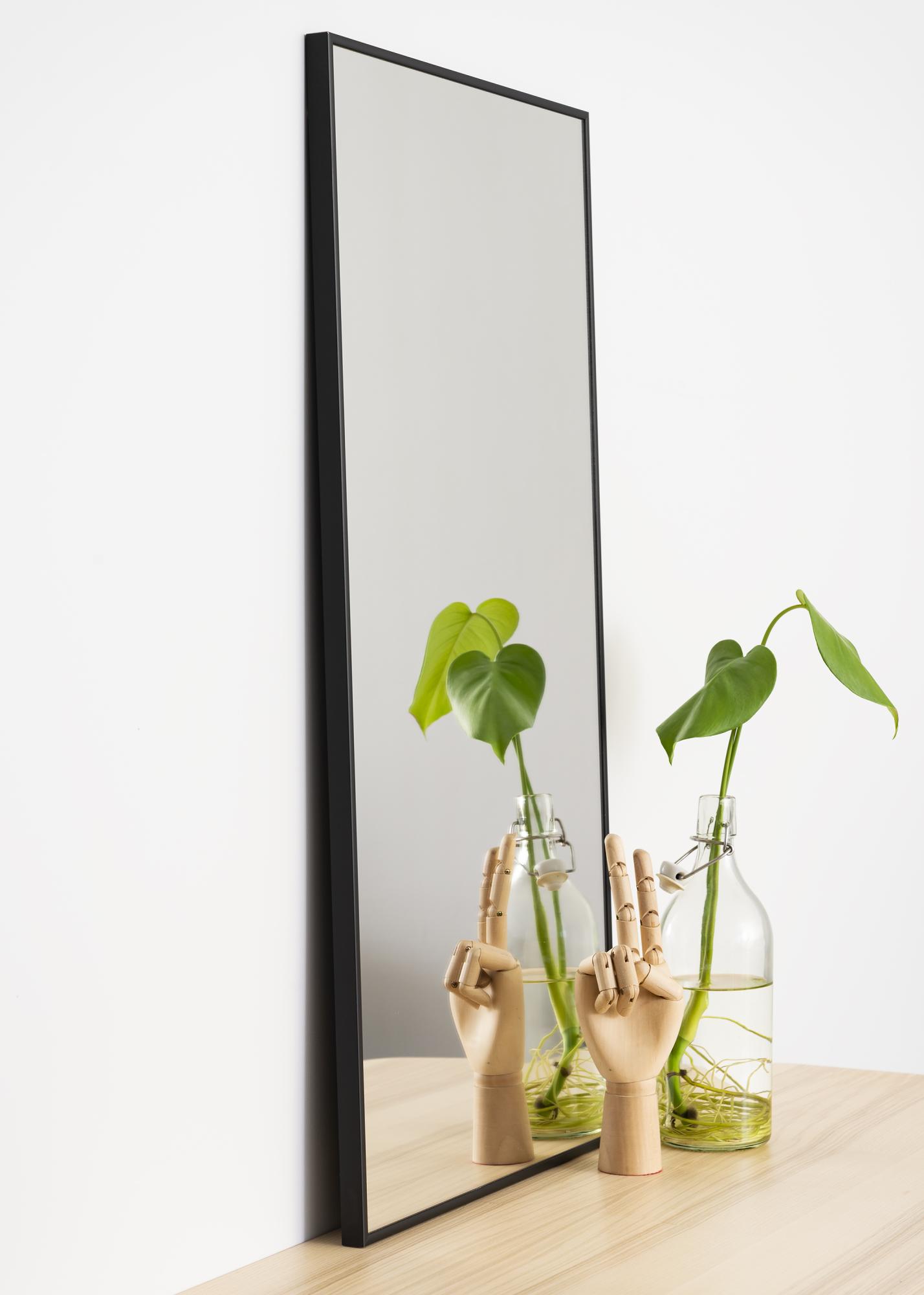 Un elegante espejo con marco de aluminio negro. El espejo está equipado con soportes de pared inteligentes, lo que facilita su colocación.