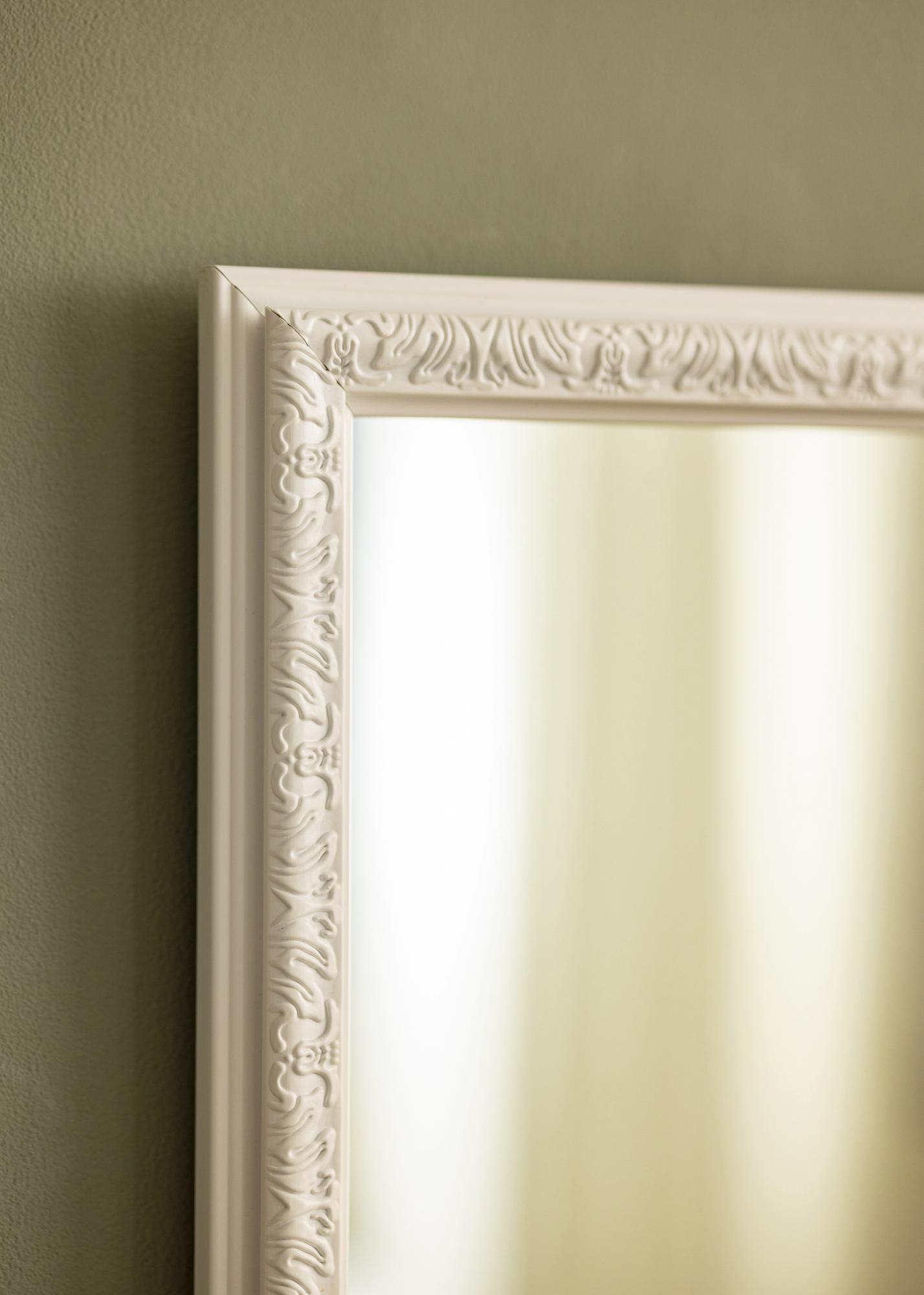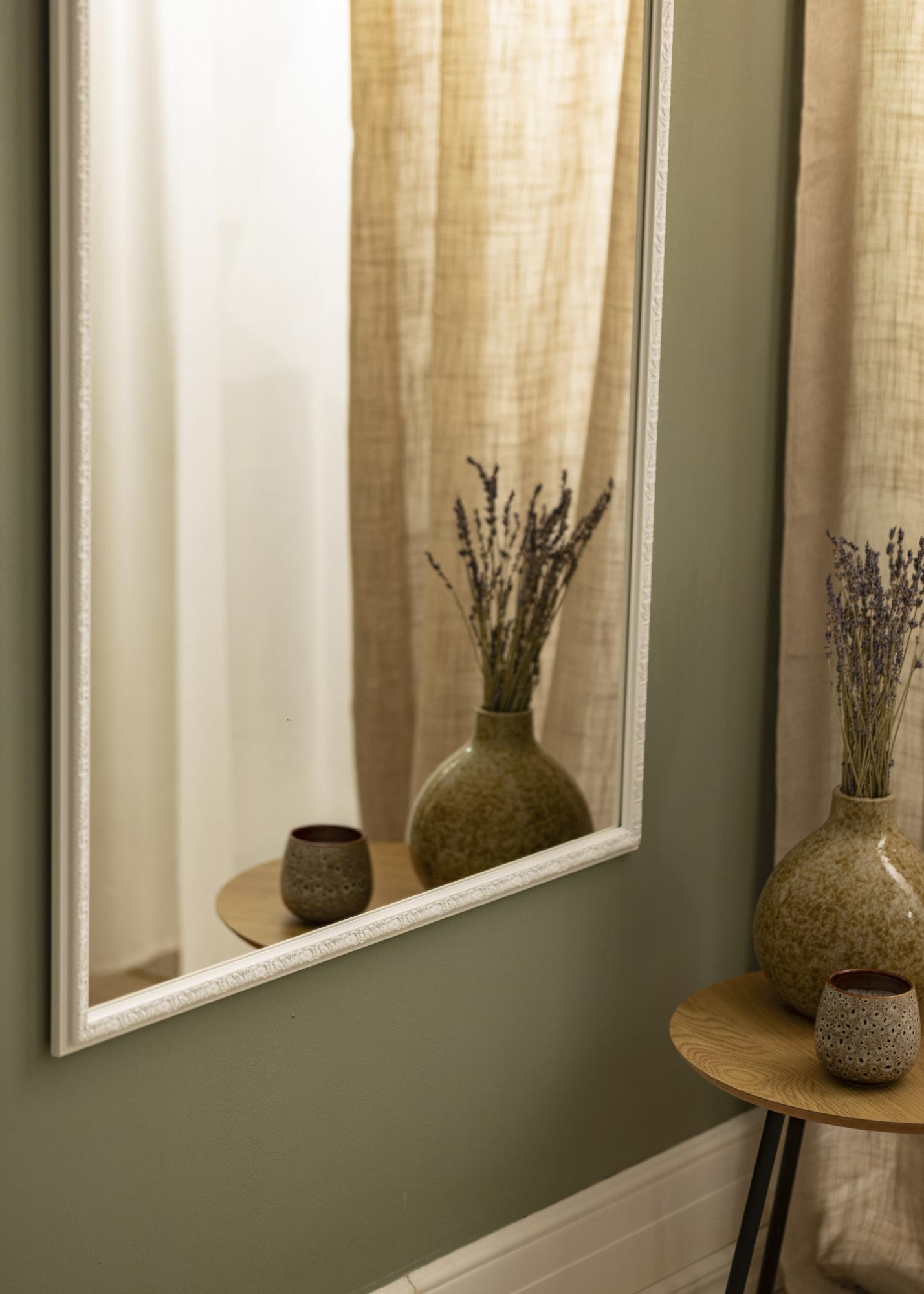Este espejo de pared es un elegante detalle decorativo que refleja hermosamente la luz de todas las fuentes de luz de la habitación. El marco blanco brinda una impresión clara y fresca, que se complementa perfectamente con el perfil decorativo y los hermosos patrones del marco.