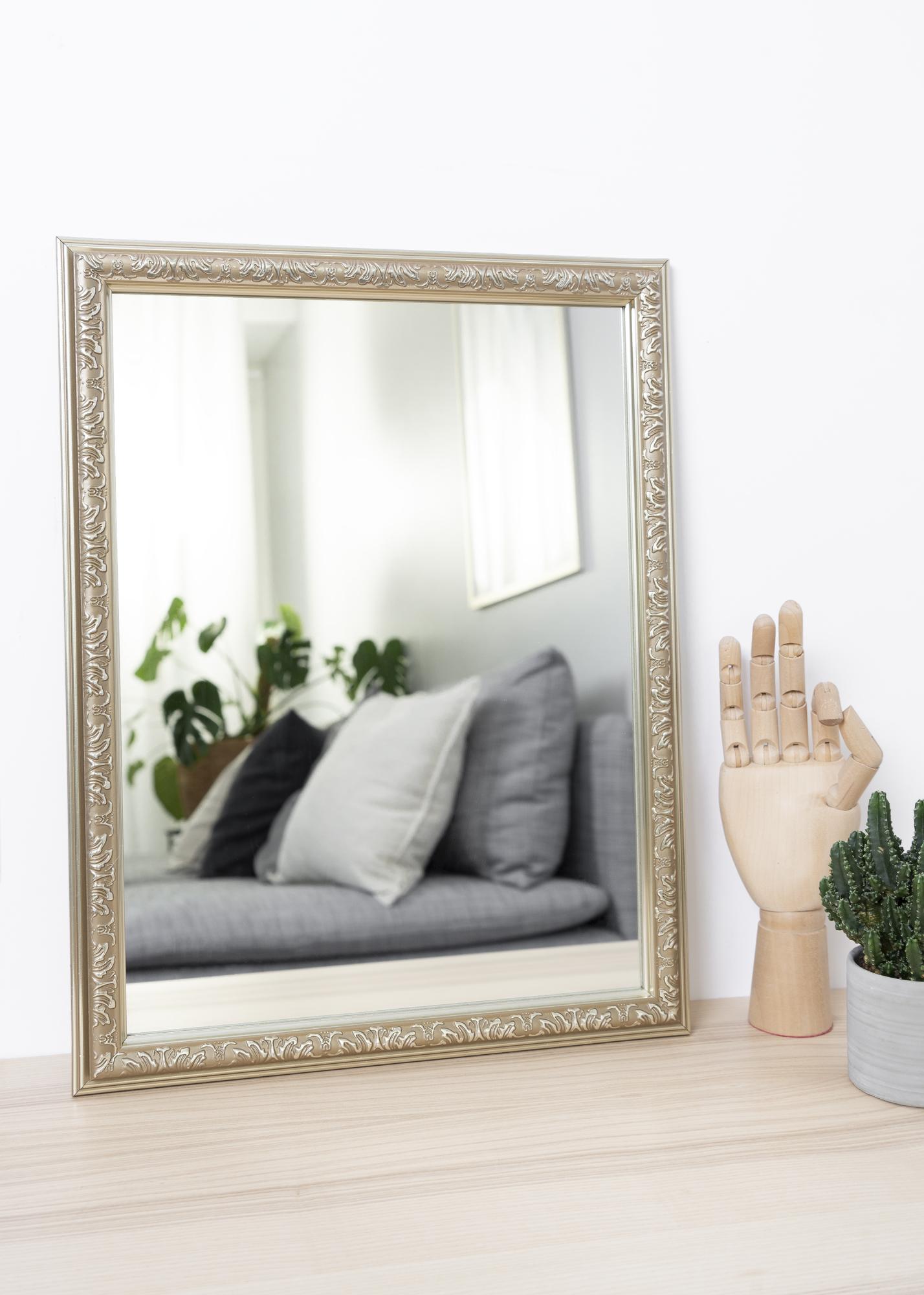 Deja que este espejo atemporal adorne las paredes de tu hogar. El marco plateado tiene un perfil único y está decorado con hermosos ornamentos. Su apariencia clásica lo convierte en una excelente adición para casi cualquier habitación, y se adapta tanto por sí solo como como un elemento interesante en la galería de pared.