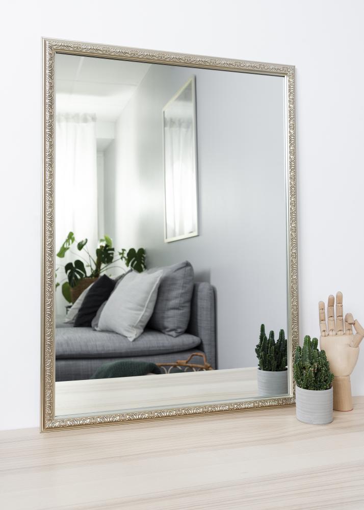 Deja que este espejo atemporal adorne las paredes de tu hogar. El marco plateado tiene un perfil único y está decorado con hermosos ornamentos. Su apariencia clásica lo convierte en una excelente adición para casi cualquier habitación, y se adapta tanto por sí solo como como un elemento interesante en la galería de pared.