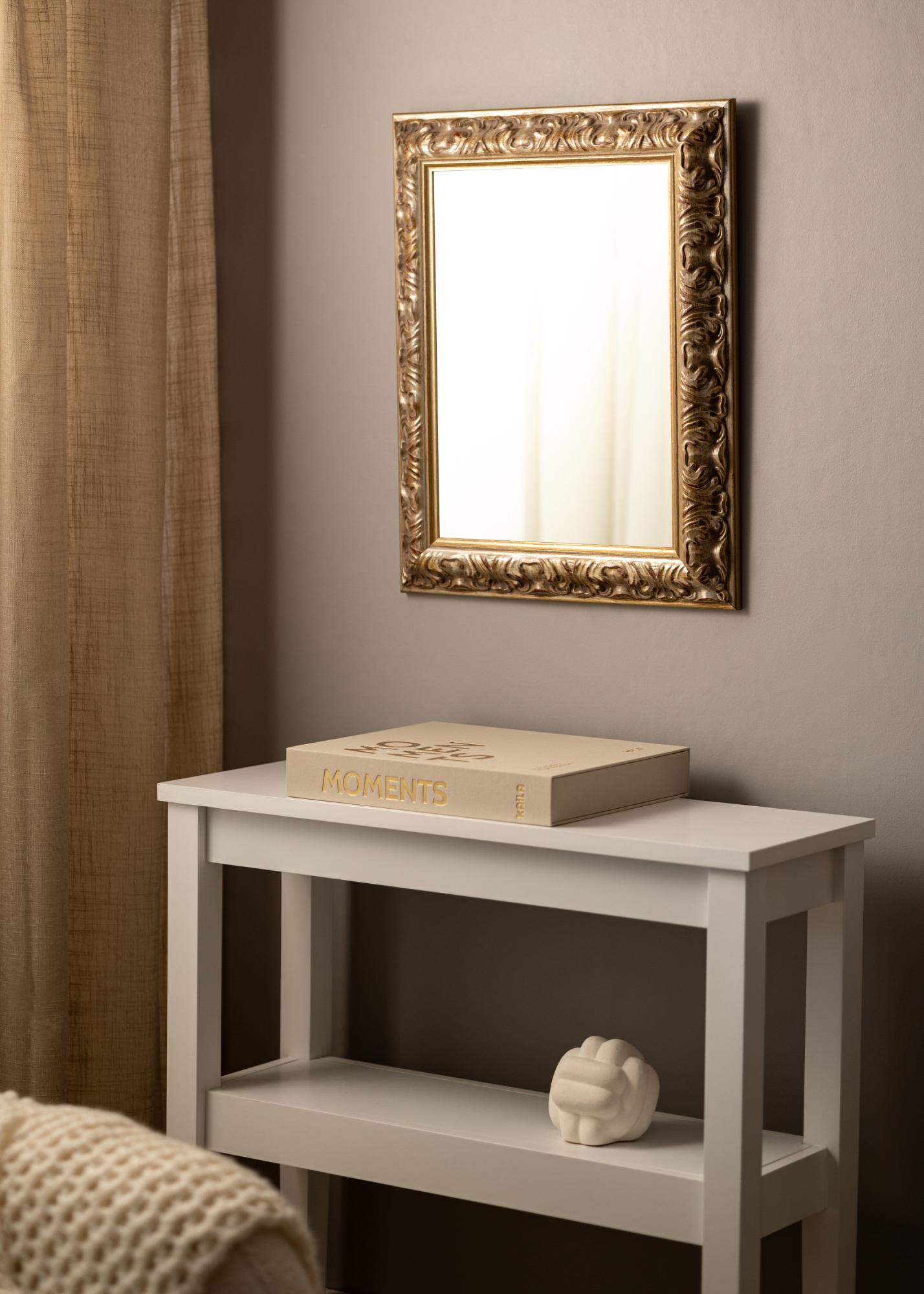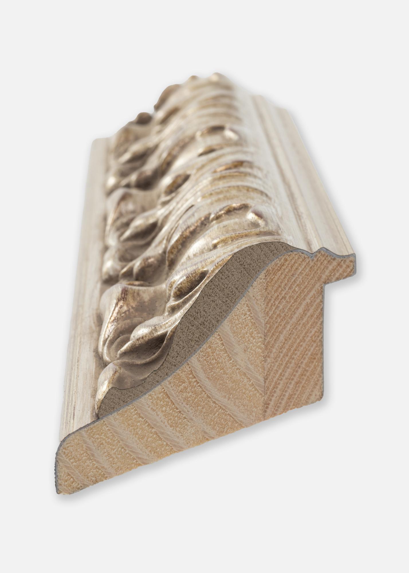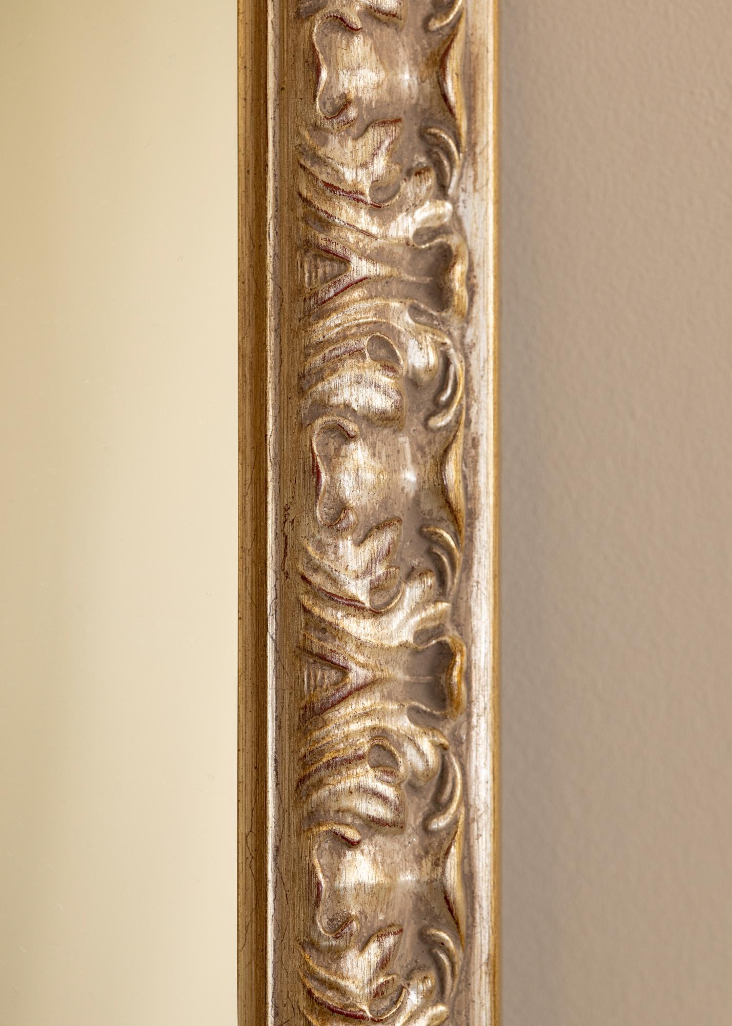 El marco está hecho de pino y tiene un acabado en plata antigua con detalles dorados sutiles y toques rojos. Esta combinación de colores crea un hermoso contraste y le da al espejo una expresión clásica y sofisticada. El aspecto decorativo hace que el espejo sea perfecto para enmarcar donde se busca una sensación elegante.