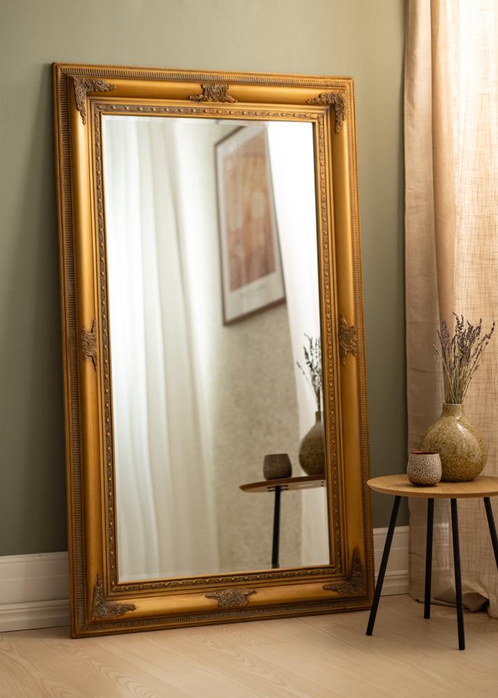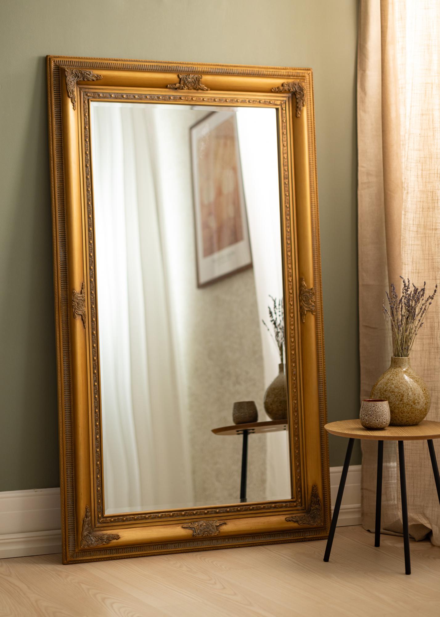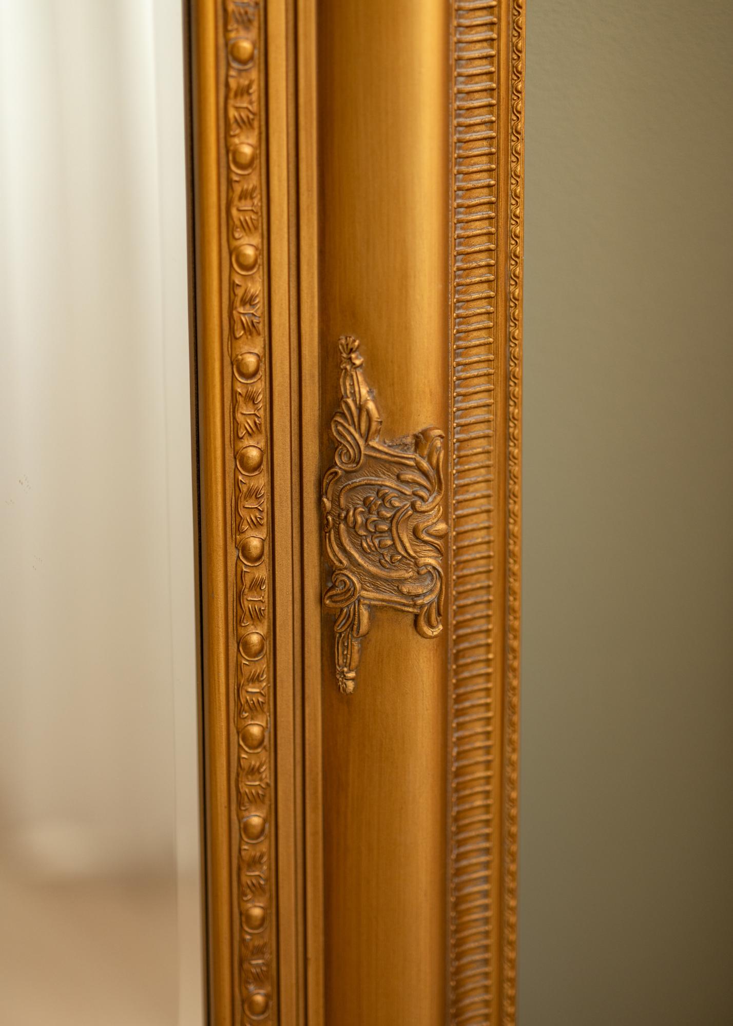 Espejo con un bonito perfil en color dorado con un aspecto antiguo, decorado con ornamentación floral. El estilo clásico del marco del espejo se adapta a estilos de decoración con muebles antiguos, pero también se puede utilizar para crear un contraste interesante en una decoración moderna y elegante. El espejo queda bonito colgado tanto en el recibidor, el dormitorio como en un vestidor y se realza de manera elegante junto con accesorios de decoración en latón o tonos dorados.